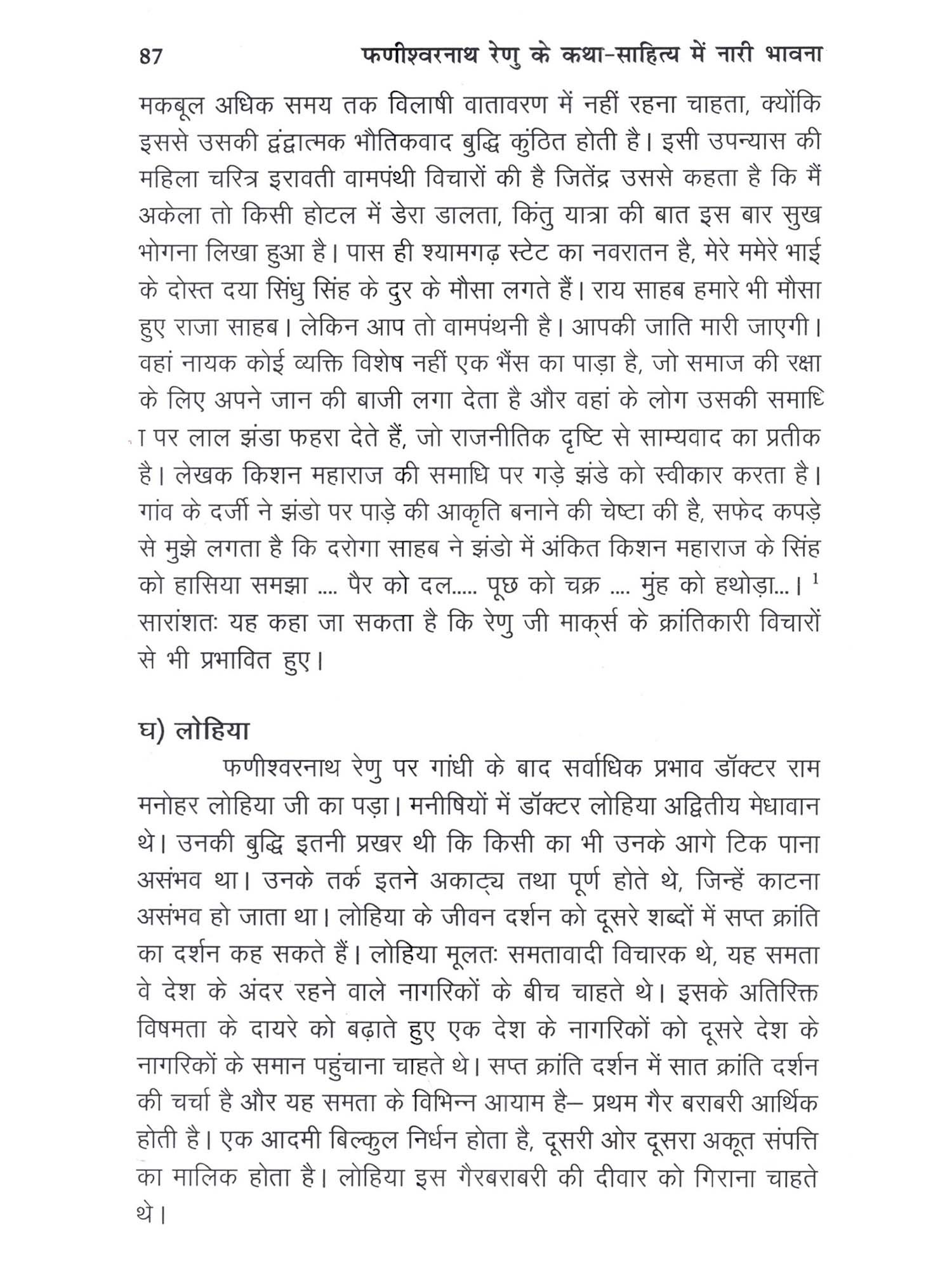 देश या समाज रूपी गाड़ी के दो पहिए होते हैं पुरुष और स्त्री। जब तक दोनों में सामंजस्य नहीं होगा तब तक देश या समाज आगे नहीं बढ़ सकता। किसी भी साहित्यकार का नारी संबंधी लेखन आधी आबादी का लेखन होता है इस दृष्टि से रचनाकार की नारी संबंधी सोच का अध्ययन अपने में महत्वपूर्ण है ।नारी ही वह कड़ी है जो परिवार के सदस्यों को और समाज के विभिन्न लोगों को आपस में जोड़ती है। वह बच्चों को केवल जन्म ही नहीं देती उसे संस्कार भी देती है। पुस्तक के आरंभ में वैदिक काल से लेकर आधुनिक काल तक की नारियों की पारिवारिक, सामाजिक दशा और जीवन मूल्यों की विस्तृत व्याख्या की गई है। फणीश्वर नाथ रेणु हिंदी के सर्वोत्कृष्ट कथाकारों में रहे हैं। बिहार जैसे पिछड़े राज्य के एक छोटे से गांव औराही हिंगना में जन्मे रेणु केवल बिहार में ही नहीं विश्व में भी विख्यात हुए।गांव की जिंदगी को उन्होंने बहुत ही करीब से देखा था ।यही कारण है कि उनकी रचनाओं में लोक जीवन उभर कर सामने आता है। रेणु जी का व्यक्तित्व और उनके जीवन उन पर विविध विचारकों गांधी, लोहिया मार्कुस, फ्रायड आदि का व्यापक प्रभाव पड़ा। अतः इन विचारों का अध्ययन भी समीचीन है। रेणु जी के कथा साहित्य में आए चरित्र कई दृष्टियों से बहुत आकर्षक, जीवंत और स्वाभाविक रहे हैं। जहां तक नारी चरित्र का प्रश्न है वह तो काफी वह वैविध्यपूर्ण और आकर्षणयुक्त रहे हैं। संबंध सापेक्षता की दृष्टि से भी ये अद्भुत है ।इन नारी चरित्र में अनूठी संबंध सापेक्षता है। वे एक साथ एकाधिक मानवीय संबंधों को निभाने की चुनौती को स्वीकार भी करती है और उन्हें निभाकर एक आदर्श भी प्रस्तुत करती है। रेणु जी के इन नारी चरित्र यथा मां बहन बेटी, पत्नी, प्रेयसी और सखा आदि रूपों के अध्ययन से नारी मनोविज्ञान को समझा जा सकता है। अतः रेणु जी के कथा साहित्य में वर्णित नारी भावना का अध्ययन न केवल उसमे वर्णित समाज और संस्कृति का अध्ययन है बल्कि रेणु जी के नारी विषयक दृष्टिकोण को समझने का उपयुक्त साधन भी है।