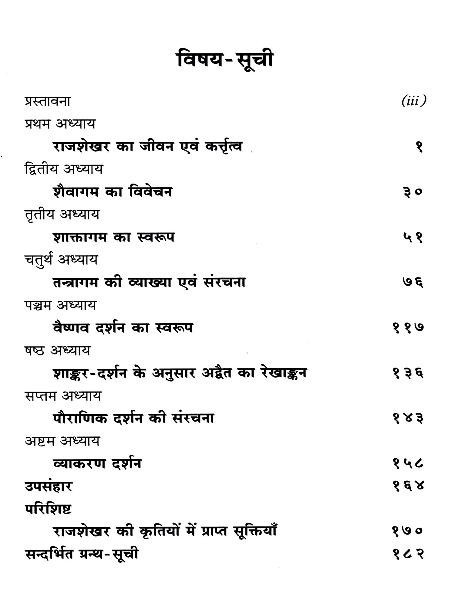 आचार्य राजशेखर की कालावधि में समस्त आगमिक दर्शन अपने चरमोत्कर्ष पर थे। कवि ने अपनी विविध रचनाओं में इनका उल्लेख प्रस्तुत किया है। अतः यह शाश्वत सत्य है कि मानव जीवन का प्रत्येक पक्ष चाहे वह ज्ञानपक्ष हो अथवा क्रियापक्ष, प्रत्यक्ष या परोक्ष रूप में दर्शन से प्रभावित है। विविध कालक्रम में यह धारण परिवर्तित होती रहती है, क्योंकि यही सृष्टिचक्र का नियम है और कोई भी मानवजाति इसके प्रभाव से अछूती नहीं रह सकती है। विभिन्न दार्शनिक सम्प्रदायों के उद्भूत होने पर उनके भिन्न-भिन्न सिद्धान्त, प्रणाली आदि विकसित होते रहते हैं, किन्तु सभी सम्प्रदायों का परम लक्ष्य ब्रह्मानन्द की अनुभूति होता है। मार्गों में भिन्नता होते हुए भी लक्ष्य एक ही है।