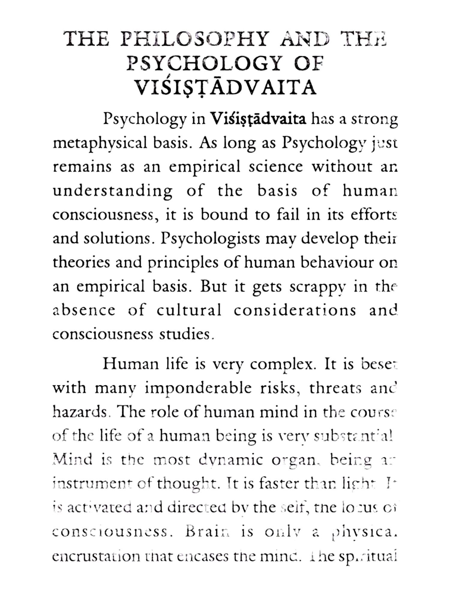 As we are very well aware of the legacy of Sri Ramanujacharya that enshrines the wisdom of Samskrit along with devotion of Tamil. The Philosophy and the Psychology of Visistadvaita' is an outcome of the extract prepared by the erudite author from the treatment of Sri Ramanuja on 'Upanishads'. The essential nature of Sri Ramanuja's school of thought is succinctly rendered here. I hope our keen readers would certainly enjoy such sweet syrup nicely prepared. I also take this opportunity to thank one and all who continue to contribute in different capacities to make this noble mission a real success.