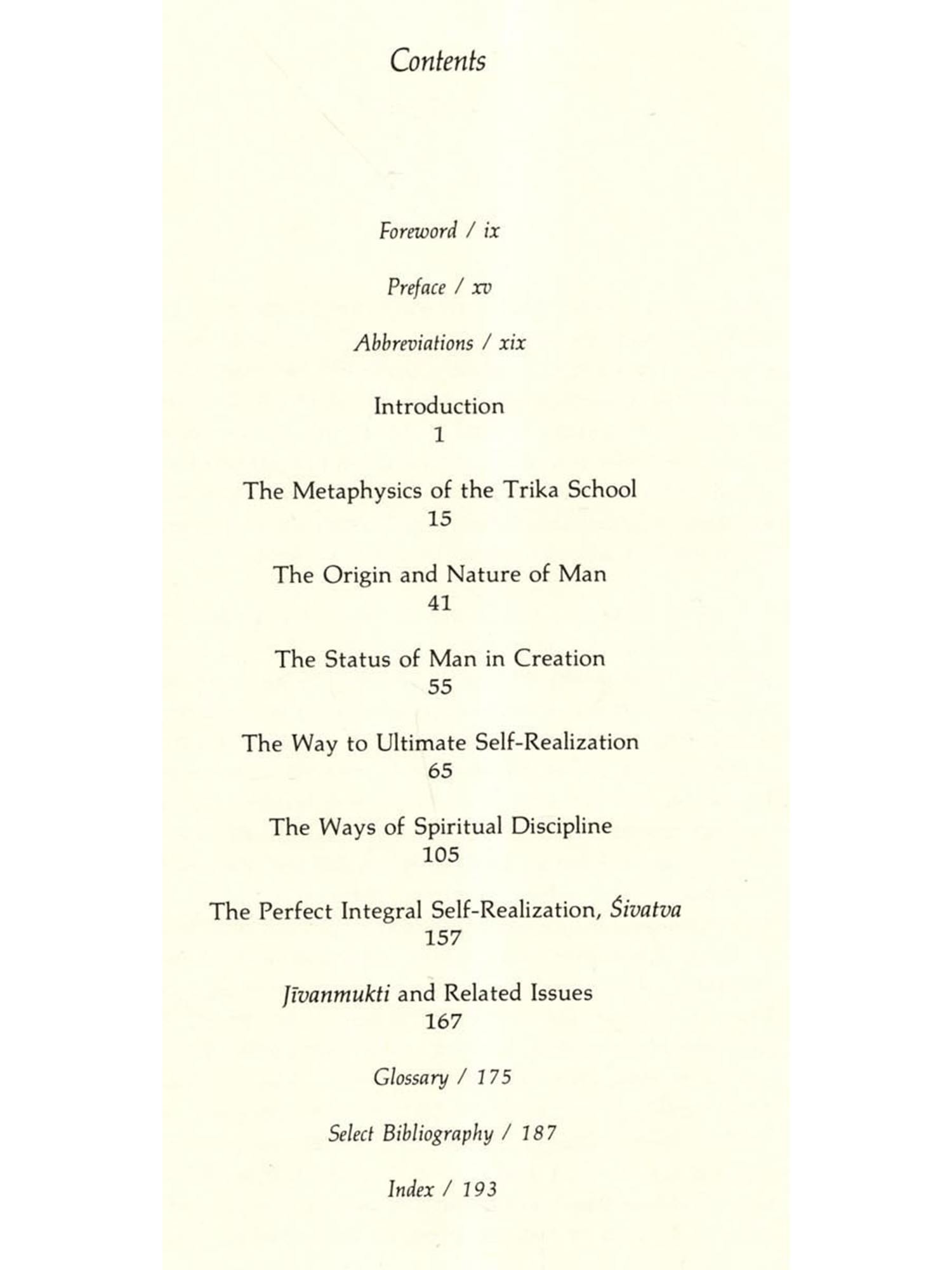 My study is divided into seven chapters. The first chapter gives an outline of the metaphysics of the system relevant to the understanding of the nature of man and of his present condition in the worldly existence. Advocating a purely monistic system of the thought, the Trika school postulates the existence of one Ultimate Reality, called Parama Siva, who pervades and permeates the entire cosmos as the cosmic Reality and yet, at the same time, transcends it as the Absolute Being. Exercising his divine Sakti, he assumes self-contraction (sankoca) out of his free will (Iccha) and reveals himself as the world consisting of thirty-six levels of creation in which he assumes different roles as the limited experience (pramata), the objects of experience (prameya), and so forth.