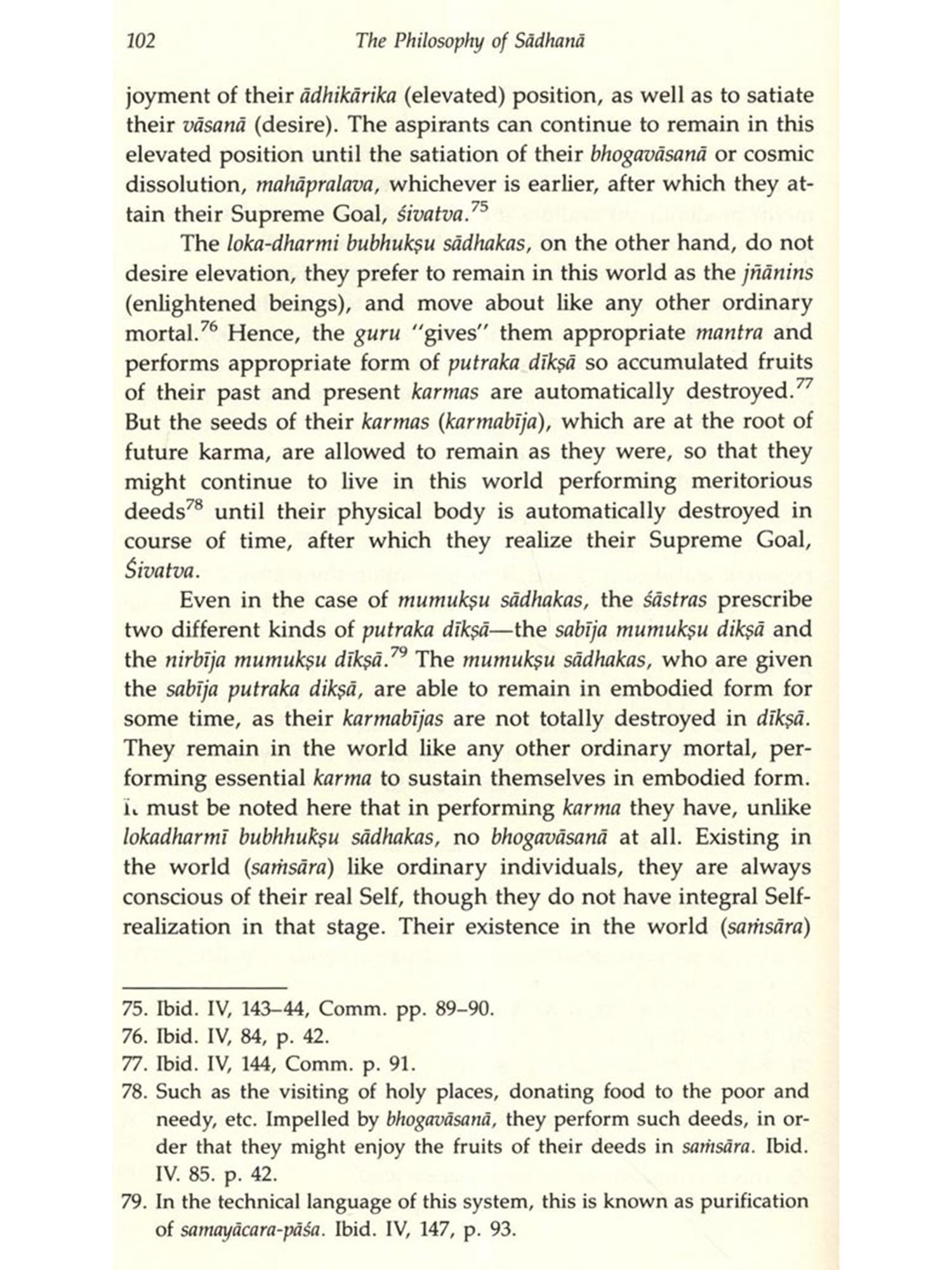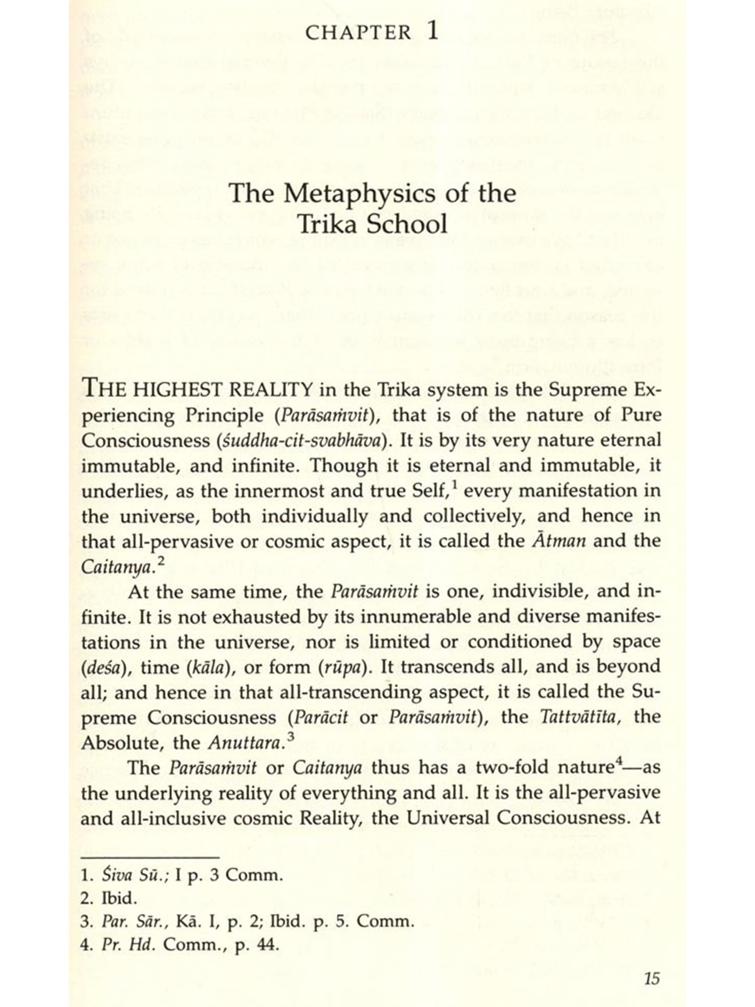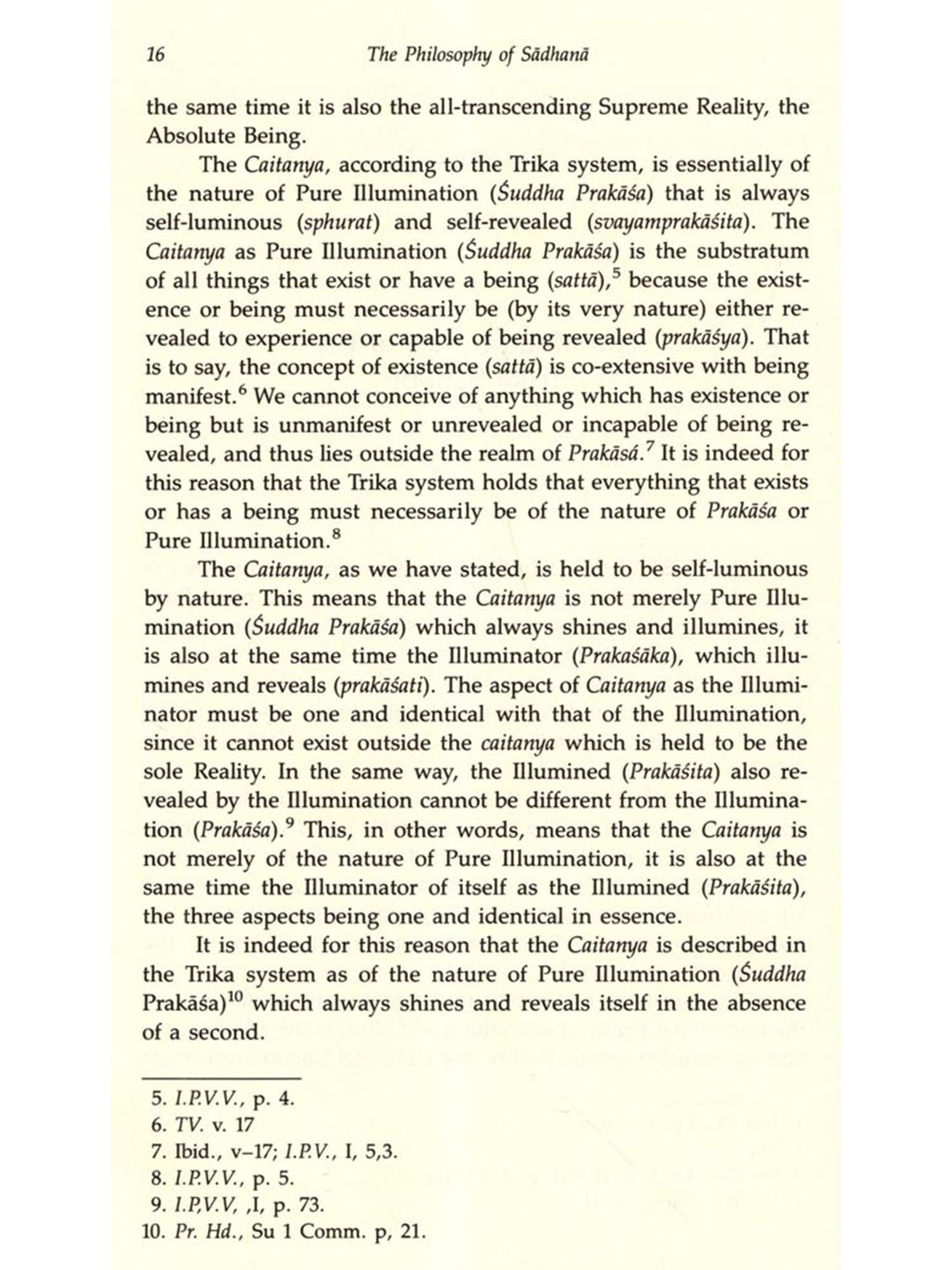 I have made a critical examination of the philosophy of sadhana as presented mainly in the Sanskrit texts of the Trika school, especially those of Abhinavagupta in which the sadhand aspect occupies a prominent place. I am conscious of the fact that the aspect of sadhana in general and in the Trika texts in particular is, by its very nature, abstruse and is also garbed in secrecy, and that only those spiritual seekers who have been bestowed with divine grace by the teacher and are actually on the way to spiritual realization are capable of knowing the profound mysteries that the subject involves. Nevertheless I have attempted, despite my limitations, to understand the problem intellectually and to decipher whatever I could from the published texts. How far I have been successful in my attempt, I leave it to my readers to judge.