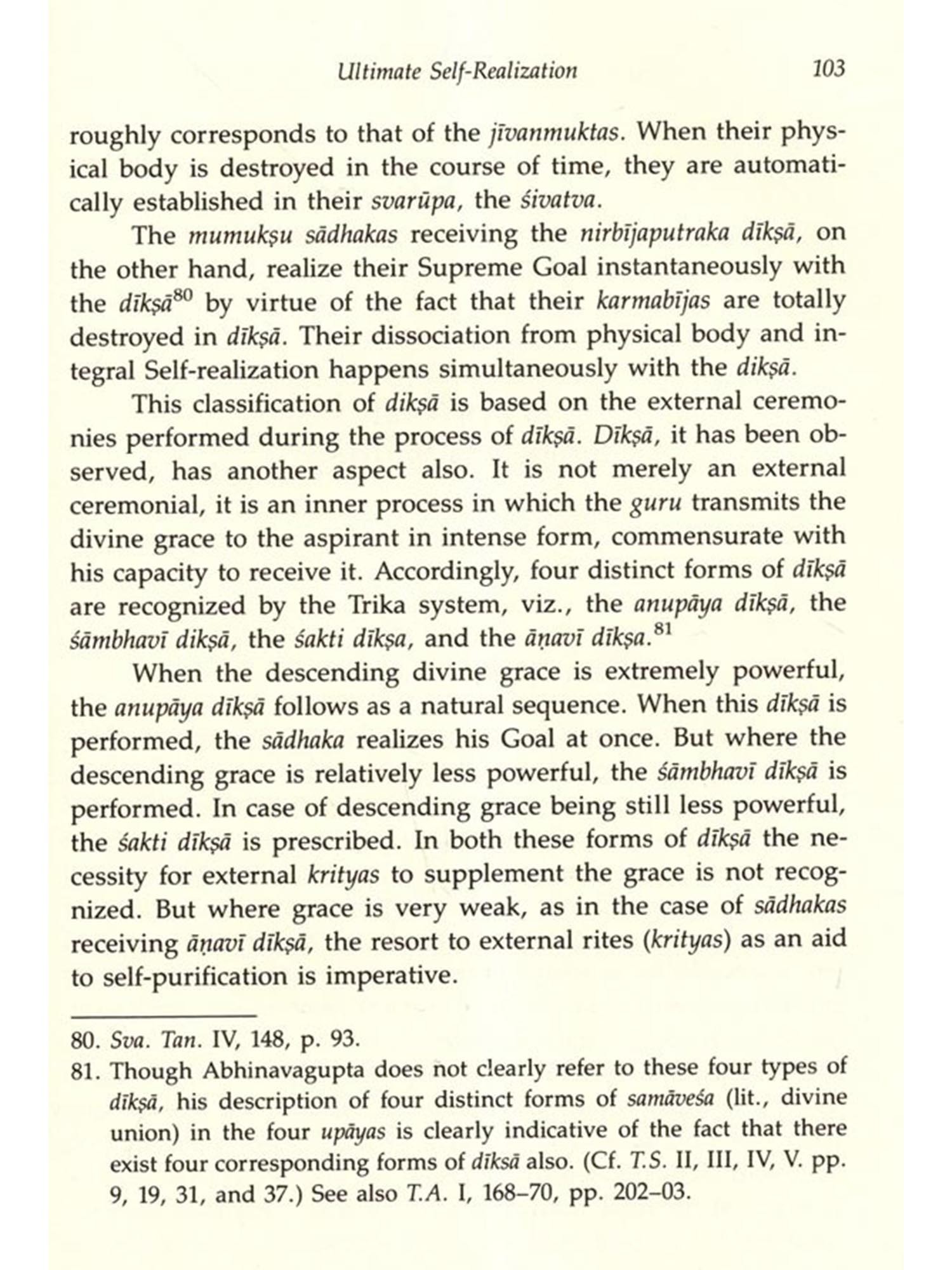 The fourth chapter, entitled "The Way to Ultimate Self-Realization," is divided into three sections. The first deals with such topics as the role of different types of defilements (malas) which prevent man from getting a glimpse of his real Self and the various means to overcome them. The second section deals with divine grace (saktipata), a crucial factor in spiritual discipline. The third section examines the concepts of guru (teacher) and diksa (spiritual initiation), important ingredients of spiritual discipline as envisaged by the system. The fifth chapter, entitled "The Ways of Spiritual Discipline," is divided into five sections discussing different kinds of spiritual aspirants (sadhakas) and the four recognized ways of spiritual discipline (upayas) called anupaya, sambhava upaya, sakta upaya, and anava upaya, which are prescribed for as many kinds of aspirants. The anava upaya prescribed for aspirants receiving grace in very mild form is of great importance to ordinary human beings who are incapable of adopting other upayas. This section has been revised and enlarged. Although other schools of Indian philosophical tradition also recognize the necessity for prescribing different ways of sadhana in conformity with the varying temperaments of spiritual aspirants, the Trika texts make these distinctions according to the difference in the intensity of the di-vine grace received by the aspirants.