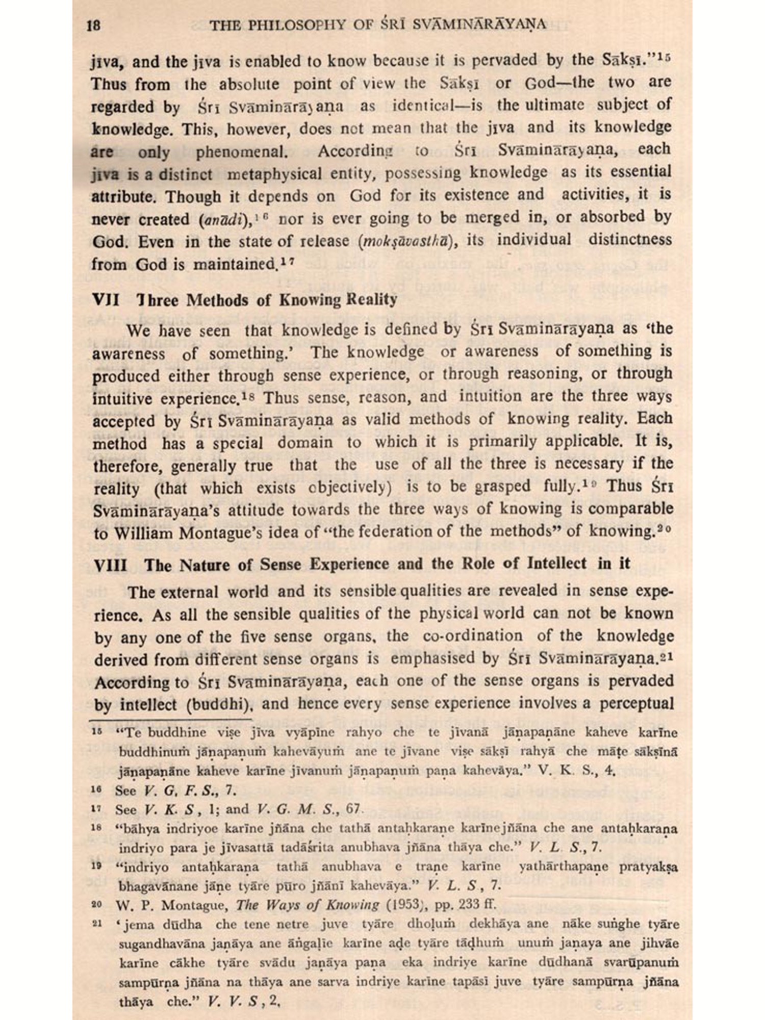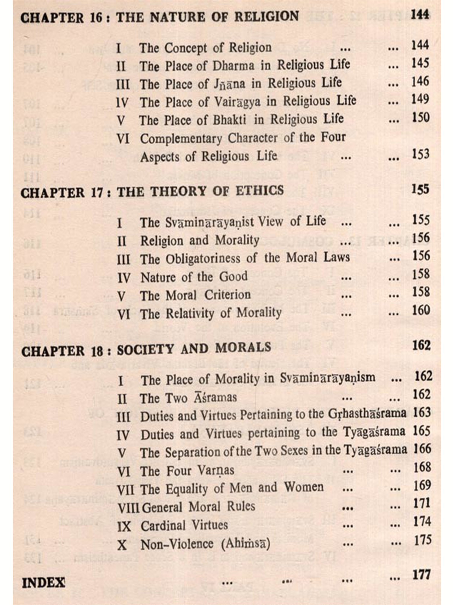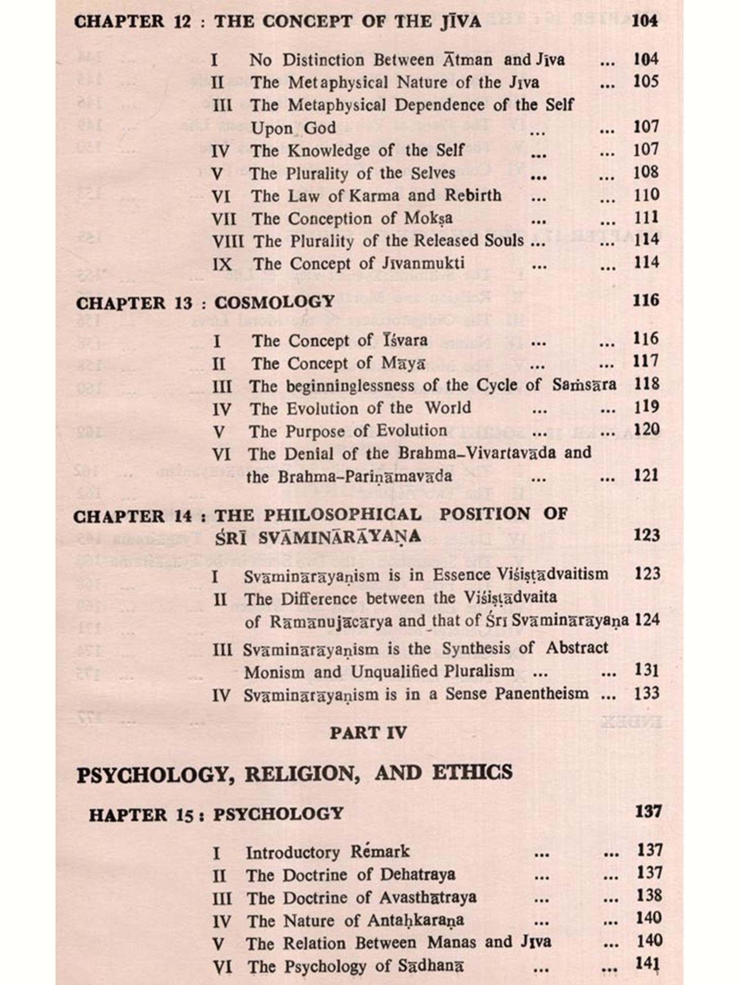 I have divided the study of Svaminarayanism into four parts. Part I consisting of only the first chapter is meant for the general introduction. Part II comprising three chapters (chapters two to four) deals with the epistemological principles of Sri Svaminarayana. Part III consisting of ten chapters (chapters five to fourteen) is concerned with the study of the ontological categories of Svaminarayanism and attempts to determine the philosophical position of Sri Svaminarayana. Part IV which contains four chapters (chapters fifteen to eighteen) tries to expound Sri Svaminarayana's views regarding the psychology of the jiva, nature of religion, the theory of ethics, and the problems of society and morals.