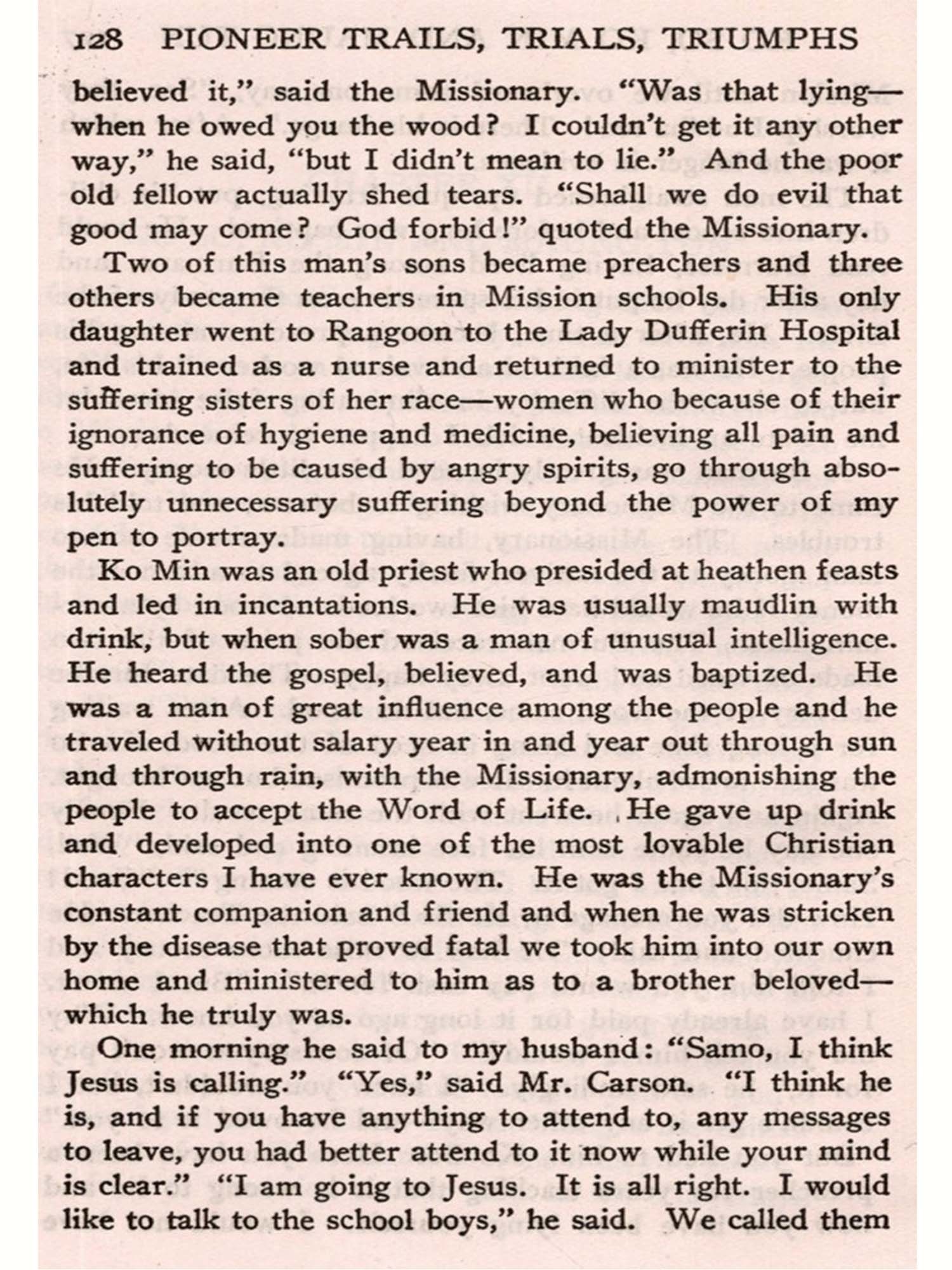 Three years later she was married at Bassein to Rev. Arthur E. Carson, who had then just arrived from America under appointment by the American Baptist Missionary Union and designated for work among the Chins, being the first missionary sent to that people. After substituting for one year in Prome, while the missionary regularly assigned to that station was away on furlough, Mr. and Mrs. Carson established the first Chin Mission at Thayetmyo near the border between lower and upper Burma.
