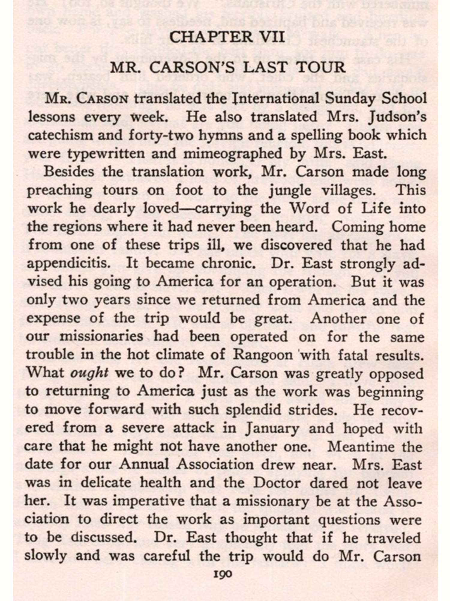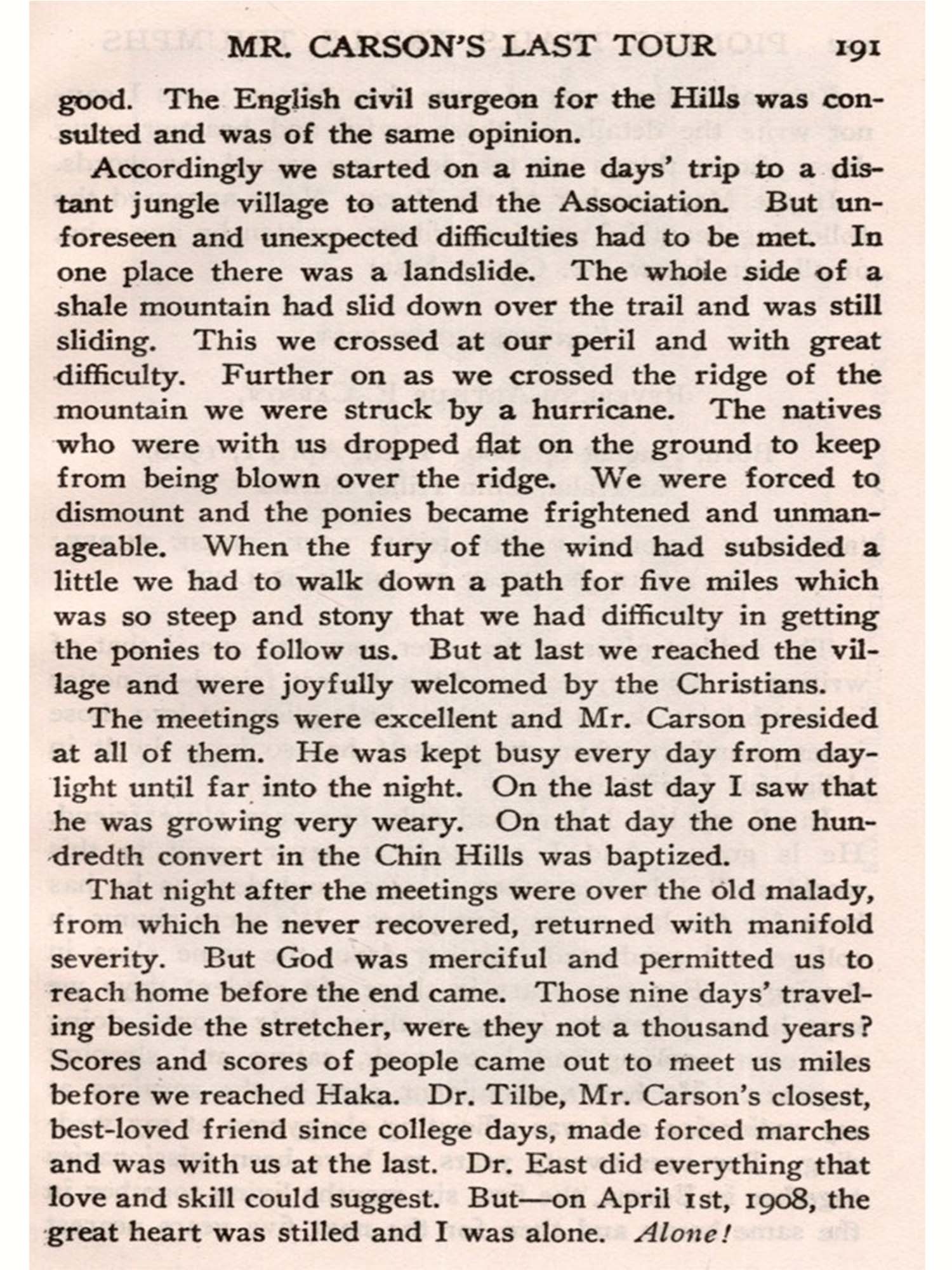 After that furlough the Foreign Mission Board in response to the challenge of still more remote tribes of Chins, in the depths of paganism and degradation, un reached and untouched by any Christian message or in-fluence, authorized the Carsons to advance the frontier of Christian work and influence back into the almost inaccessible hills of Upper Burma and establish a Mission among the semi-savage Chin tribes there.