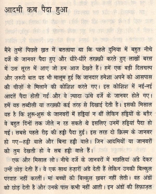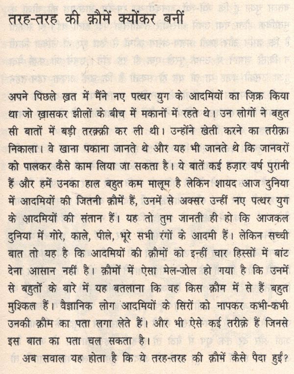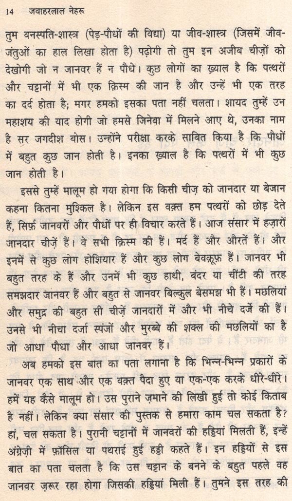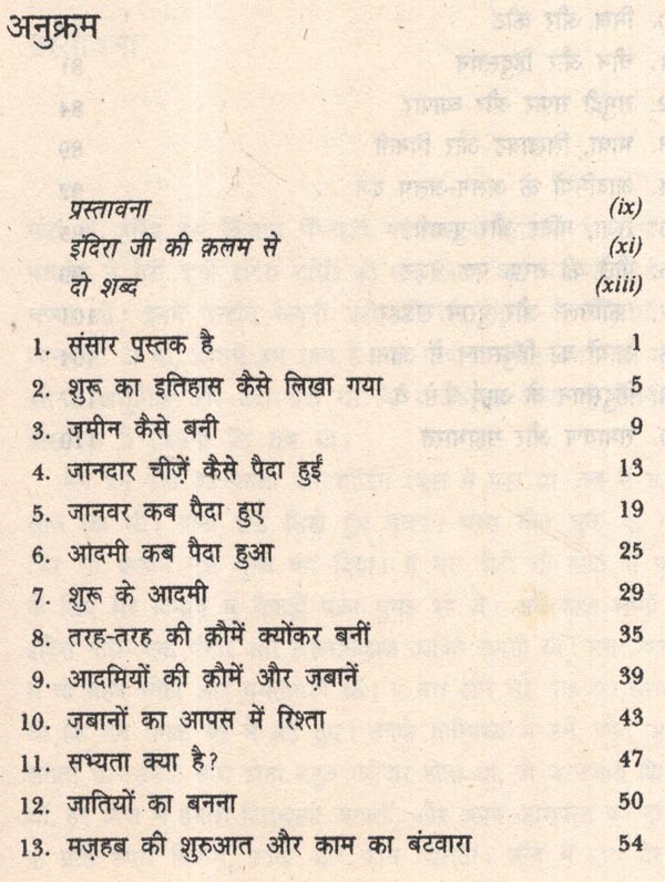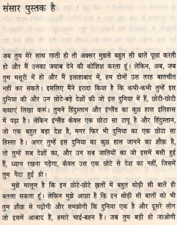 मुझे आशा है कि ये पुस्तक आपको 'प्रकृति की पुस्तक' को पढ़ने में मददगार साबित होगी, जोकि आश्चर्यजनक कहानियों से अटी पड़ी है, और आपको इस विषय में जवाहरलाल नेहरू के विचारों से प्रेरित करेगी कि वो क्या चीज़ है जो किसी देश और उसके वासियों को महान बनाती है। साथ ही मुझ ये भी आशा है कि आपको भी पिता के पत्र पढ़कर उतना ही आनंद आएगा, जितना मुझे इसे पढ़ने में आया था।