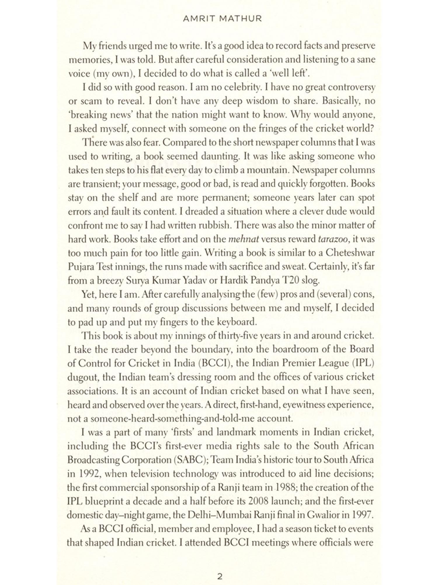 On the many tours and cricket seasons in India and abroad, Mathur kept a diary and detailed notes on the day's play, as well as of conversations and events off the pitch. He builds on these to show us what happened behind the scenes, allowing us to experience the excitement of play on the ground, as well as dressing-room conversations, team meetings and discussions.