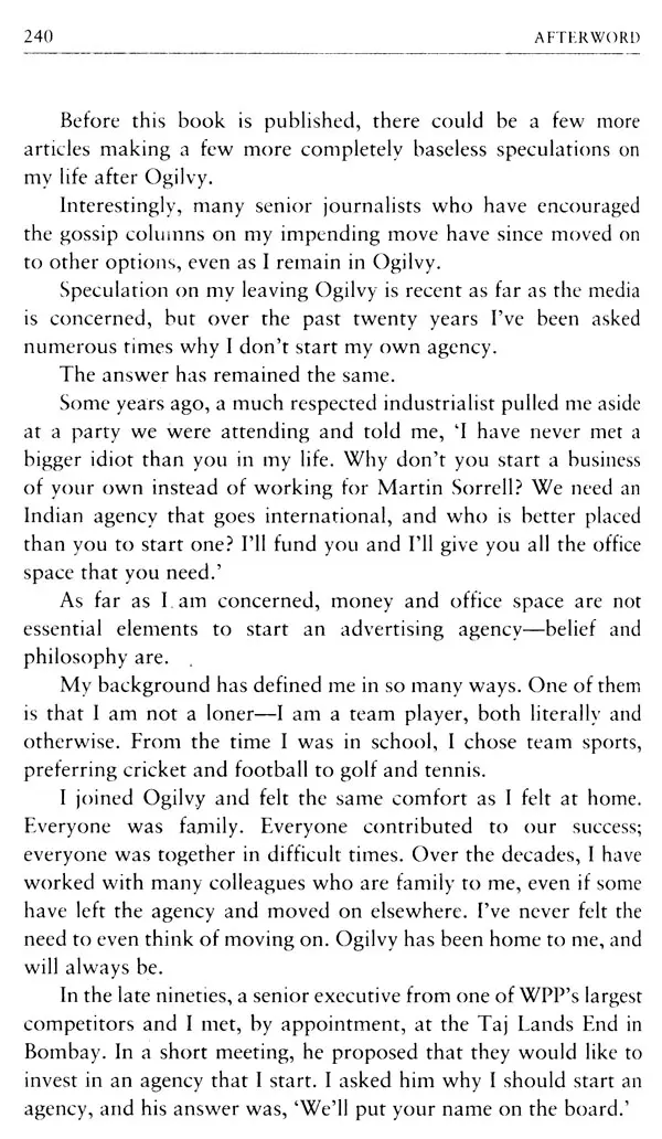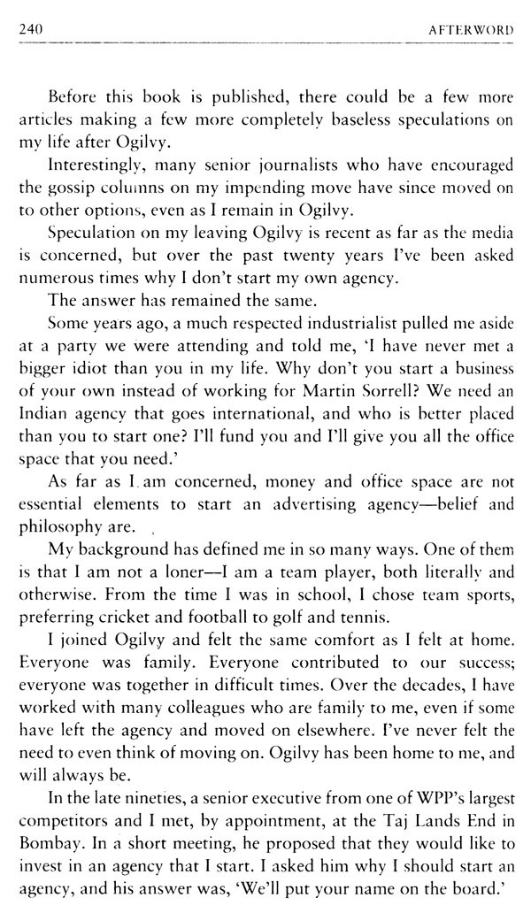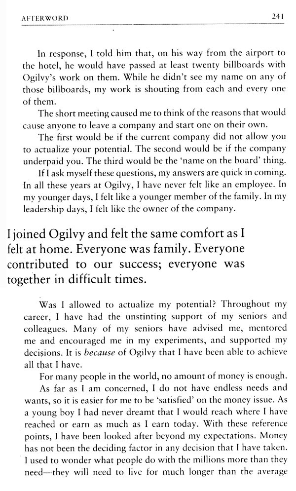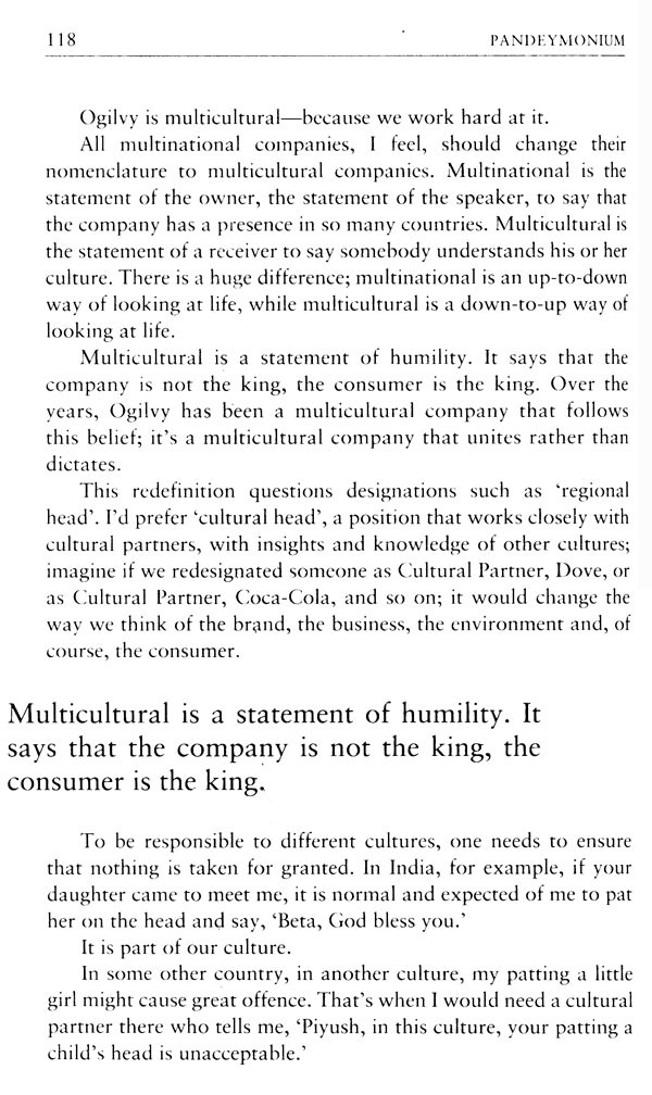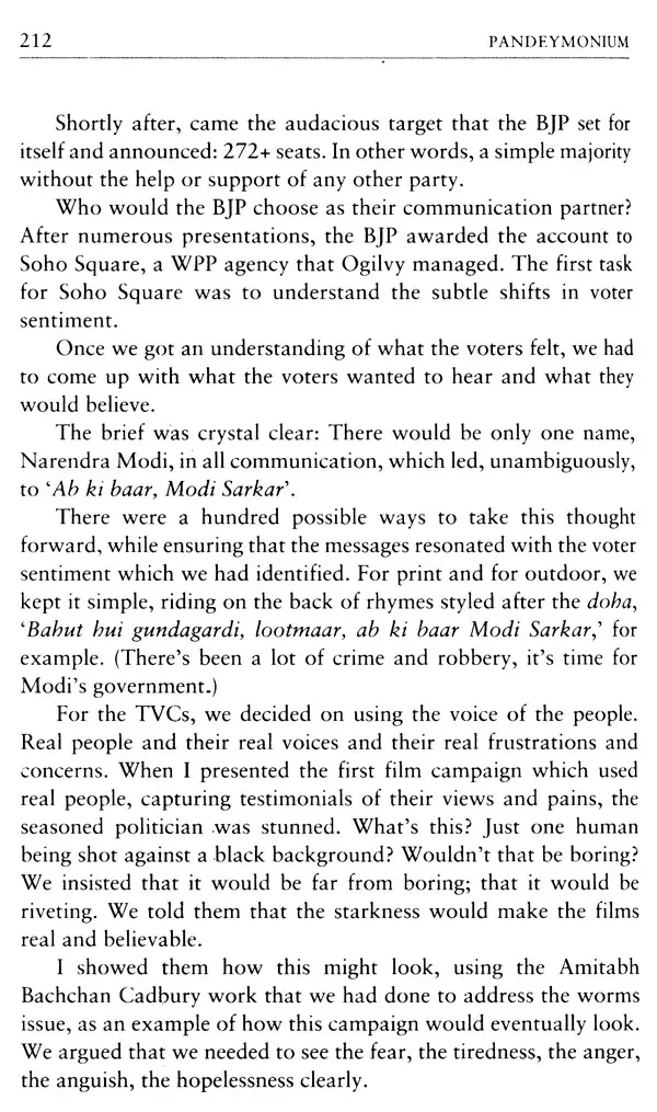 Those just getting into the business will find a step-by-step guide in here to every aspect of advertising. For those already in this line, the book will not only make you laugh and cry, but help you pick up tips and reminders that may make you an even better creative professional. It is a vivid memoir of Piyush Pandey, which, you will concur in time, is a gem meant to be placed on the Ogilvy bookshelf.