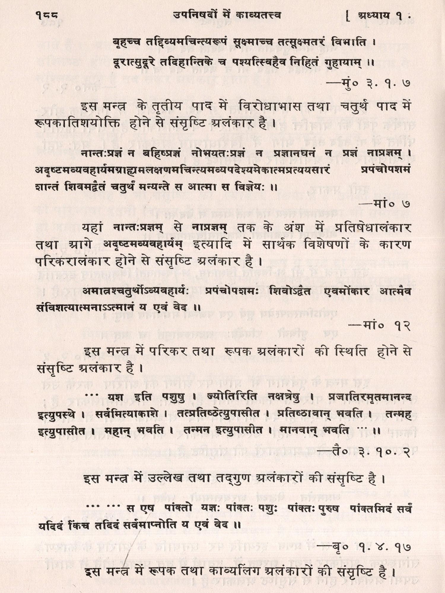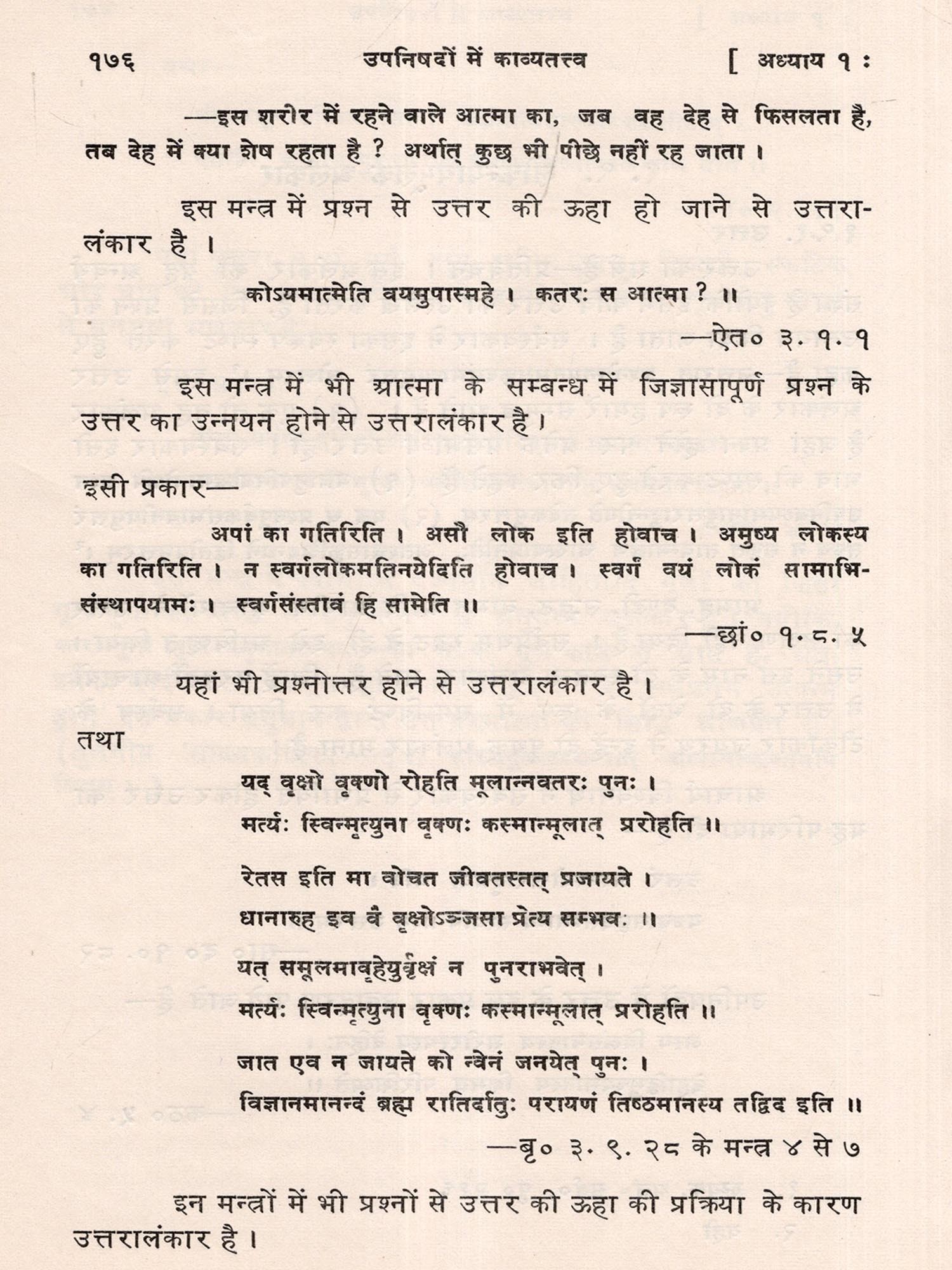 It is quite a painstaking work to sift and select from the ancient Upanisads passages answering precisely to the definitions of the different Alankaras as distinguished very much in later Alan-kara works. The author may well be congratulated for the analysis and presentation of the material and contributing to the enjoyment of the literary side of a literature which had been held in esteem all over the world as the highest peak of Indian Philosophy.