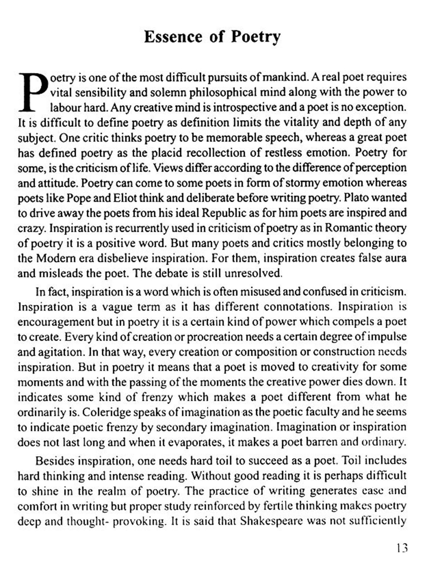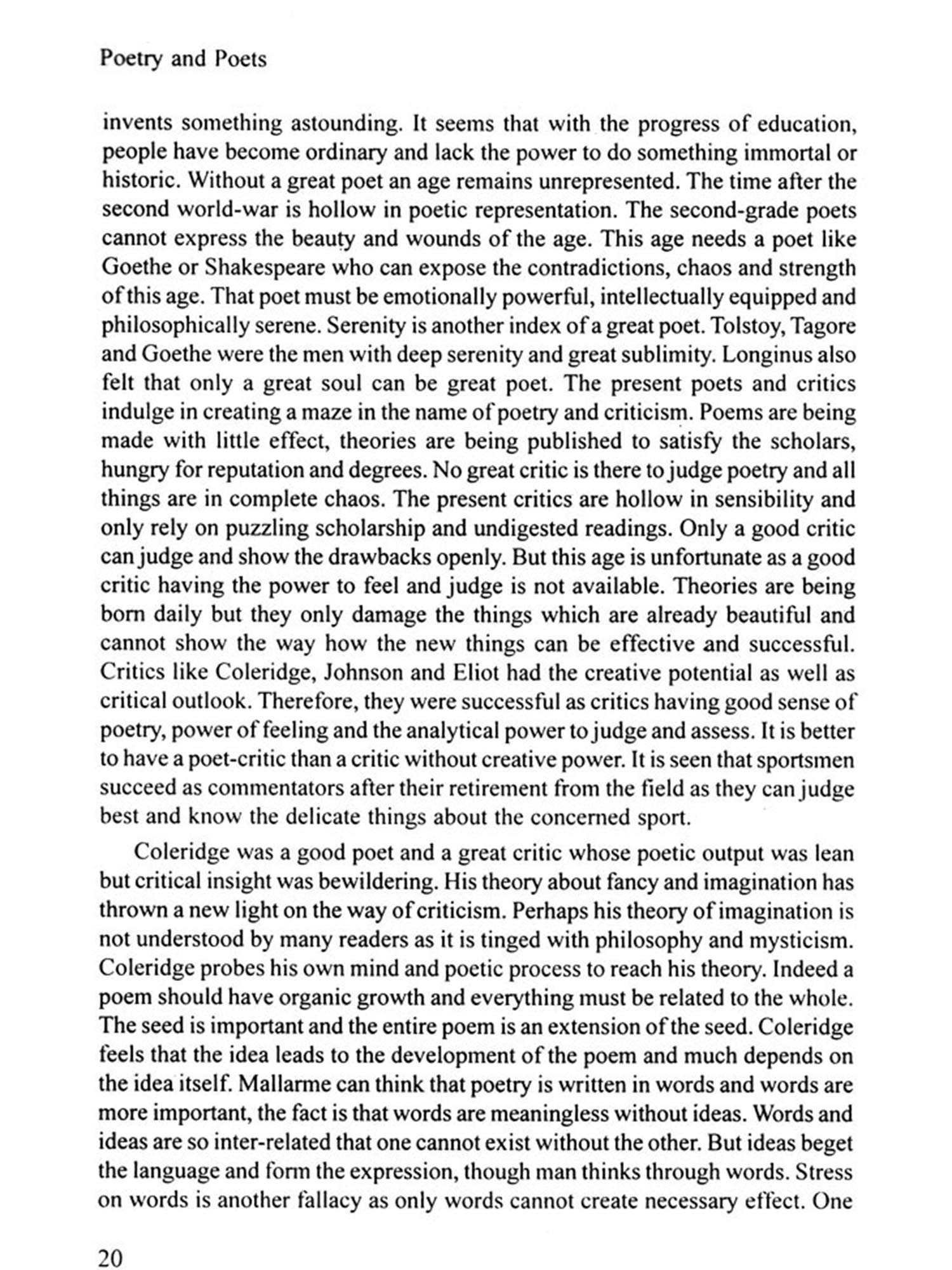 At present, poetry is a neglected art. People hardly read poetry. They are easily attached to newspapers and glossy magazines. On the other hand, the scholars at colleges and universities are more concerned with theories than with poetry. Theories are really deceptive and they create enormous chaos in the field of criticism. Fresh perception is more important than stale theories. Literature is linked with life and language is the medium of expression. So a reader must be perceptive, sensitive and inquisive to realise literature or poetry. The fact is that we read A.C. Bradley but mercilessly neglect Shakespeare. The core literature is being neglected. The situation should change. The scholars ('Pseudo-scholars' as E.M. Forster calls them) need to build their careers. So, they resort to theories and frame rules to assess poetry. Poetry is beyond rules. It is the artistic and philosophical expression of human soul which feels, perceives and realizes the world in its own way. The indian philosophers have always insisted on the suggestive power of poetry which virtually suggests and transcends. Poetry being subjective is the expression of sensitive mind which responds and reacts, feels and thinks. The western thinkers and the Indian scholars have revealed their views about poetry. Their views are significant. They have expressed their views and thoughts but they did not formulate theories. In present days, it has become the humour of the scholars to apply theories to literary works. As a result, real literature remains ignored, but theories thrive and they drive away literary activities. It is found that most of the scholars are obsessed with theories. They use it with uncanny pride and unusual arrogance. Unless a particular theory is applied to a particular literary work, they cannot take rest. These scholars are prejudiced, lifeless and devitalised. Real literature is born in freedom and only a free and unprejudiced mind can assess literature truly. Human life is bigger than man-made philosophy and it appears that art or literature is larger than theories which are born in the dry bones of the scholars. These scholars are biased in spirit and blind to life which unfolds layers and meanings, beyond human comprehension, beyond scholarly theorisation. In the present book, I have tried to freely discuss the things related to poetry. I have no compulsion, no obligation. Freely I have roamed in the realm of poetry to unearth truth, beauty and significance of poetry in general and some poems or poets in particular.