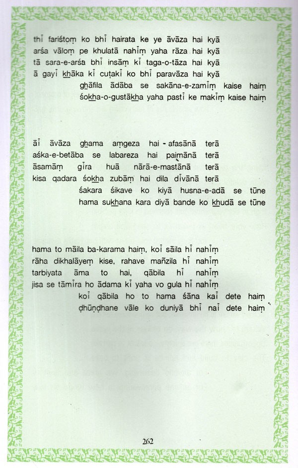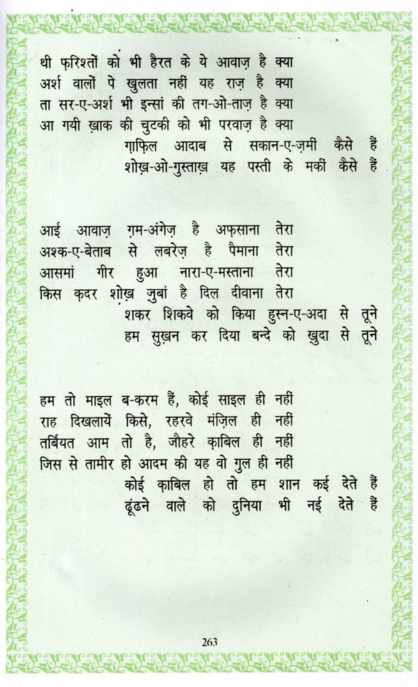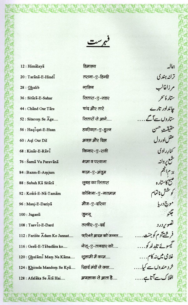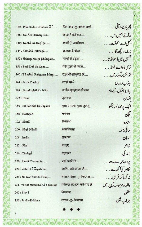 The present collection is a representative of Iqbal's Urdu poetry, which has been transliteration into English verses, with translation into Devanagari (Hindi) and Roman script. The English translation has been done by Khwaja Tariq Mahmood, who earlier translated the poems of Mirza Ghalib and Sahir Ludhianvi, and is now working on many other collections.
