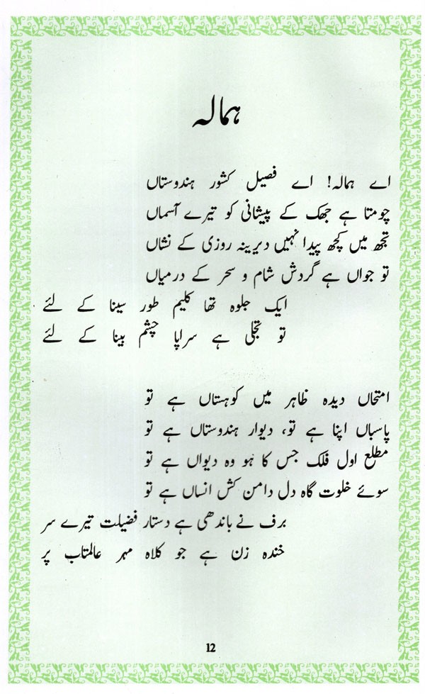 SIR MOHAMMAD IQBAL also known as Allama Iqbal, is a great name in Urdu and Persian (Farsi) literature. He wrote his poetry in Urdu and Farsi (1873-1938), and that bridged and encompassed the past many centuries of man's endeavours in the realms of thought and intuition. He emblazoned the high standards set by Mirza Asadullah Khan 'Ghalib', and glorified the literature in his own way. He was a scholarly personality, and wrote on various subjects, from philosophy to politics, from romance to emotions and so on. He wrote world famous poem 'sare jahan se acha Hindustan hamara' and many other such 'nazams' which are even today considered as great poetical creations. He was honoured with the title 'sir' by the British Government for his contributions to the literature.
