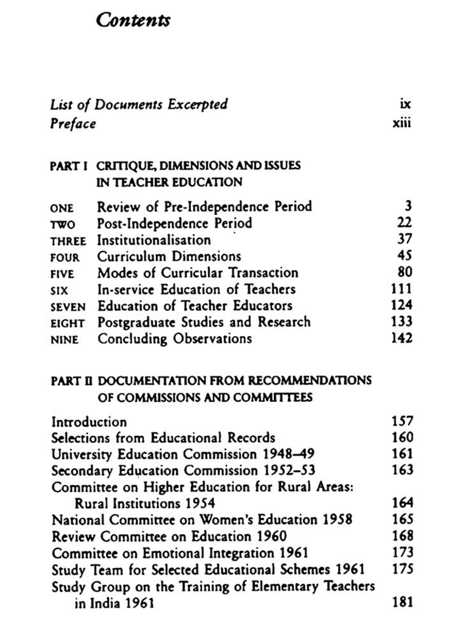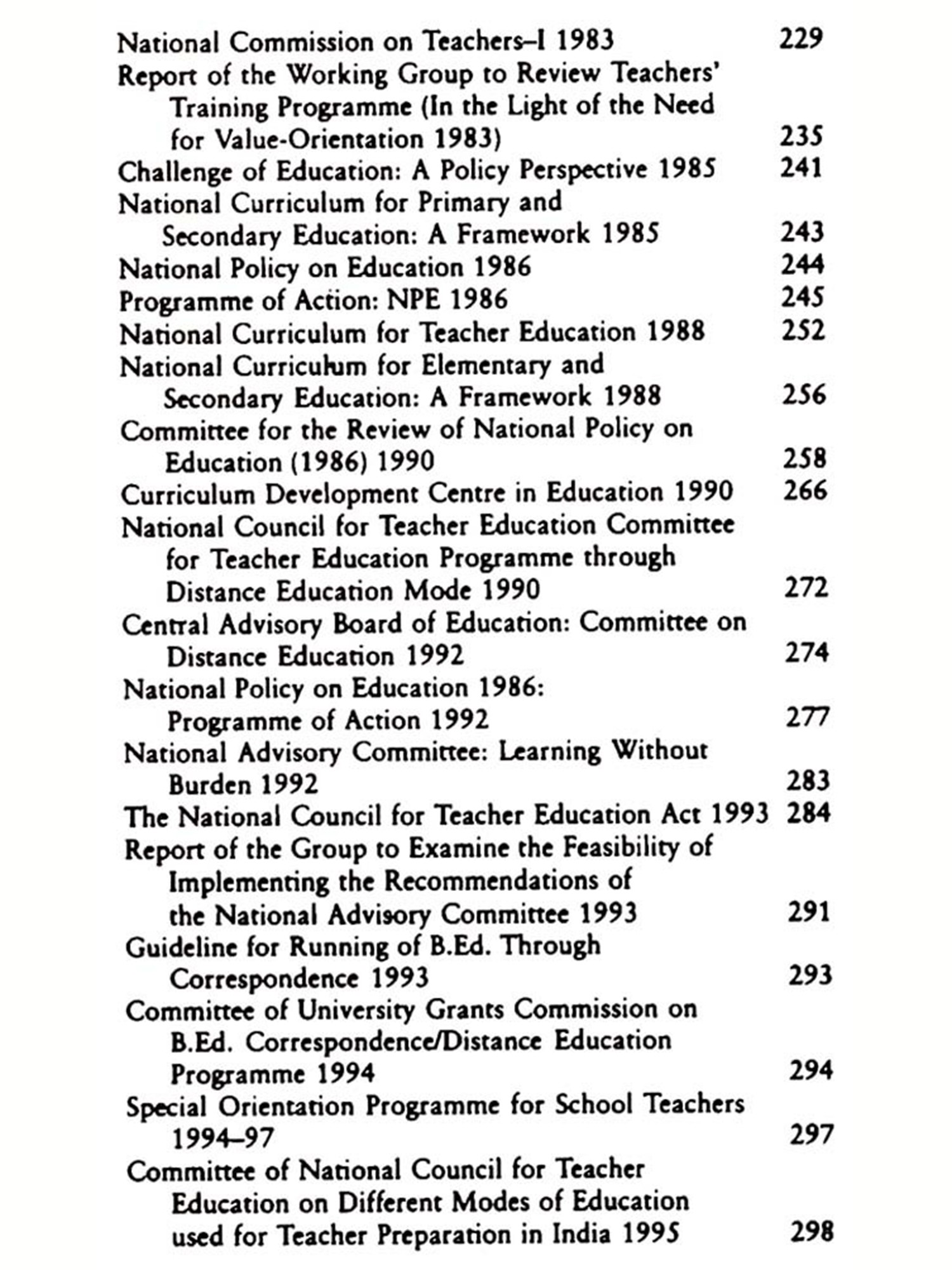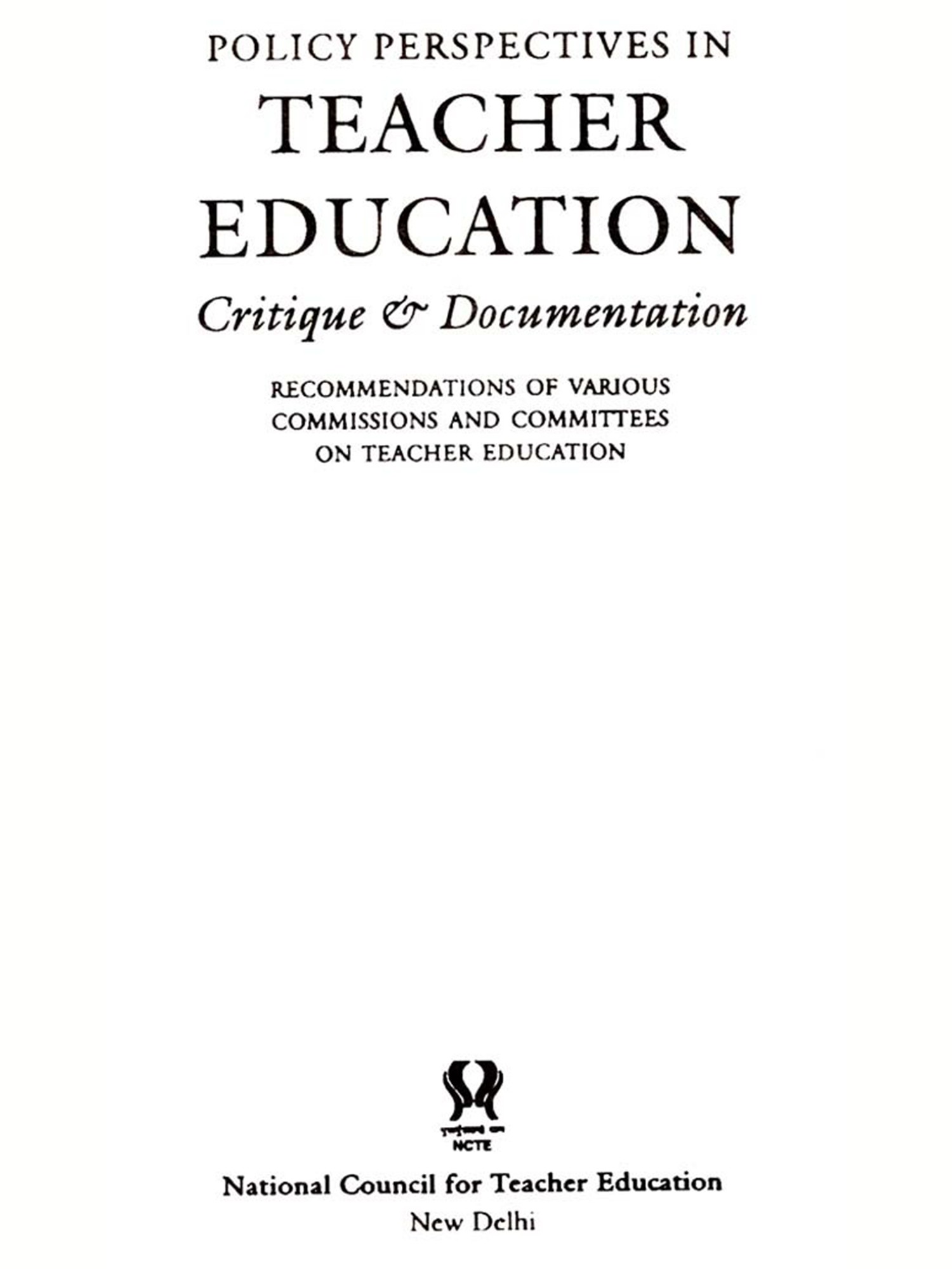The National Council for Teacher Education (NCTE) was established with a view to achieving planned and co-ordinated development of teacher education throughout the country and for regulation and maintenance of norms and standards. One of the first few projects which the Council decided to undertake was the compilation of relevant recommendations on teacher education contained in the reports of important commissions and committees on education. An experimental version of the compilation was published in 1995 and made available to training institutions, educationists and those interested in teacher education. In view of the overwhelming response and suggestions received, it was decided to bring out a comprehensive version of it, along with a critique of the developments that have taken place in this field. It was felt that this would help readers to appreciate the significance of the various recommendations and suggestions. Several eminent educationists of the country were consulted on the project and in determining the structure and design of this book. Professor M.S. Yadav was requested to undertake the task of preparing the critique on the developments in teacher education. He was assisted by Professor T.K.S. Lakshmi. Dr Rajendra Pal and Ms Sapna Sharma also assisted for brief periods as Project Fellows. The entire compilation has been edited and finalised by Professor T.N. Dhar with the assistance of Dr K. Walia who also provided valuable academic inputs and coordinated the project. NCTE would like to express its gratefulness and sincere thanks to all of them for the effort they have made and the support they have given to complete this project.