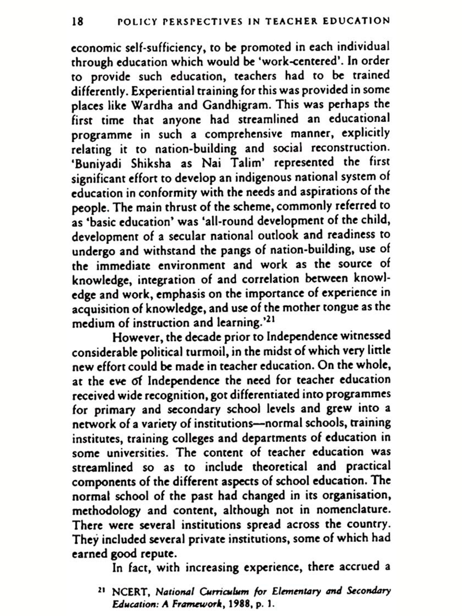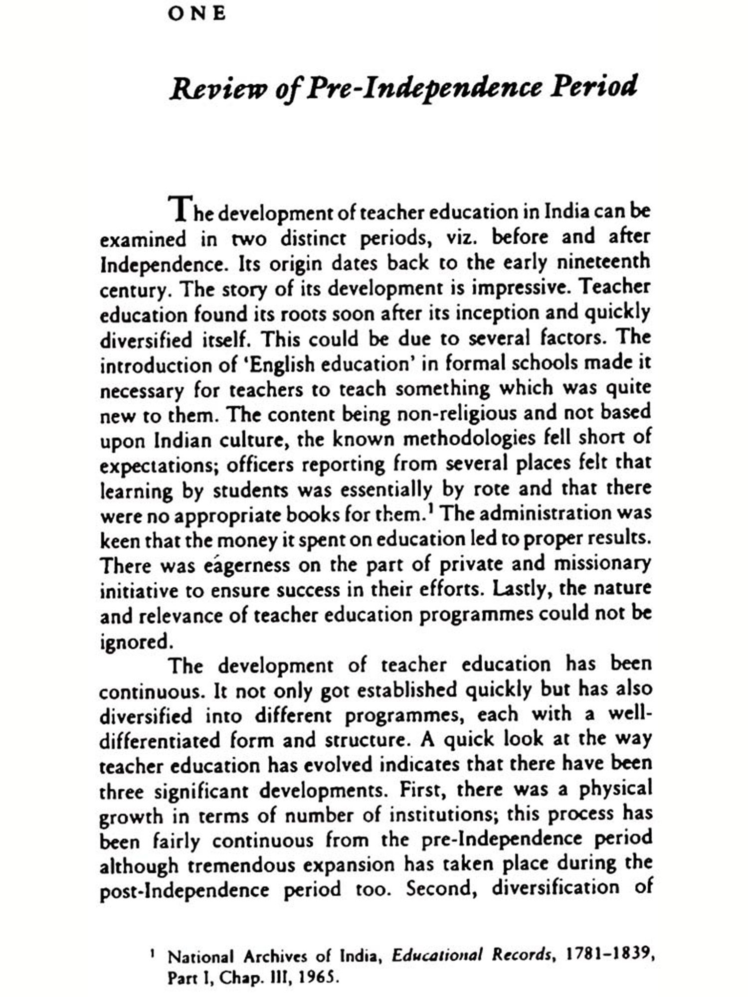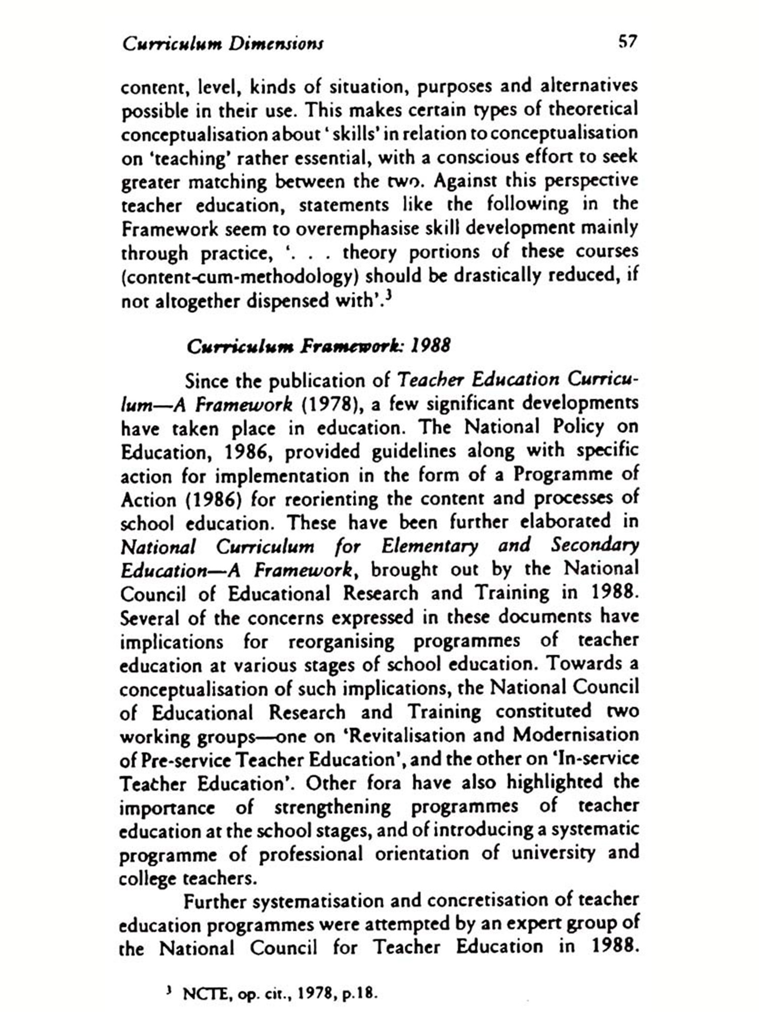 The first five decades after Independence have witnessed major changes in educational policies and in strategies for their implementation. On various occasions and in differing contexts, several commissions and committees have reviewed the achievements and attempted to develop a vision for future. It is also widely acknowledged that while achievements in the field of education are appreciable and noticeable, much more needs to be done in terms of the quality and relevance of education. This implies continuous improvement of the quality and orientation of programmes being undertaken for teacher preparation, both at the pre-service and in-service stages.