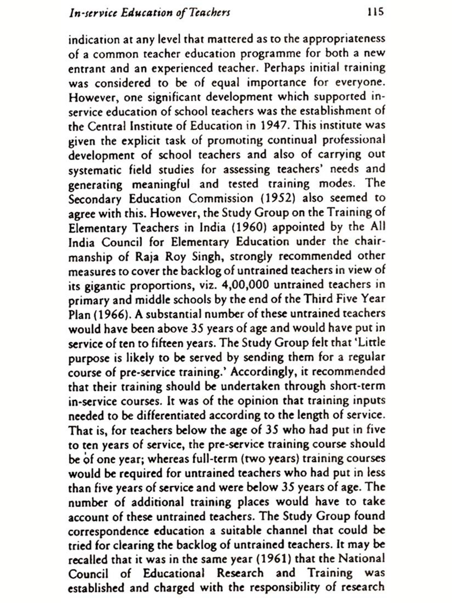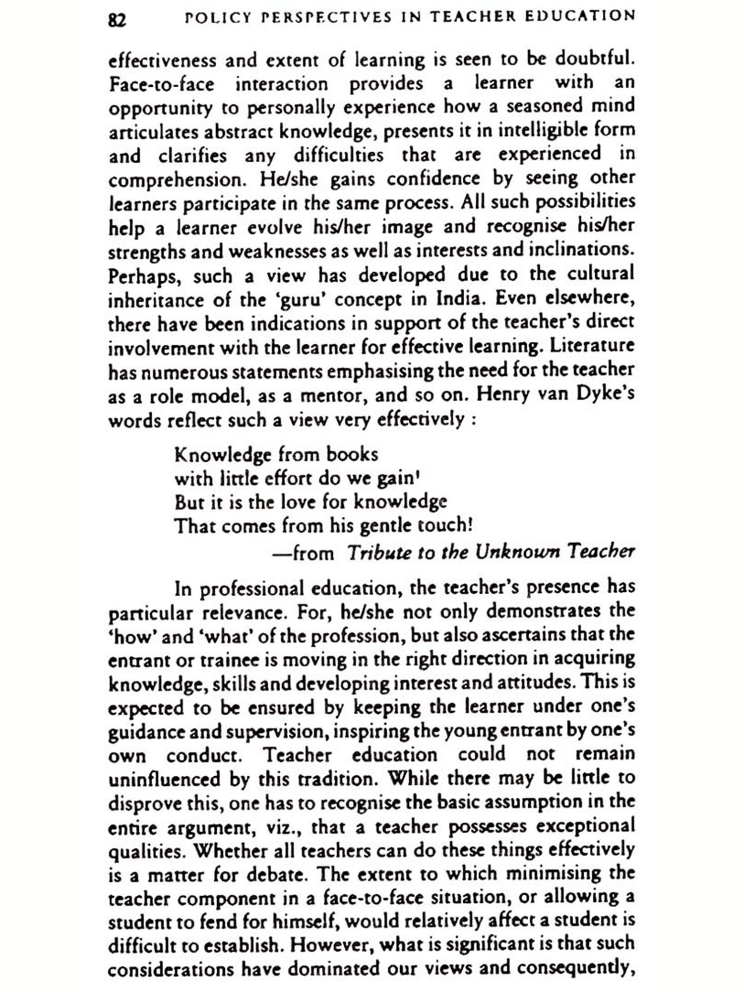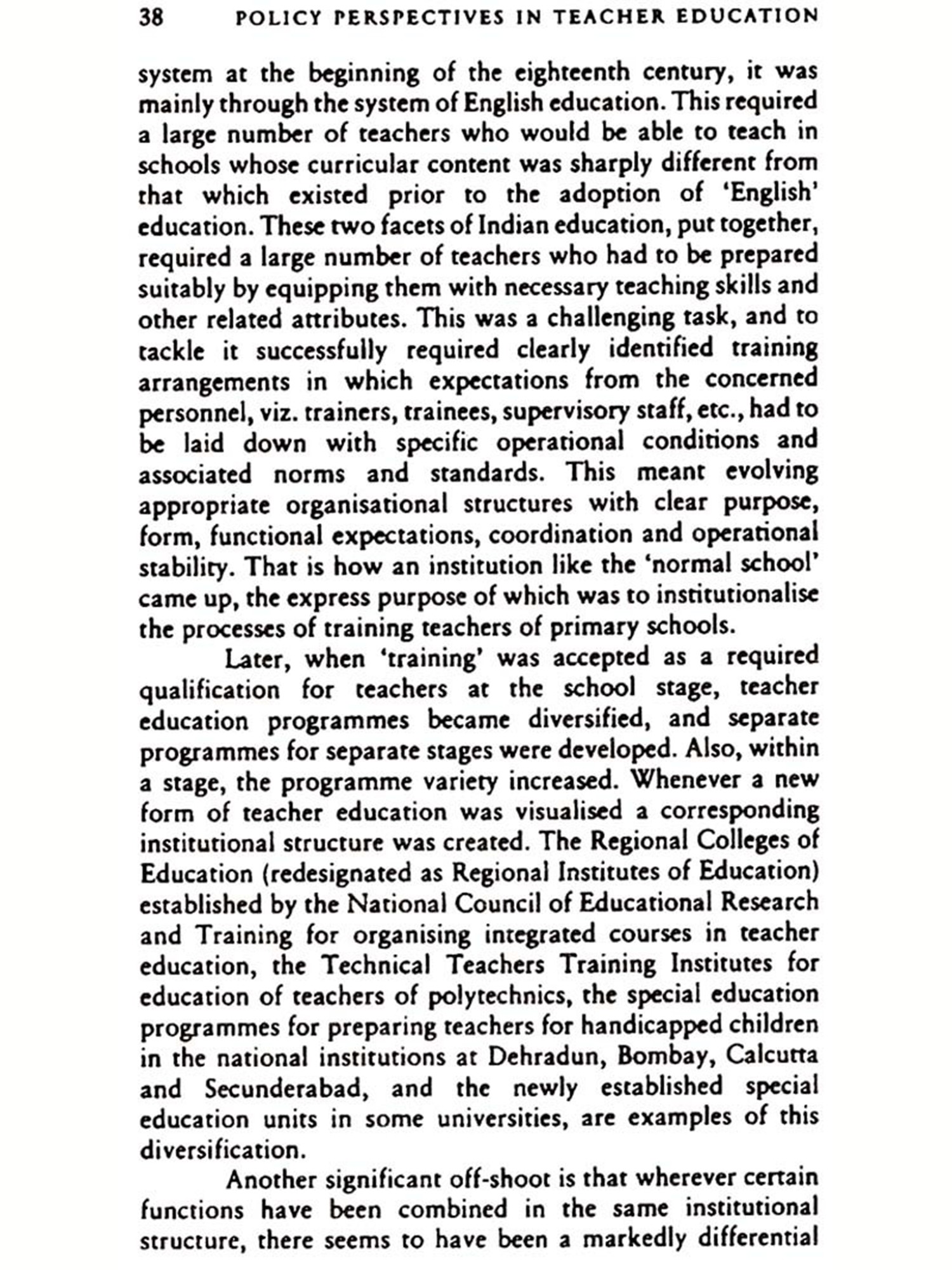 The first five decades after Independence have witnessed major changes in educational policies and in strategies for their implementation. On various occasions and in differing contexts, several commissions and committees have reviewed the achievements and attempted to develop a vision for future. It is also widely acknowledged that while achievements in the field of education are appreciable and noticeable, much more needs to be done in terms of the quality and relevance of education. This implies continuous improvement of the quality and orientation of programmes being undertaken for teacher preparation, both at the pre-service and in-service stages.