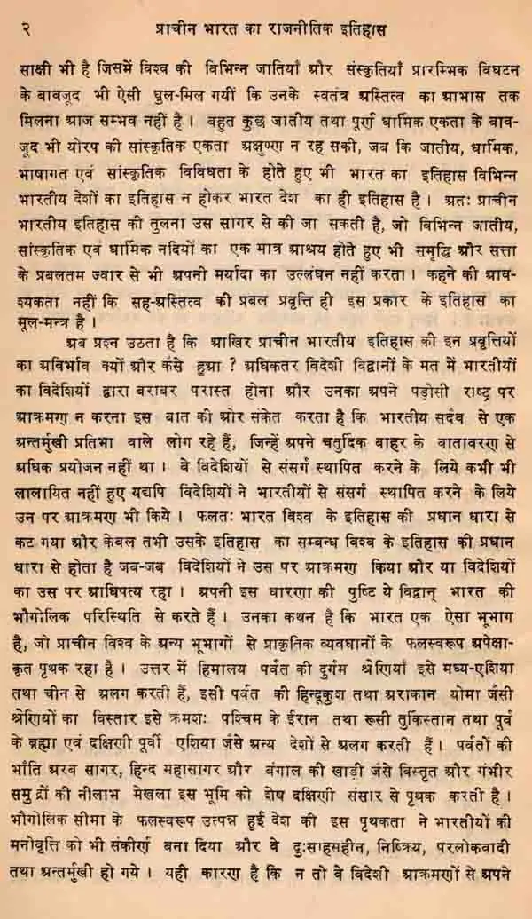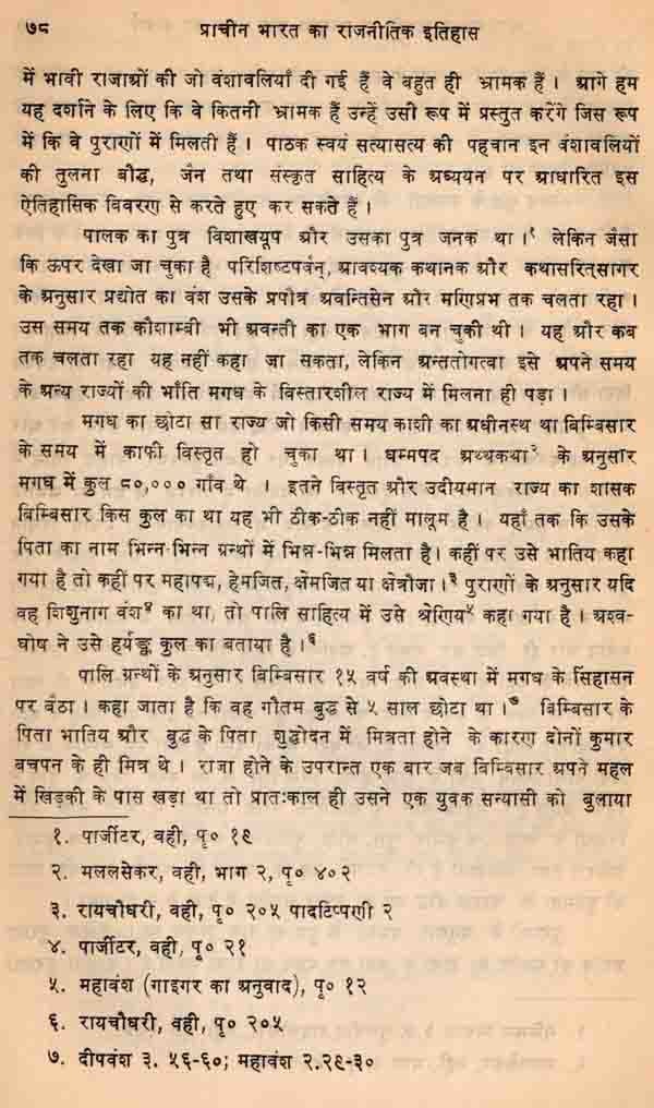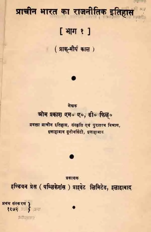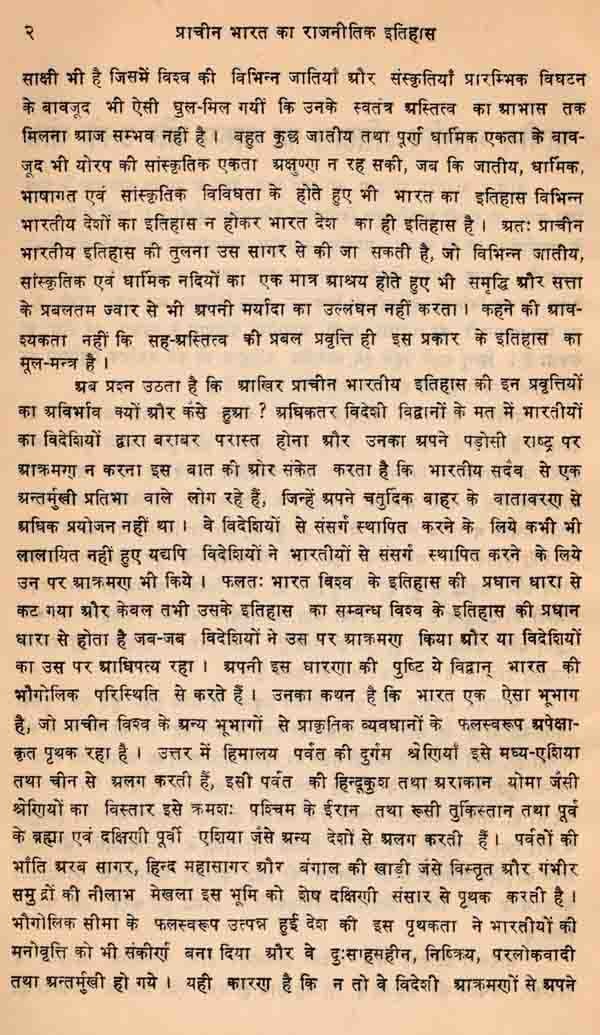हिन्दी भाषा में प्राचीन भारतीय इतिहास पर इस प्रकार की मौलिक रूप से लिखी गई पुस्तकों का बड़ा अभाव है। अंग्रेजी में भी बहुत से तद्विषयक ग्रन्थों में आधुनिक शोधों का समावेश नहीं मिलता है। ऐसी स्थिति में यह पुस्तक इस अभाव की पूति के एक सराहनीय प्रयास का प्रारम्भ द्योतित करती है। इतिहास साक्ष्यों के विश्लेषण एवं विवेचन के आधार पर अग्रसर होता है और राजनीतिक इतिहास की वस्तुनिष्ठता प्रधानतया लिखित साक्ष्यों पर निर्भर करती है। पर प्राचीन काल के इतिहास में जहाँ साक्ष्यों की कमी एवं अस्पष्टता तथा उनमें विरोध एवं विसंगतियाँ रहती हैं, और जहाँ केवल पुराकथाओं, किम्वदन्तियों, लोक-प्रचलित परम्पराओं और अपर्याप्त विवरणों का ही धुंधला आलोक रहता है, कुछ निश्च- यात्मक रूप से नहीं प्रतिपादित किया जा सकता है। फिर भी उपलब्ध साक्ष्यों के आलोचनात्मक परीक्षण तथा विभिन्न मतों के विवेचन के आधार पर निकटतम सम्भावनाबों का निर्देश अवश्य किया जा सकता है और इस दिशा में इस पुस्तक में लेखक ने सुन्दर प्रयास किया है।