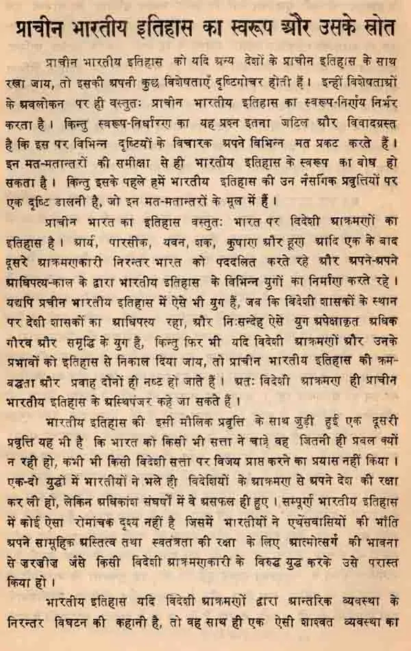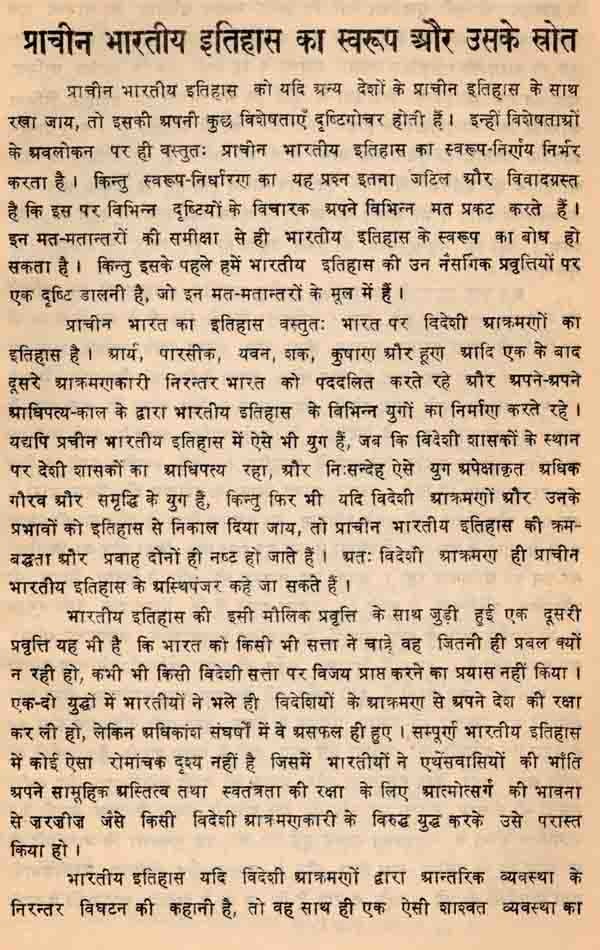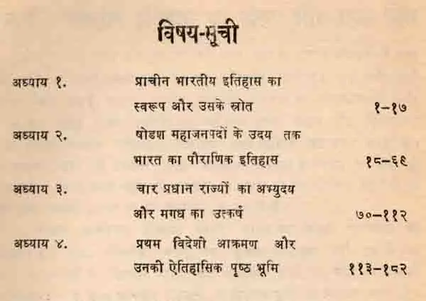 पुस्तक के प्रथम अध्याय में भारतीय इतिहास के स्वरूप निर्धारण की चेष्टा करते हुये उसके लिखित-देशी एवं विदेशी तथा पुरातात्विक स्रोतों के महत्व पर विचार किया गया है। दूसरे अध्याय में पोडश महाजनपदों के उदय तक भार तीय इतिहास की पौराणिक परम्पराओं का विवेचनात्मक वर्णन वैदिक, पौराणिक, प्राचीन बौद्ध तथा जैन साहित्य एवं अन्य प्राचीन ग्रन्यों के आधार पर आधुनिक मतों की समीक्षा करते हुये किया गया है। तृतीय अध्याय में चार प्रधान राज्यों के उदय, साम्राज्यवादी प्रवृत्ति के विकास एवं नन्दों के पतन तक मगध के उत्कर्ष पर पालि ग्रन्थों की, पौराणिक एवं अन्य परम्पराओं के विवेचन के आधार पर प्रकाश डाला गया है। चतुर्थ अध्याय में प्रारम्मिक विदेशी पारसीक एवं यवन- आक्रमणों तथा तरकालीन राजनीतिक परिस्थितियों पर एक विस्तृत संदर्भ में विचार किया गया है।