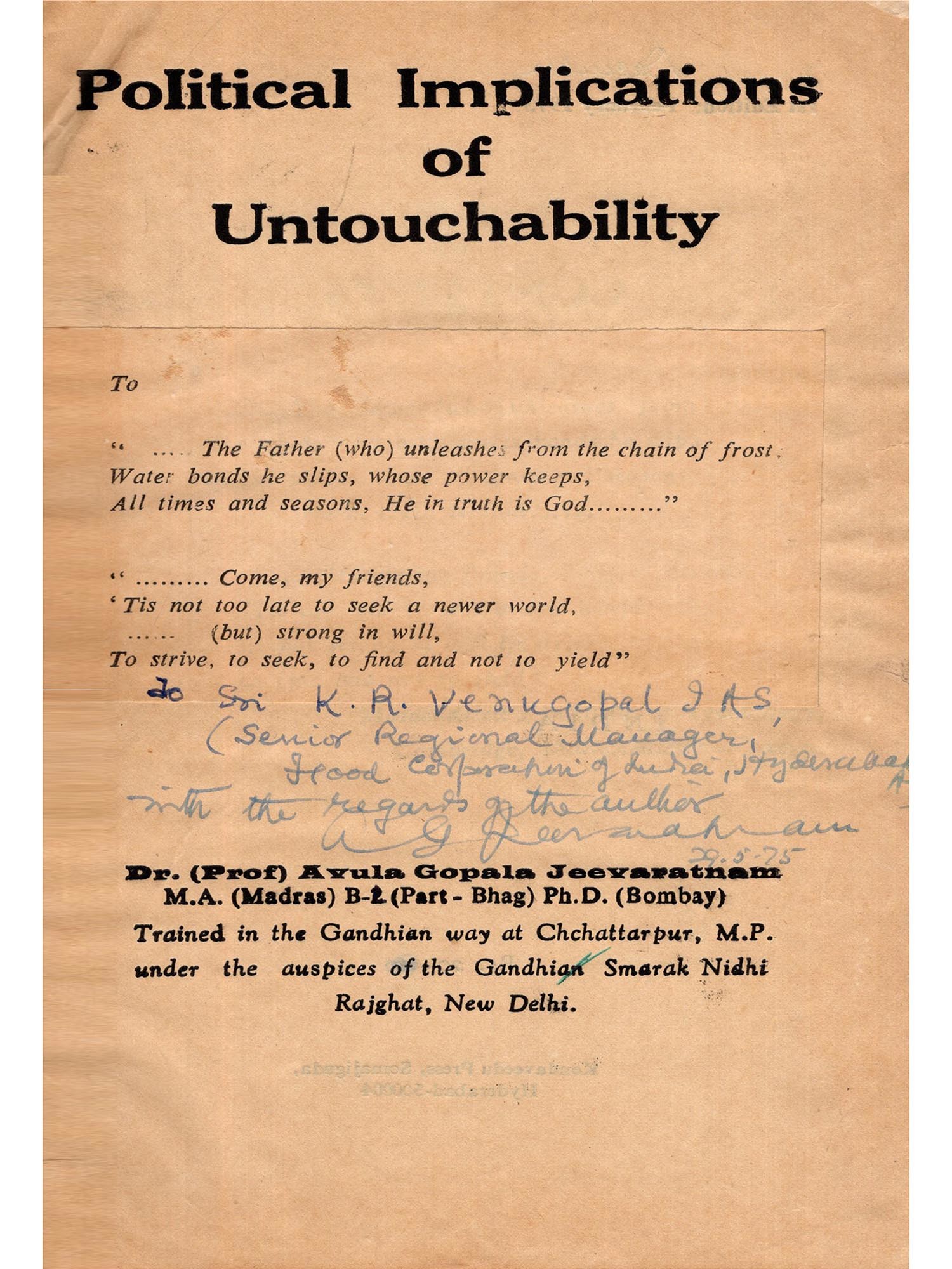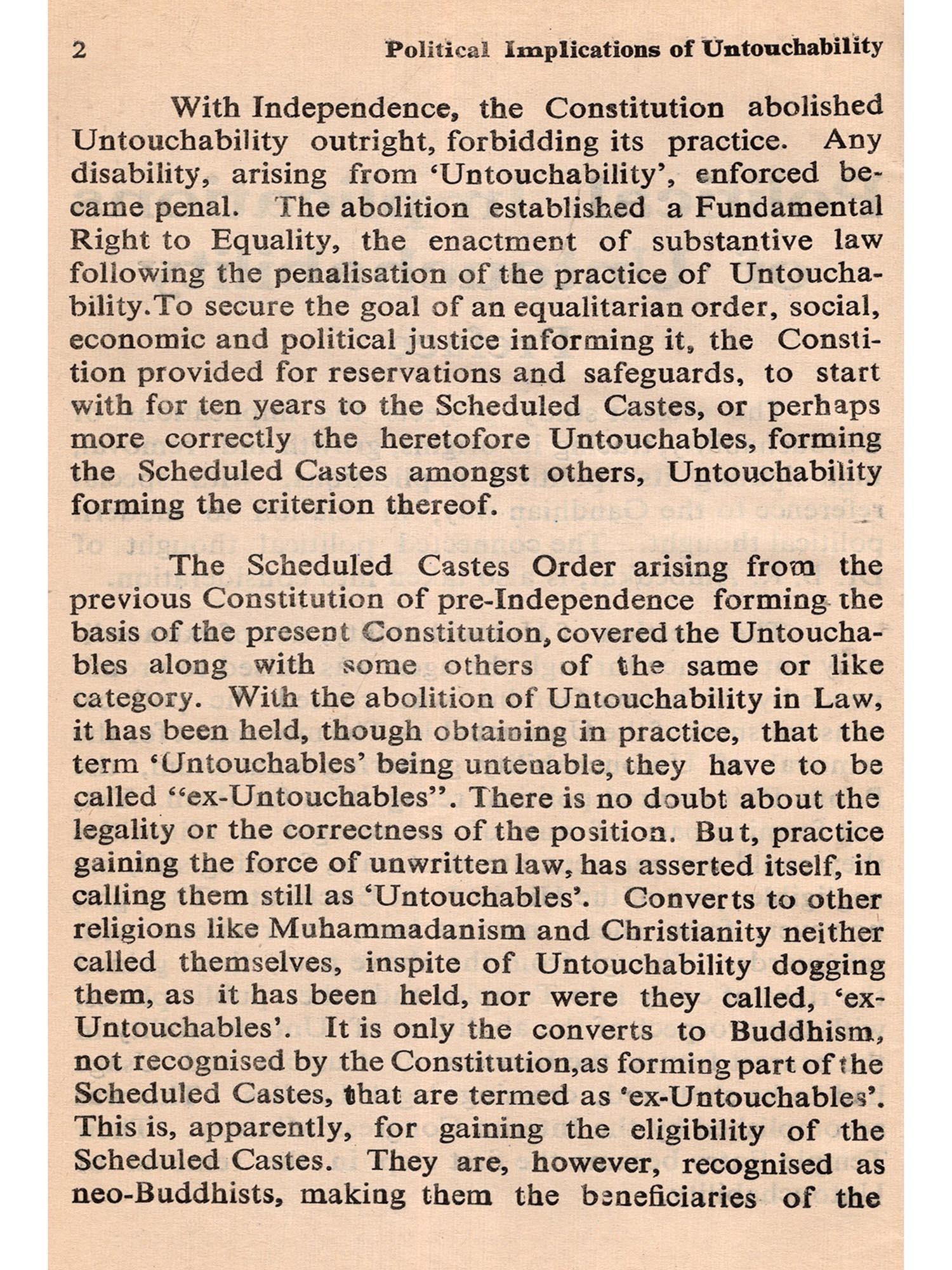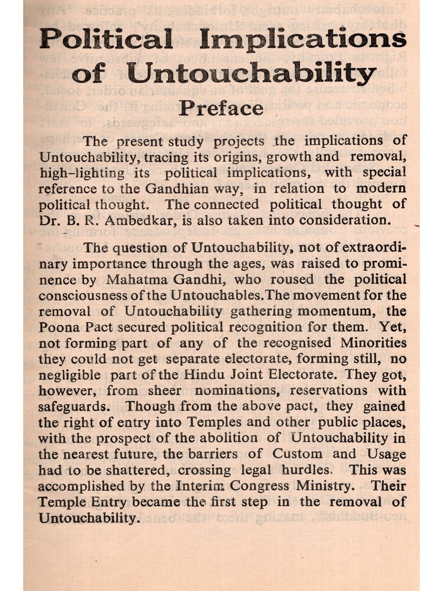 As originally approved by the Bombay Uuiversity, awarding me the Ph. D. Degree, this Thesis of mine, "Political Implications of untouchability" is now published and my grateful thanks, at the outset, are offered to the University for permitting its publication.