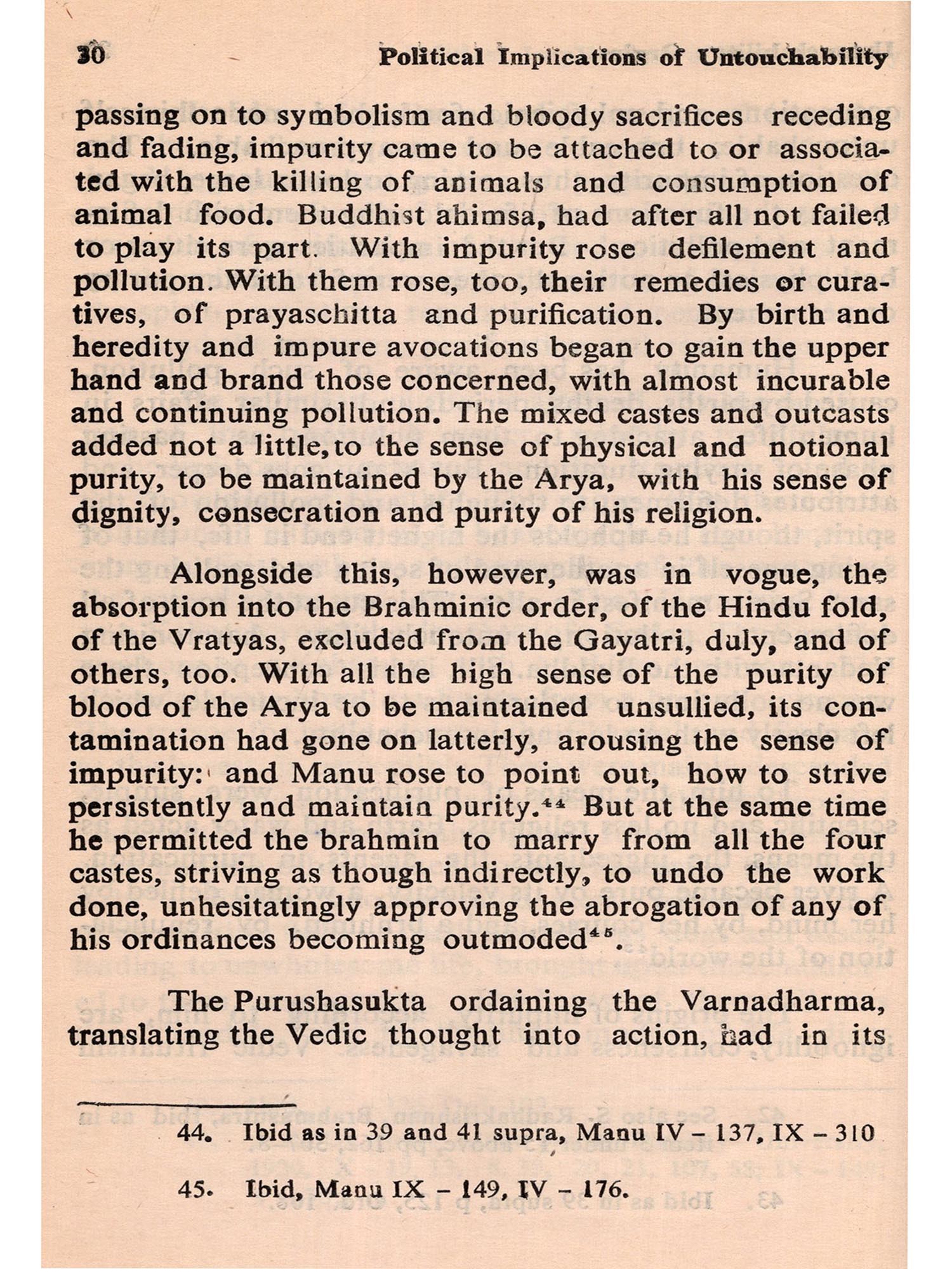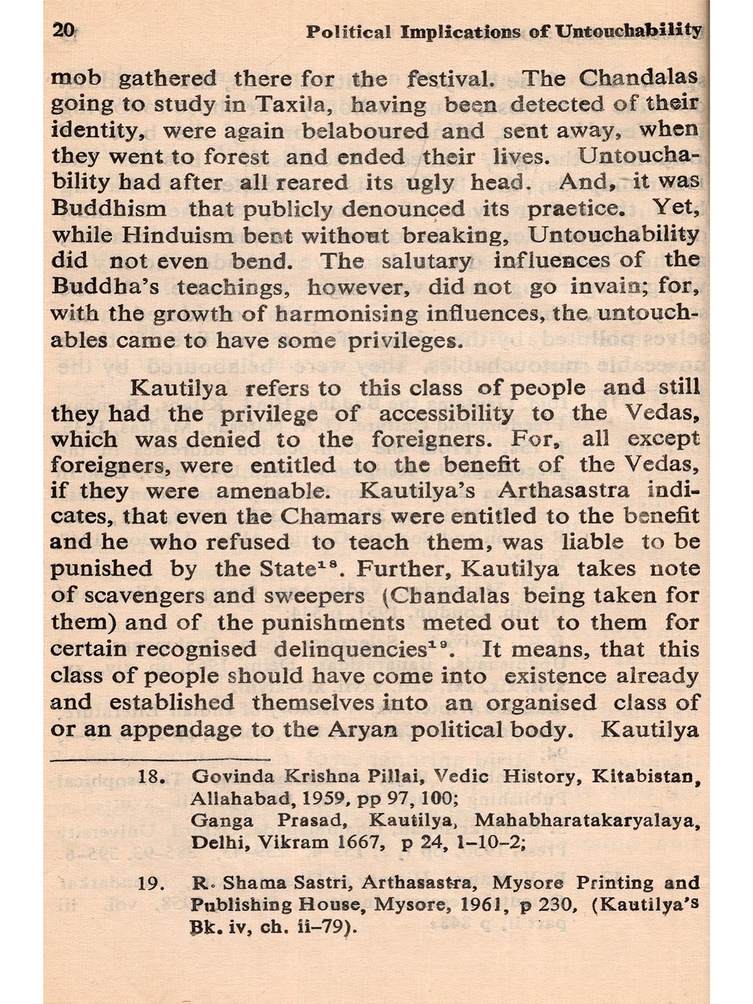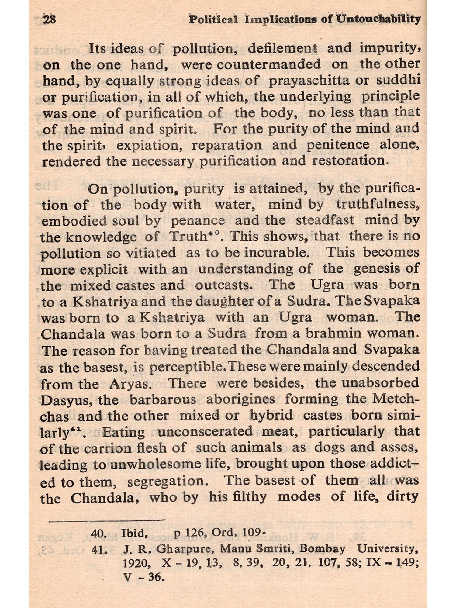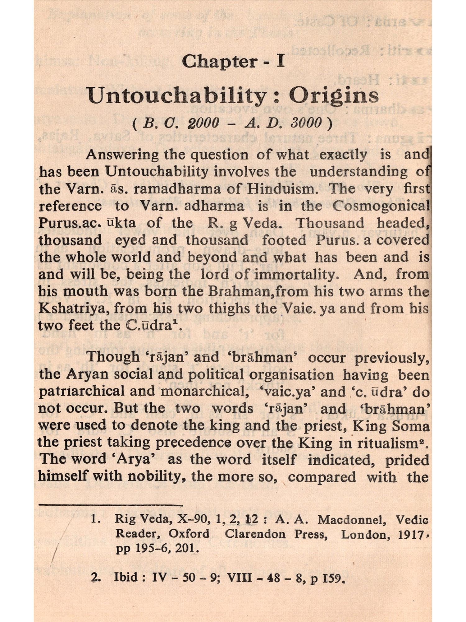 To explore ancient history is itself a difficult and tricky job in India. So much depends on conjecture and so little on tangible evidence, that controversy and confusion are the outcome of almost every investigation. When this is the situation in regard to the ordinary facts of ancient history, one could imagine how much more difficult it should be to probe into the possible motivations and background of a complex practice like untouchability, as we understand it today. On top of it all, to analyse the 'Political implications' of a practice, which, for a long time, did not necessarily emanate from, nor was mainly sustained by, political motivations (again, as we understand these terms today) is, at say the least, a still more bewildering job.