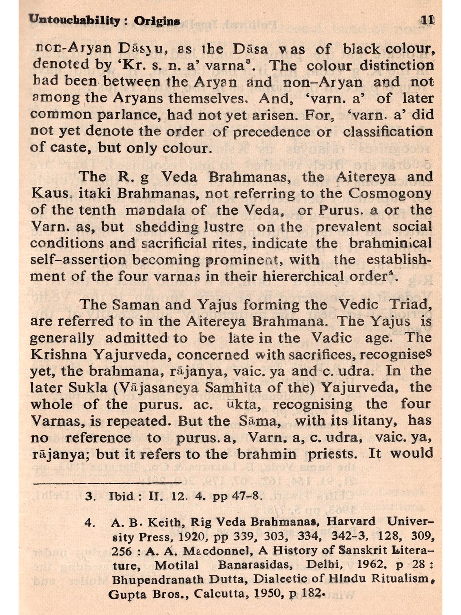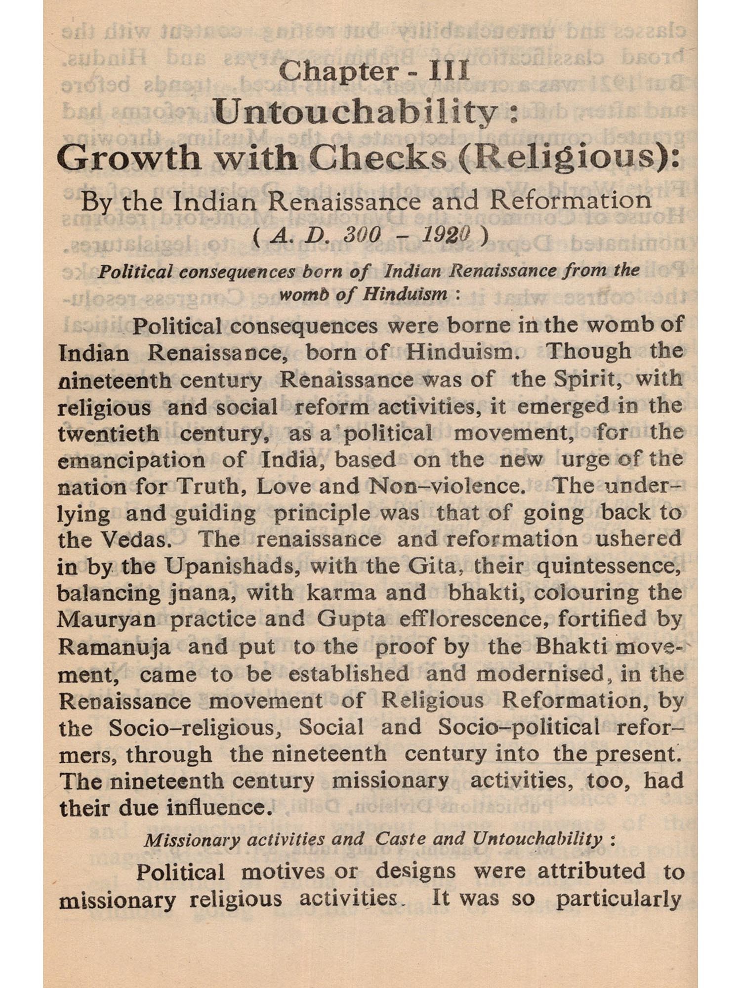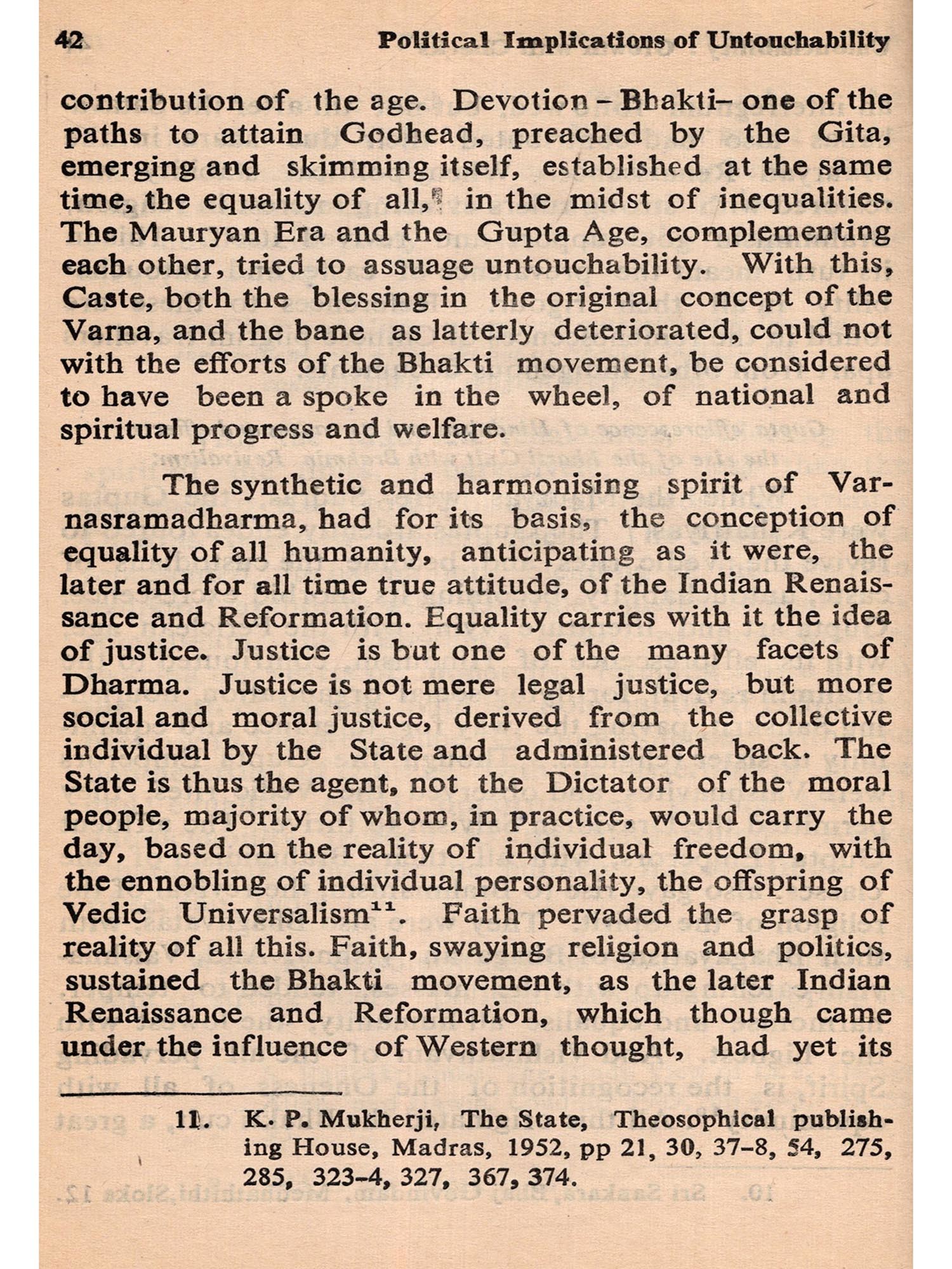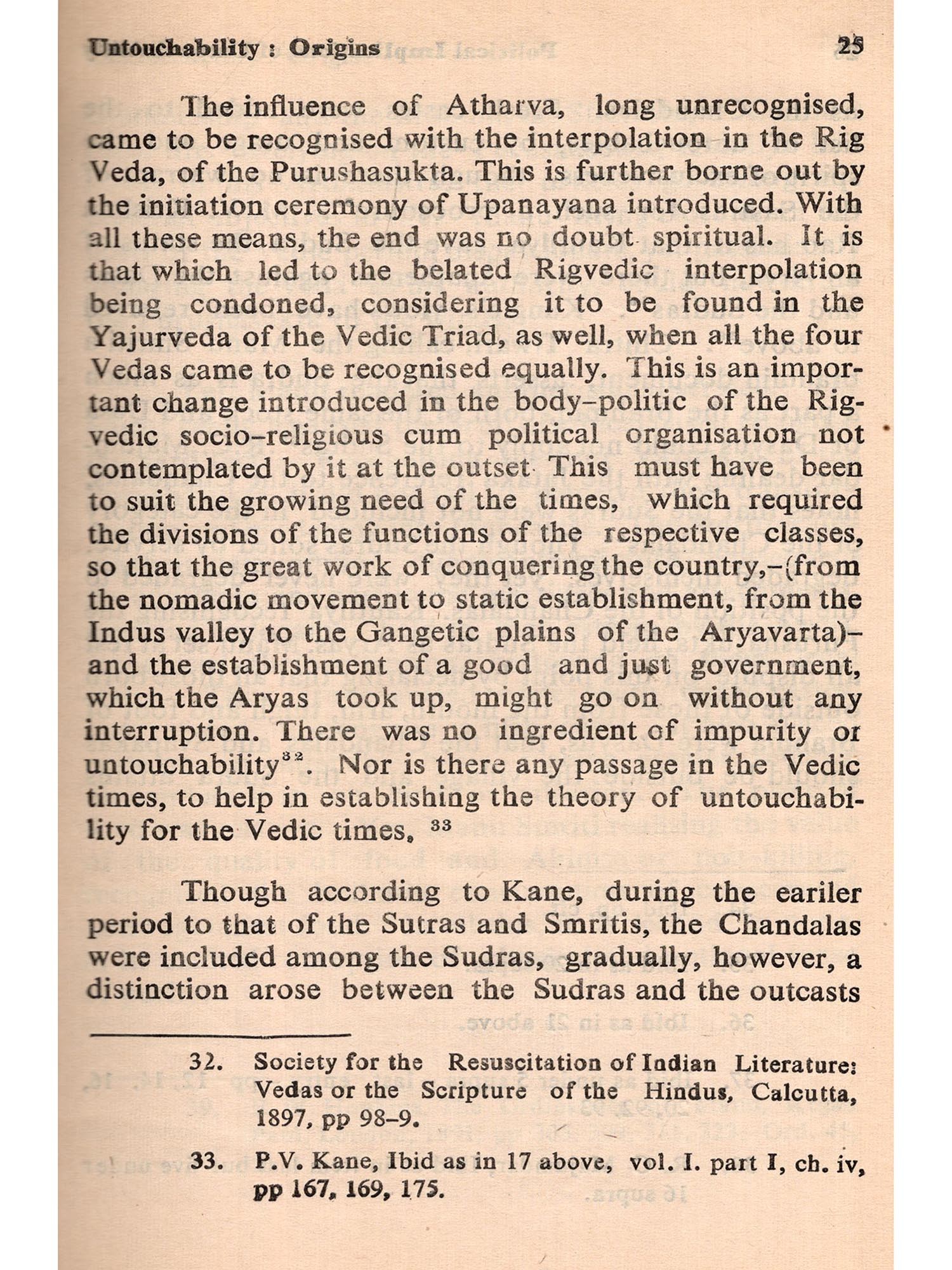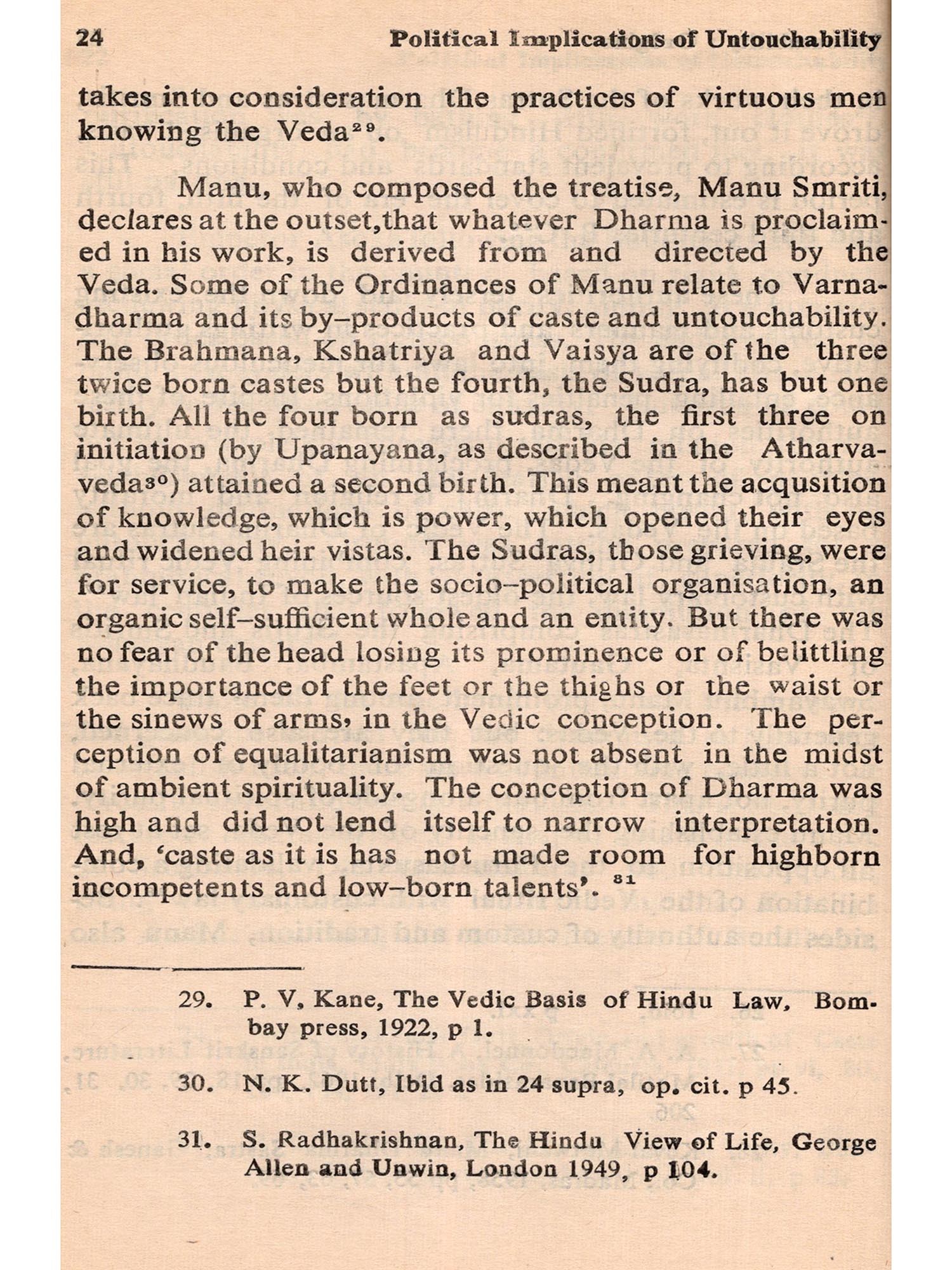 The subject is intertwined with the social philosophy of Mahatma Gandhi. To him the removal of Untouchability was religious to the Indian National Congress it was a policy: to Dr. B. R. Ambedkar it was political: to the British Government, it was a matter for responsible government: and to the responsible Indian Government it has been Constitutional. But to the Vedas, Untouchability was unknown.