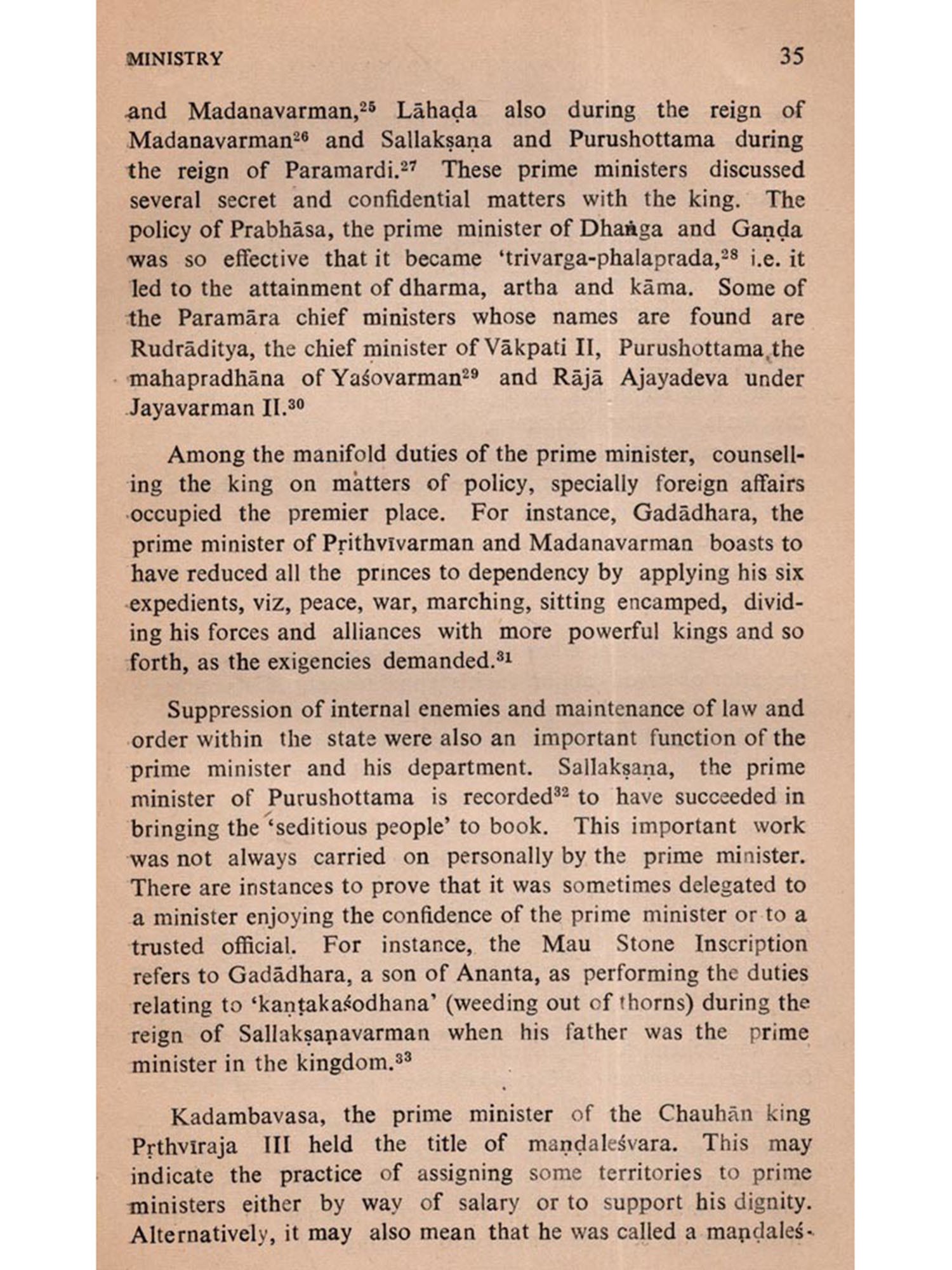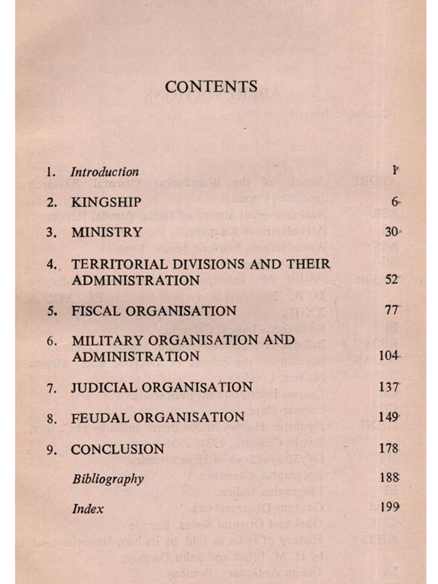 The book consists of nine chapters followed by a bibliography and an index. Chapter 1 starts with an introduction of the various sources that have constituted the basis of the present work. Chapter II deals with Kingship. Chapter III gives a clear picture of ministry. Chapter IV introduces territorial divisions of the period and their administration. Chapter V deals with fiscal organisation while Chapter VI with military organisation and administration. Chapter VII traces. judicial organisation while Chapter VIII feudal organisation. Chapter IX is the concluding Chapter followed by a classified and exhaustive bibliography and an index.
