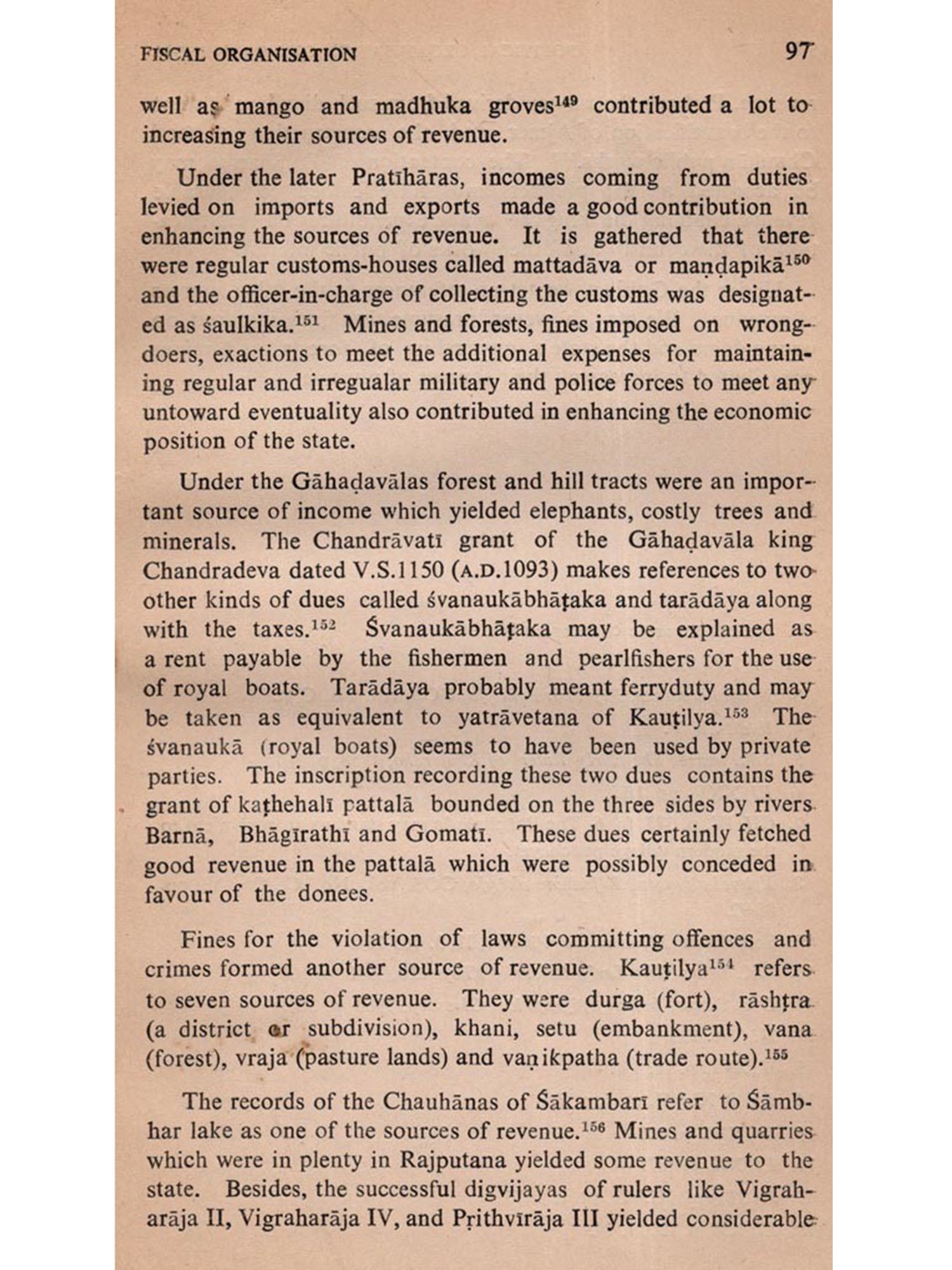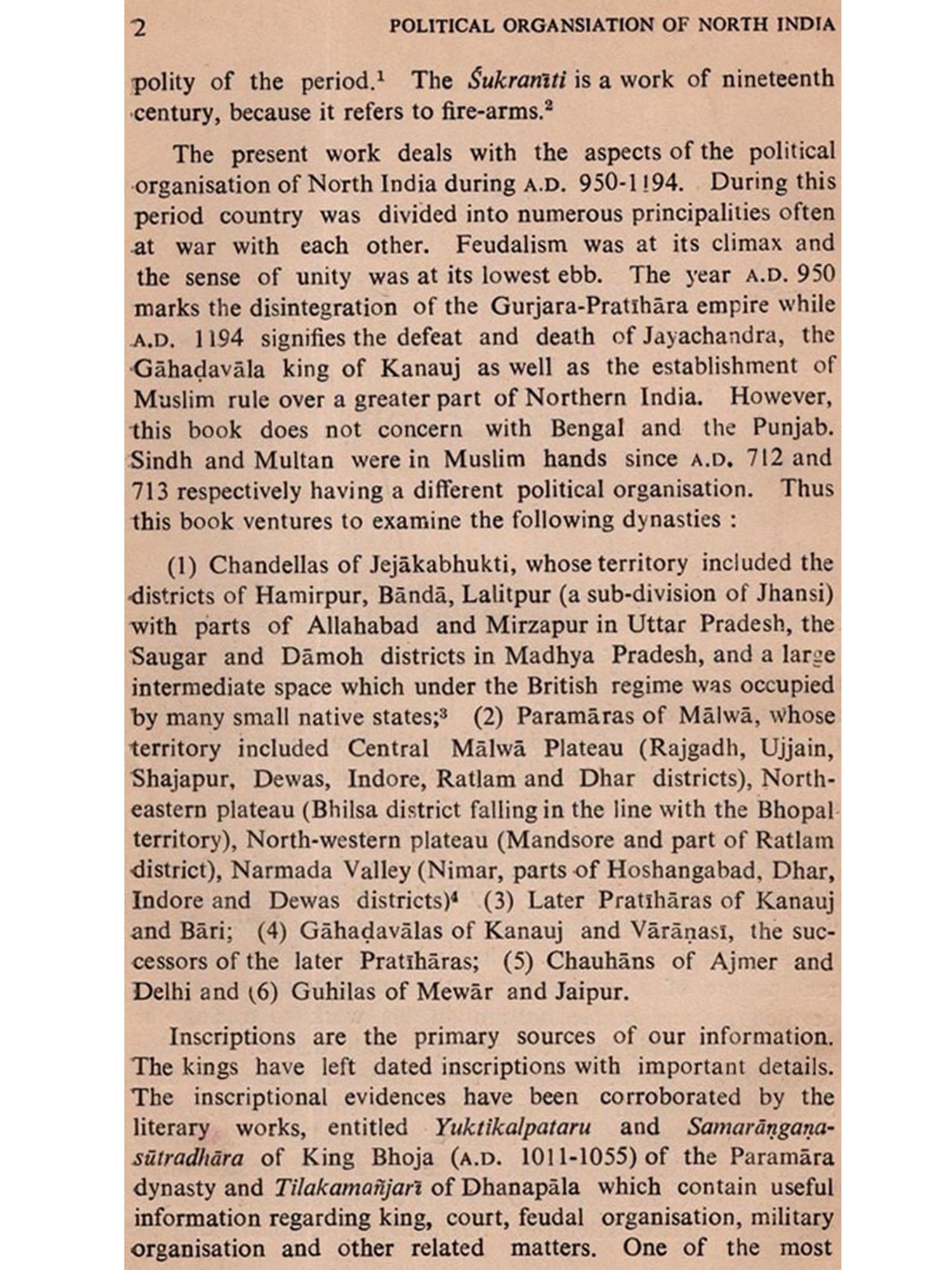 The period A.D. 950-1194 is significant in its own way. The country was divided into numerous principalities often at war with each other. Feudalism of the type current in Asia at the time was at its climax and the sense of unity was at its lowest ebb. The middle of the tenth century marks the disintegration of the Gurjara-Pratthāra empire while A.D. 1194 signifies the defeat and death of Jayachandra, the Gahadavala king of Kanauj, as well as the establishment of Muslim rule over a greater part of North India. Sindh and Multan had been in Muslim hand since A.D. 712 and 713 respectively having a Soon the Punjab changed different political organisation. masters and by 1021 the whole area was conquered by the Yamini Turks of Ghazni from the Hindu Shahiyas of Udabhandapura and later Nandana. We have also left out Kashmir in the north-west and Bengal in the east. Thus the survey includes such dynasties as the Chandellas of Jejak-bhukti, the Paramāras of Malwa; the later Pratihāras of Kanauj and Bari; the Gahadavālas of Kannauj and Vāranast; the Chauhans of Ajmer and Delhi and the Guhilas of Malwa and jaipur. The nature of the political organisation of these dynasties was largely identical but there were differences also in the designation of different officials, territorial divisions etc. So we have given a dynasty-wise treatment of the various aspects of the polity during the period under survey.