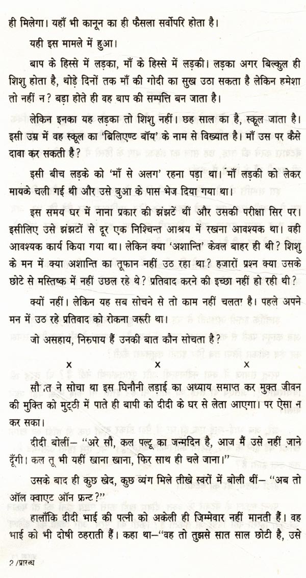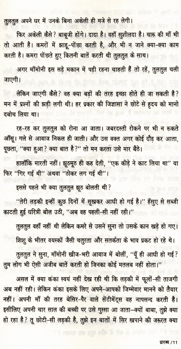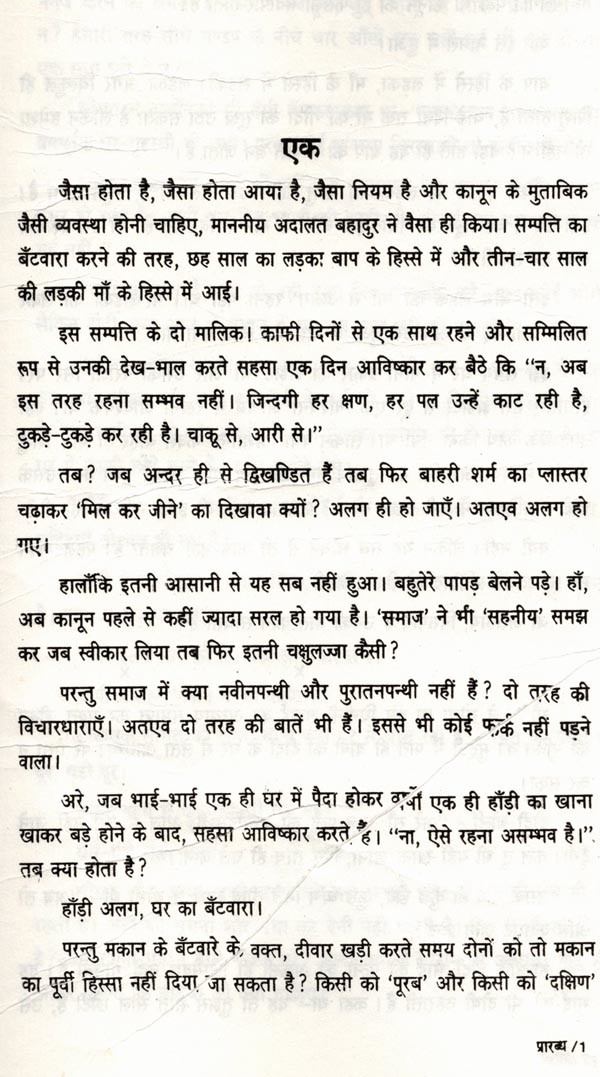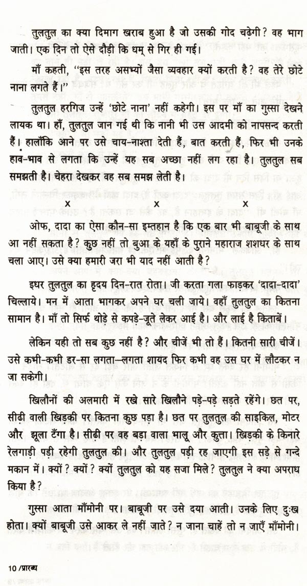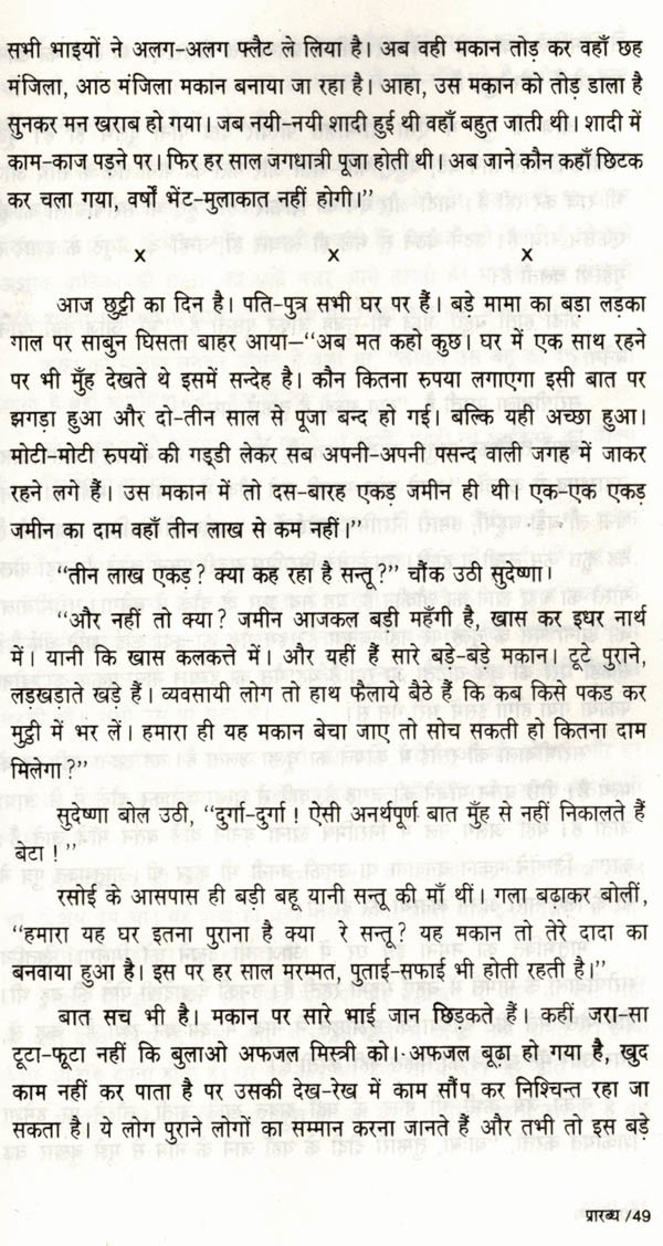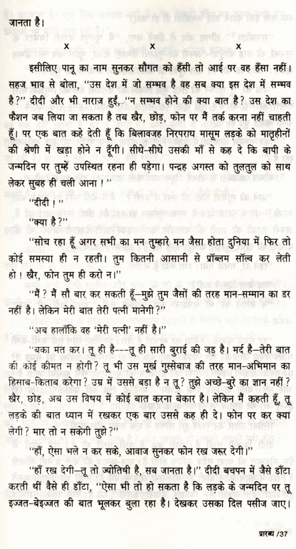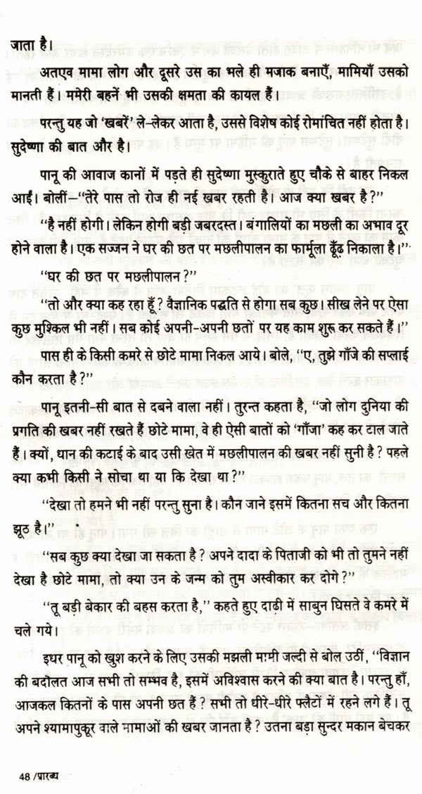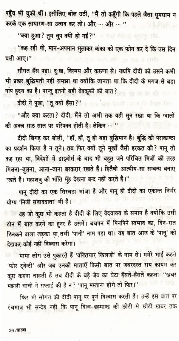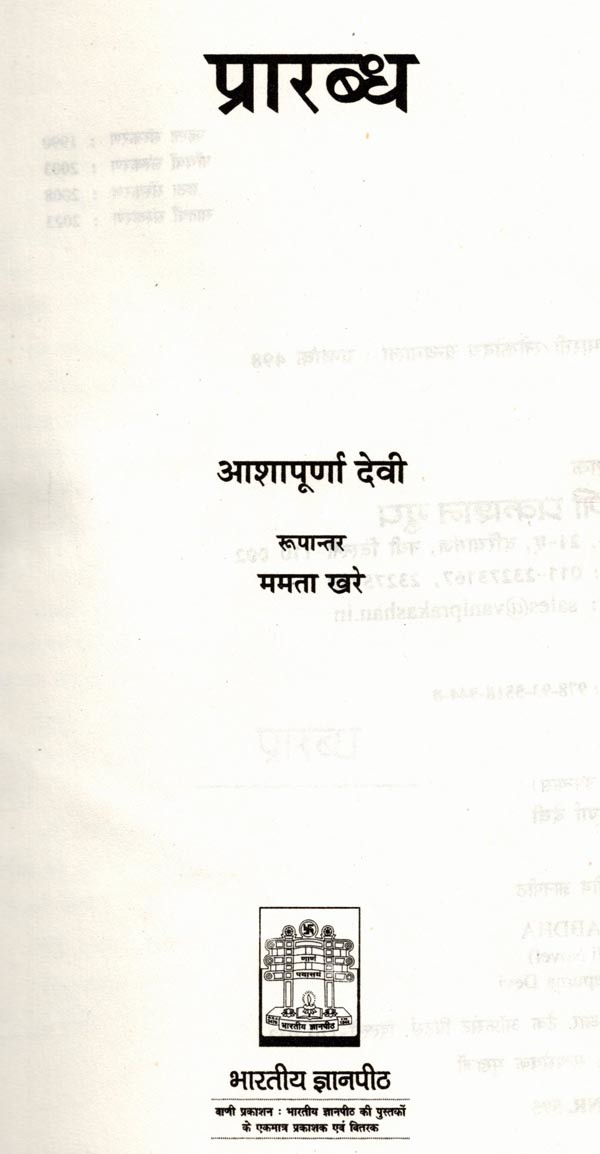 नारी-केन्द्रित उपन्यासों में उठायी गयी समस्या का प्रश्न-विन्दु अक्सर यही है कि हमारा समाज पुरुष-द्वारा निर्मित और पुरुष-शासित है। सृजन में अपनी श्रेष्ठ सहा भागिता के बावजूद समाज में नारी-पुरुष का समान मूल्यांकन नहीं होता। पुरुष की बड़ी-से-बड़ी कमज़ोरी समाज पचा लेता है लेकिन नारी को उसकी थोड़ी-सी चूक के लिए भी पुरुष समाज उसे कठोर दण्ड देता है; जबकि इसमें उसकी लिप्सा का अंश कहीं अधिक होता है। वास्तव में नारी अपने मूल अधिकारों से तो वंचित है, लेकिन सारे कर्त्तव्य और दायित्व उसके हिस्से मढ़ दिये गये हैं। आशापूर्णाजी का मानना है कि नारी का जीवन अवरोधों और वंचना में ही कट जाता है, जिसे उसकी तपस्या कहकर हमारा समाज गौरवान्वित होता है। इस विडम्बना और नारी जाति की असहायता को ही वाणी मिली है यशस्वी बांग्ला कथाकार के इस अनुपम मनोहारी उपन्यास में। सजग पाठकों के लिए प्रस्तुत है प्रारब्ध का यह नया संस्करण ।