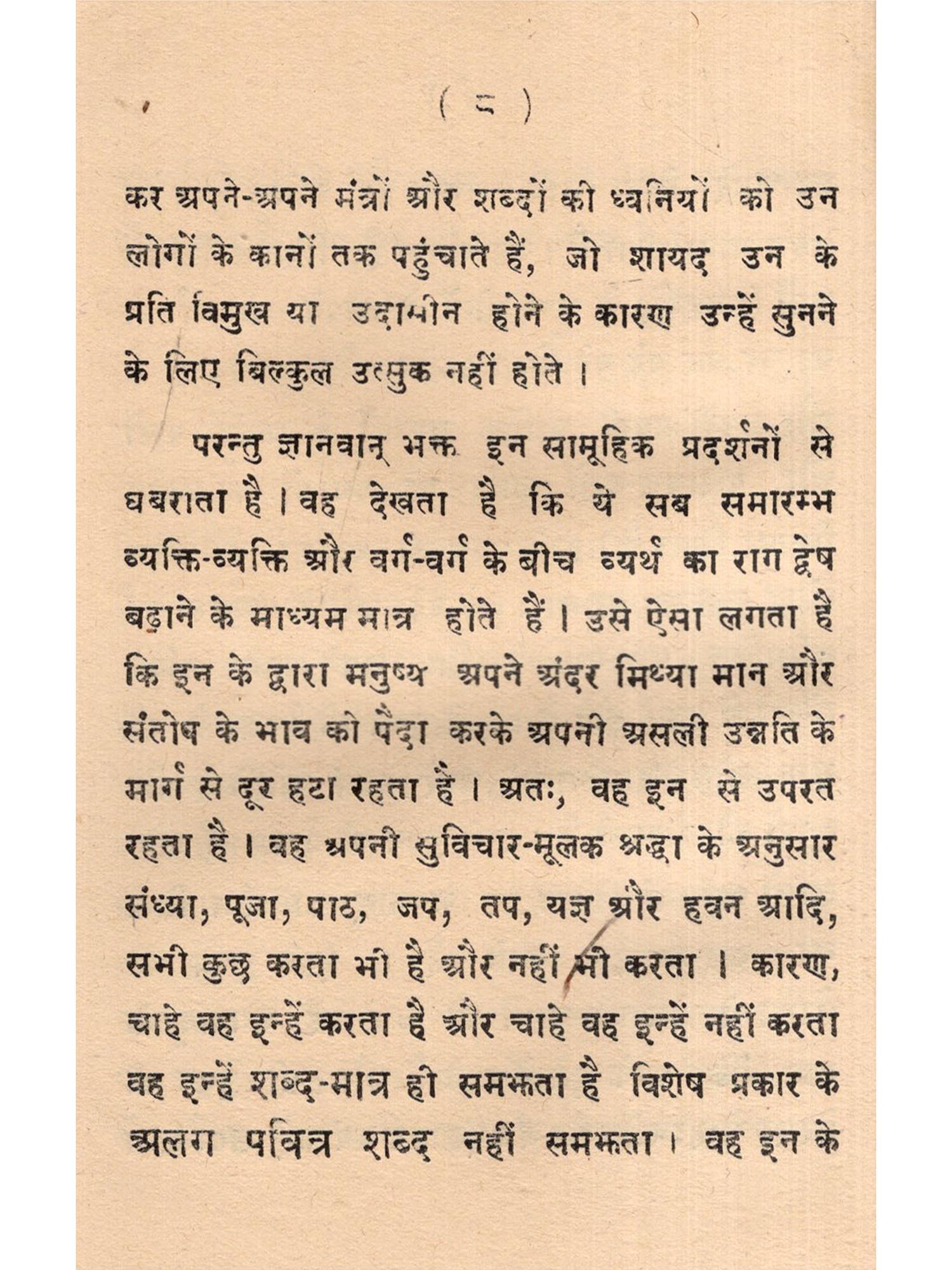 आप प्रतिदिन अपने तीन-चार घण्टे स्वाध्याय और यज्ञ-कर्म द्वारा सफल करते थे। विशेष बात यह थी कि आप के अन्दर सांप्रदायिक संकीर्णता का अभाव था । आप सब देशों और समयों के मान्य महापुरुषों और महा-ग्रन्थों का आदर और उन की शिक्षाओं का मनन करते रहते थे। आपकी इस उदार मति और प्रेम-भावना को देख कर स्व. महात्मा गांधी जी और स्व, कवींद्र रवींद्र ठाकुर ऐसे महानुभाव प्रसन्नता पूर्वक आप की कोठी पर जा कर उतरते थे। आप ने आज से पन्द्रह वर्ष पूर्व धर्मार्थ की पवित्र प्रेरणा से प्रेरित हो कर होश्यारपुर और बजवाड़ा के बीचों-बीच साधु-आश्रम का विशाल भवन बनवाया था। आप की धार्मिक प्रीति ही १६४७ के अंत में लाहौर से उखड़े हुए हमारे संस्थान को इस आश्रम में खींच लाई थी। आाप प्रति वर्ष इस आश्रम में यज्ञ और सत्संग का विशेष सप्ताह मनाया करते थे। आप का विचार था कि अब सांसारिक काम-धंधे को अपने योग्य सुपुत्रों को सौंप देंगे और स्वयं इस आश्रम में निवास धारण करके अपना शेष सारा समय ज्ञान, ध्यान और परोपकार के कामों में अर्पण करेंगे। परन्तु ऐसा अवसर आप पा न सके, क्योंकि आप १६५० के वार्षिक यज्ञ और सत्संग से निपट कर जब २६ अप्रैल को मसूरी पधारे, तो अचानक हृद्-गति रुक जाने से बासठ वर्ष की आयु में आप का शरीर शांत हो गया। अब यह आश्रम ही आपके धर्म-भाव का पवित्र स्मारक है। और यहाँ पर बनी हुई आप की समाधि आने-जाने वाले को, मानो, यह प्रेरणा कर रही है कि, "भाई, समय निकला जा रहा है, जो कुछ करना है, आज और अभी कर ले !