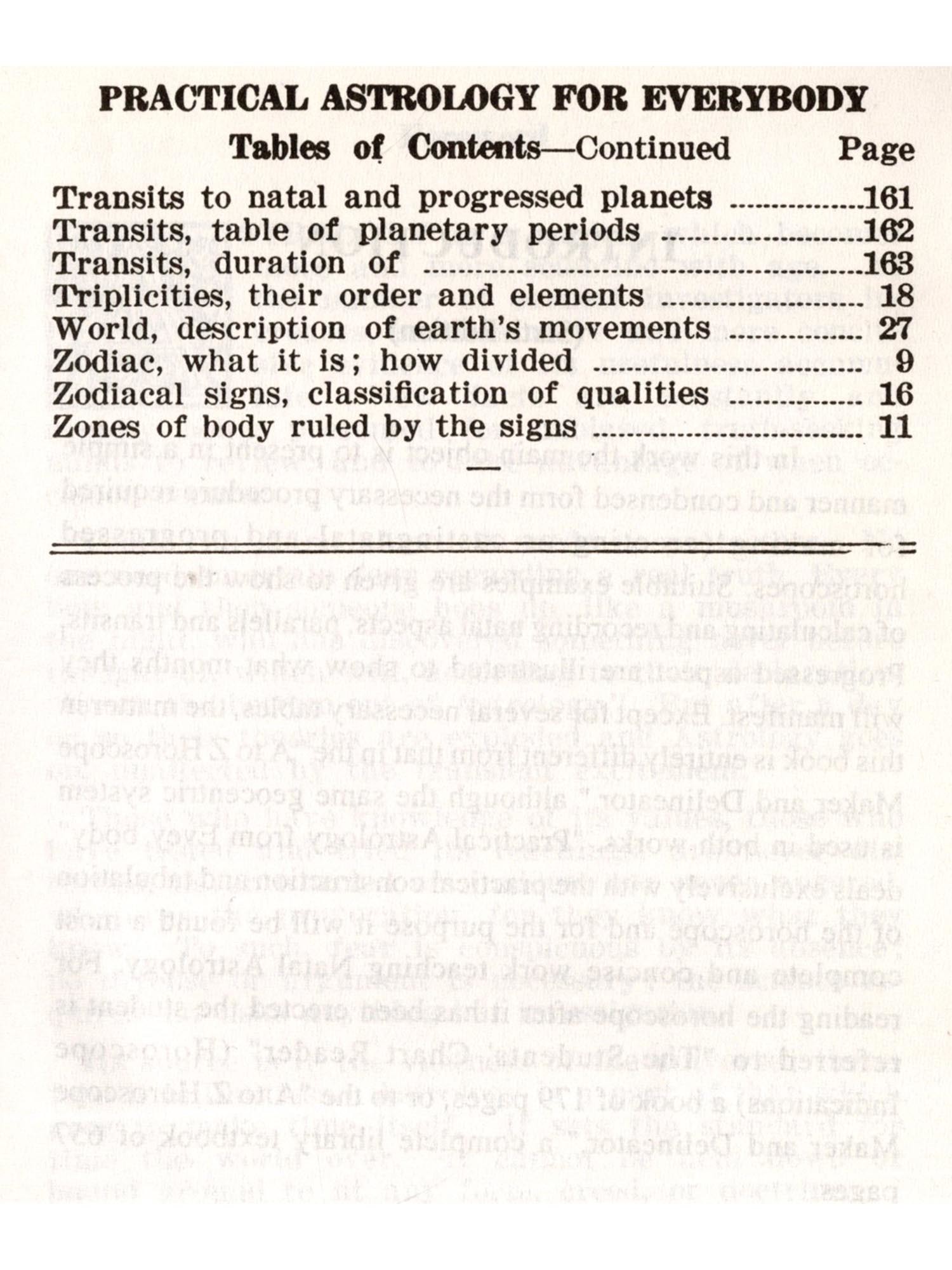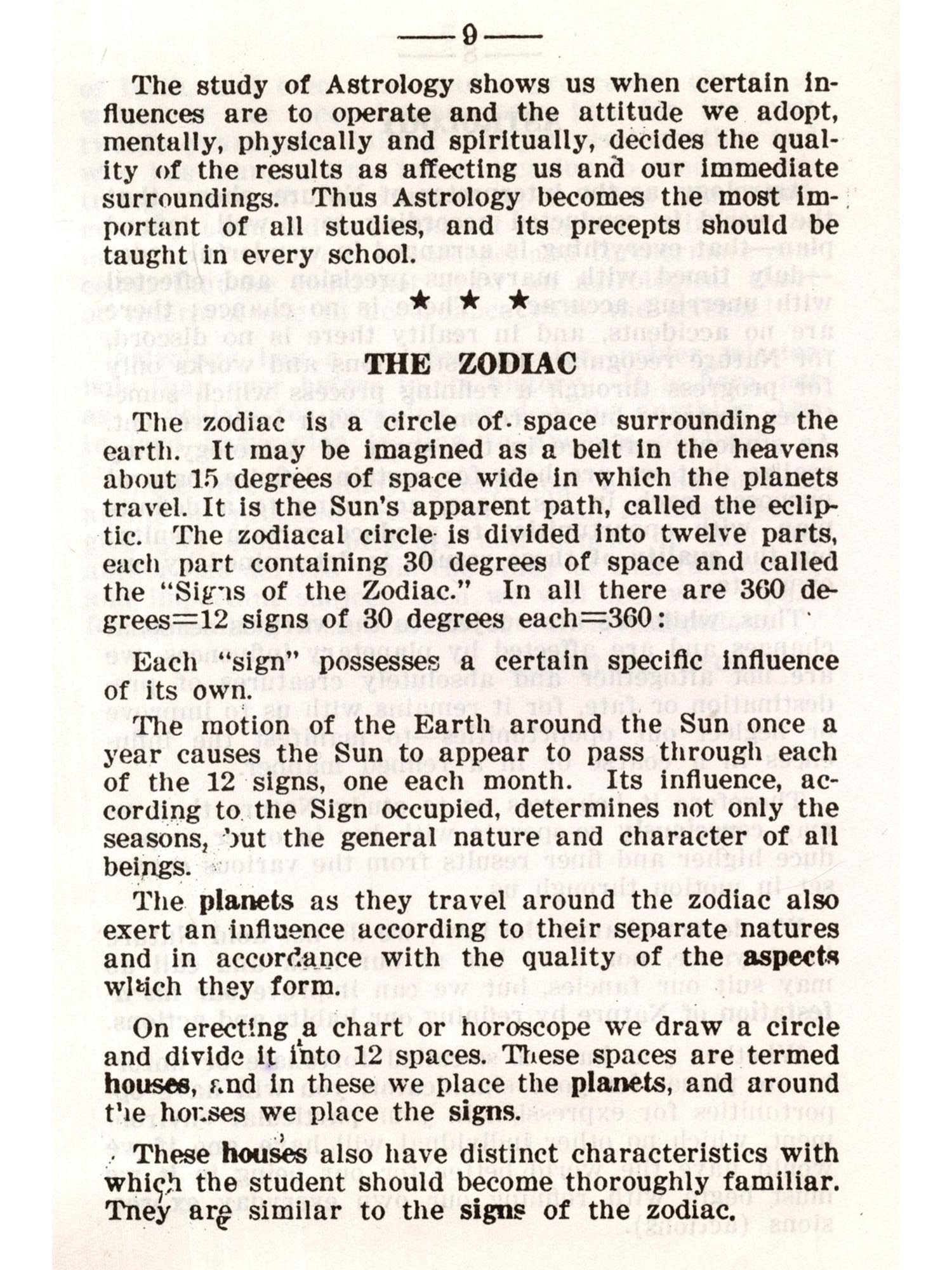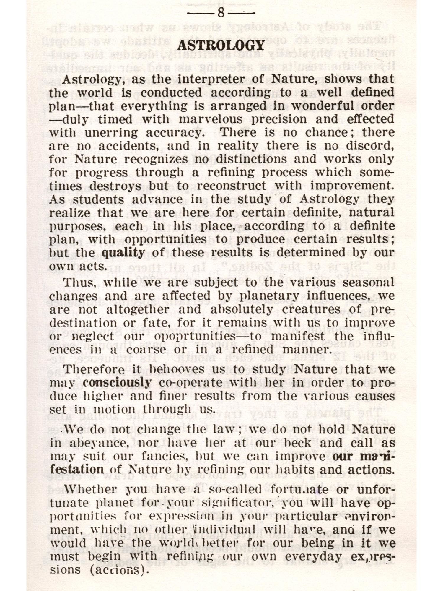 Astrology is the ancient art or science of divining the fate and future of human beings from indications given by the positions of the sun, moon, planets, and the stars. The study of astrology and the belief in it, as part of astronomy, is found in a developed form among the ancient Babylonians. Directly or indirectly. through the Babylonians, it spread to other nations. It came to Greece about the middle of the fourth century B.C., and reached Rome before the opening of the Christian Era. In India and China, astronomy and astrology are largely reflections of Greek theories and speculations. Astrology was actively cultivated in the region of the Nile during the Hellenistic and Roman periods. Astrology was further developed by the Arabs from the seventh to the thirteenth century, and in the Europe of the fourteenth and fifteenth centuries, astrologers were dominating influences at Court. Starting with the indisputable fact that man's life and happiness are largely dependent upon phenomena in the heavens, that the fertility of the soil is dependent upon the sun shining in the heavens as well as upon the rains that come from the heavens and that, on the other hand, the mischief and damage done by storms and inundations are to be traced likewise to the heavens - small wonder is it that a perfect theory has been developed, a theory of a complete accord between phenomena observed in the heavens and occurrences on earth. Such a theory is here developed, and made applicable to the individual. Indeed the latter half of the book is so simply and clearly written that the reader may cast his own horoscope. This book renders a further service by giving the reader a greater knowledge of the twelve types of people, their qualities and their faults. By knowing these characteristics, one can be more tolerant with his fellow-men appreciate their virtues and have patience with their weaknesses. Personally practiced, astrology assists one to reach his goal.