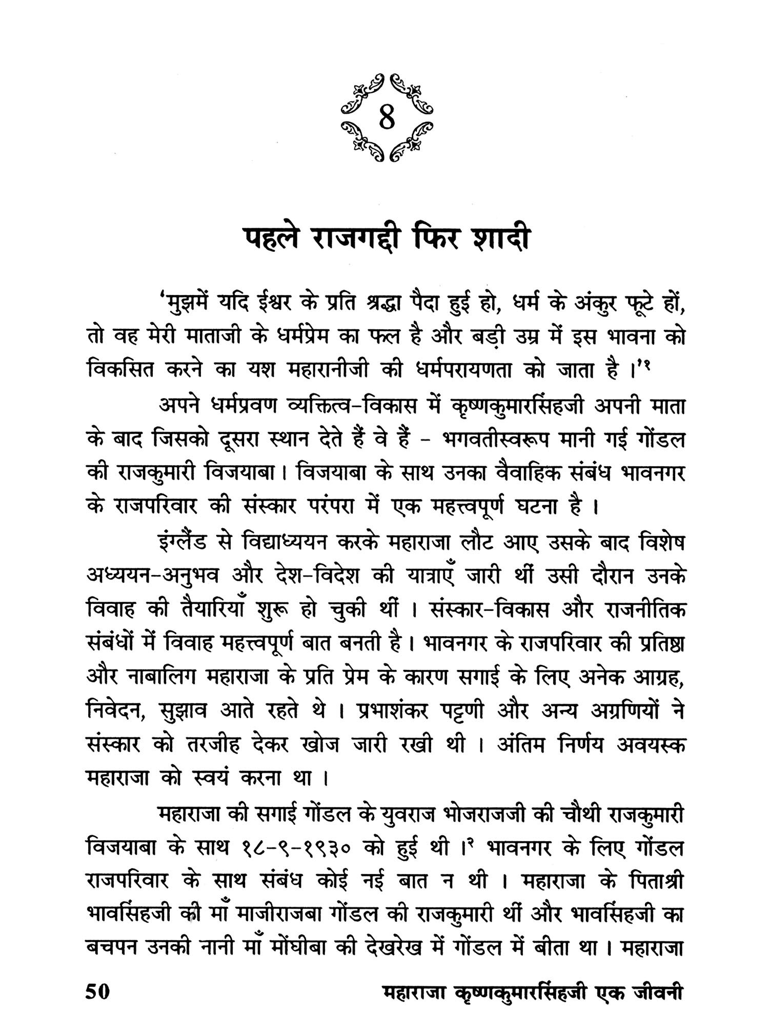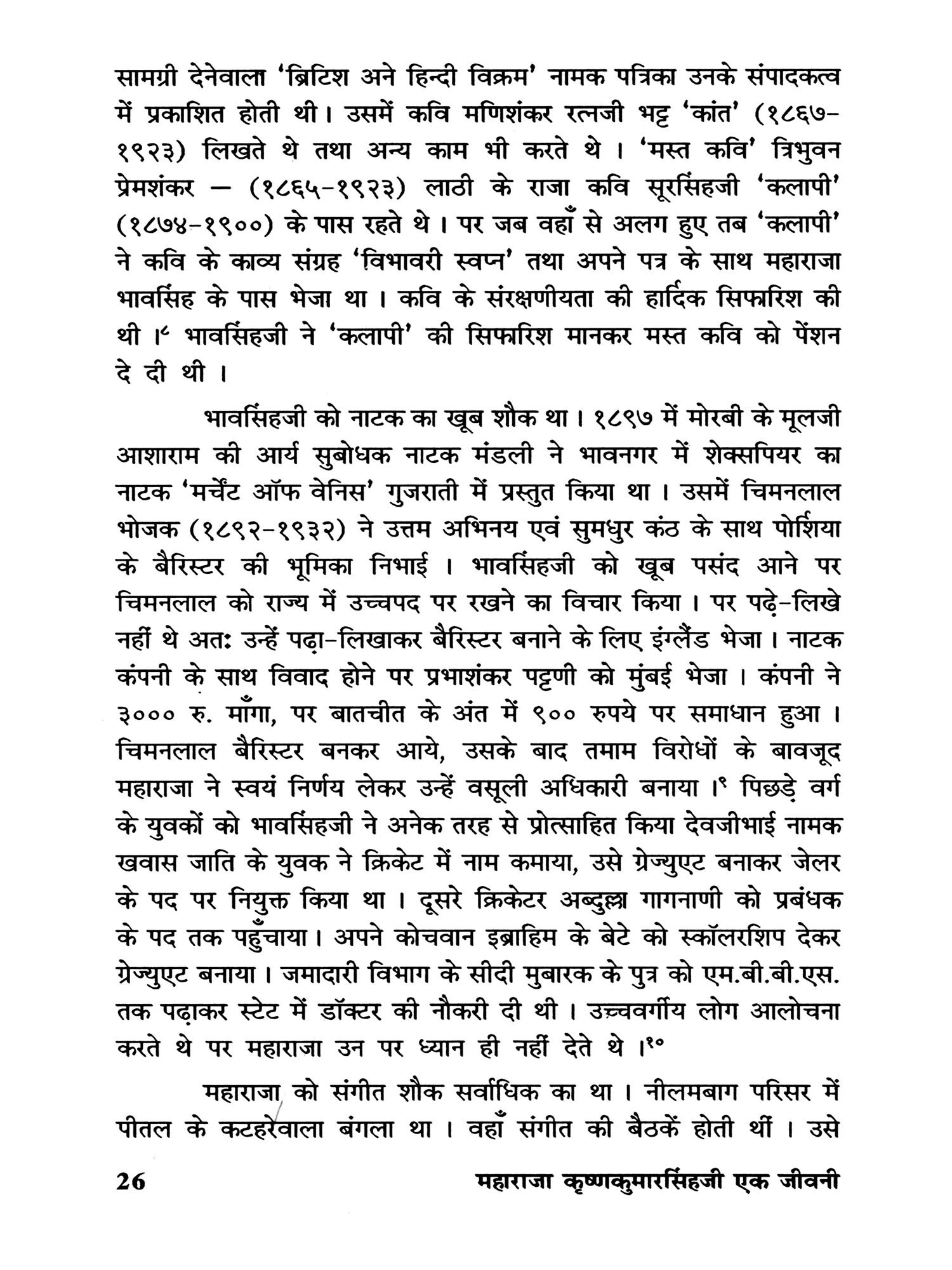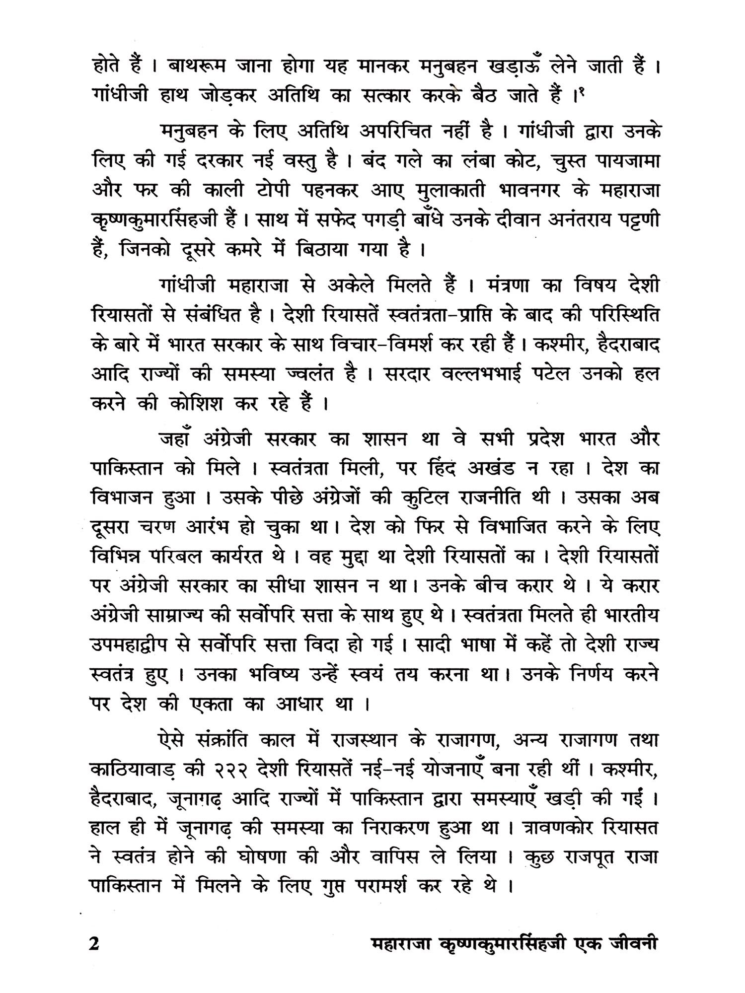 यहाँ तो महाराजा की जीवनकथा का समय एकदम निकट अतीत का है। मेरे जैसे बहुत से लोगों ने उन्हें देखा, जाना और सुना है। उनके बारे में कोई पुस्तक नहीं लिखी गई है, फिर भी लेख तथा संस्मरण के रूप में बहुत कुछ प्रकाशित हुआ है। वर्षों तक महाराजा के निकट साथी रहे किरीटसिंहजी गोहिल ने उनके बारे में चार लेख लिखे हैं। उनमें निहित अहोभाव एक ओर रख दें, तो भी उनमें महाराजा के आंतरिक व्यक्तित्व की अनेक झाँकियाँ मिलती हैं। भावनगर समाचार के संपादक जयंतिलाल मोरारजी मेहता द्वारा लिखित 'महाराजा कृष्णकुमारसिंहजीनो राज्याभिषेक अने लग्न' तथा 'छेल्ली मुसाफिरी' (अंतिम यात्रा) पुस्तकों में भी महाराजा के व्यक्तित्व का प्रतिबिंब अंकित है। प्रकृति के विषय में ग्रंथ लिखनेवाले मुकुंदराय वी. पाराशर्य, 'लाइफ विद एन इंडियन प्रिंस' के अमेरिकी बाजदार लेखक क्रेगहेड बंधुओं इत्यादि ने महाराजा के जीवन के अनेक प्रसंगों को आलेखित किया है। महाराजा की सबसे छोटी राजकुमारी रोहिणीदेवी जाडेजा ने संतों के जीवन प्रसंगों को आलेखित करनेवाली पुस्तक 'अलखना ओवारेथी' (अलख के घाट से) प्रकाशित की है। और उन्होंने मुझे महाराजा के अनेक संस्मरण लिखकर भेजे हैं। छोटे राजकुमार शिवभद्रसिंहजी सहित महाराजा के संपर्क में रहनेवाले अनेक लोगों के साथ मैंने मुलाकात साक्षात्कार किया है। कई लोगों ने मुझे पत्रों द्वारा प्रसंग तथा जानकारियाँ भेजी हैं। महाराजा के शासनकालीन अनेक ऐतिहासिक संदर्भ उपयोगी सिद्ध हुए है। राज्यपाल के रूप में महाराजा के मद्रास के कार्यकाल के उनके निजी कार्यालय में सुरक्षित अंग्रेजी दैनिकों The Hindu तथा Indian Express के समाचारों की कटिंग्स की पुस्तिका मूलभूत विवरणों में उपयोगी सिद्ध हुई है। अनेक प्रसिद्ध लेखकों ने अपने स्तंभों, लेखों और संस्मरणों में महाराजा के विषय में सुने हुए प्रसंगों का वर्णन किया है, उनका भी संभव हो सका है उतना उपयोग मैंने किया है। इन सबको जीवनचरित्र में गूंथने काम कसौटी करनेवाला था। उसमें कितना सफल हुआ हूँ यह तो सुज्ञ पाठक ही कह सकेंगे ।