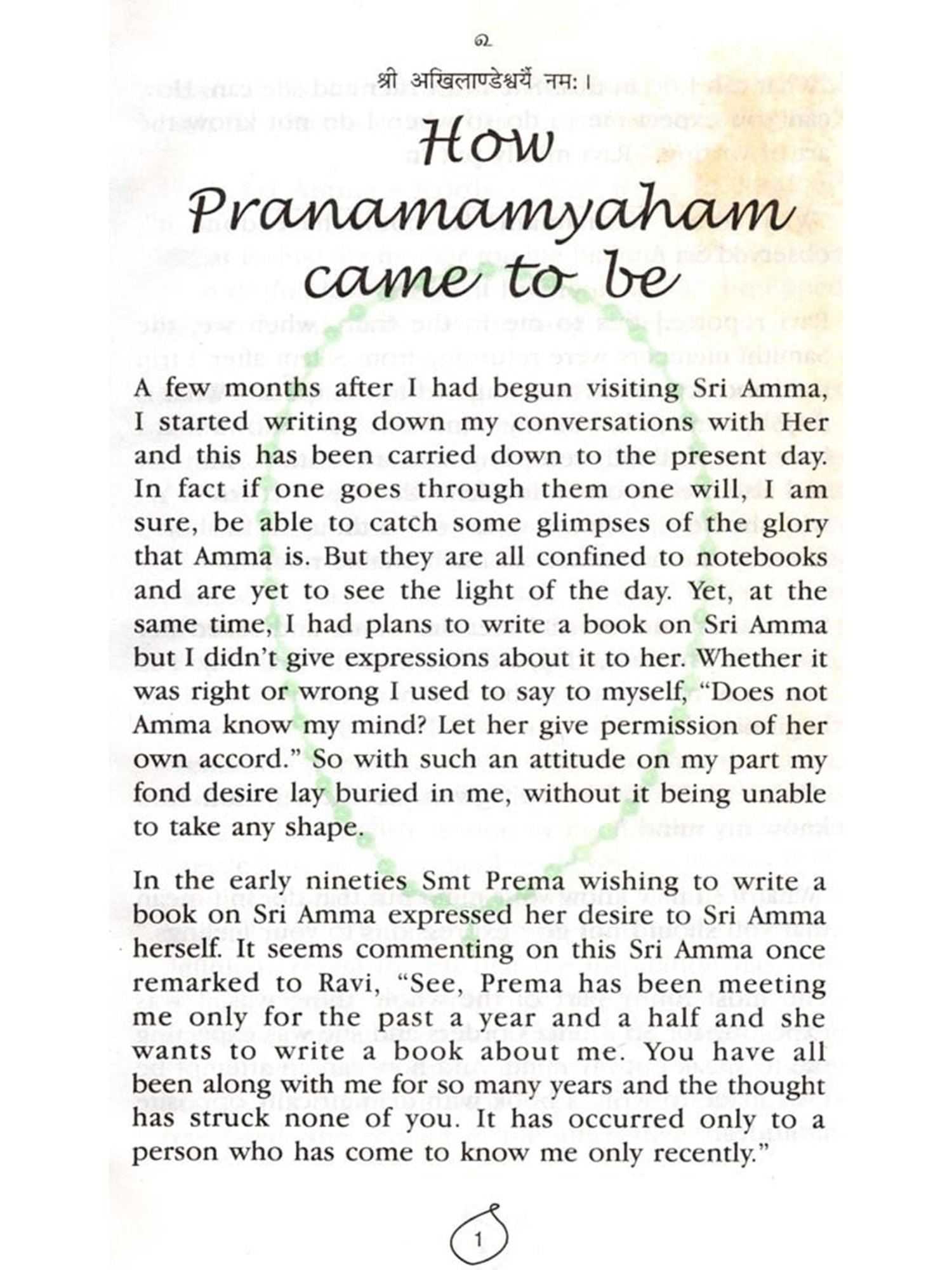 Before proceeding with this readers are requested to go through my first book Pranamamyabam' if they have not already done so, so that they can understand and appreciate this better. Those who have already read my first book are requested not to expect the same stuff bere, for this is more about certain qualities and innate traits of Sri Amma. I have presented certain details which bave been left out in my previous book and also added certain incidents that happened after its publication. In certain places I would have been autobiographical but that couldn't be helped. I have tried my best to give a true account of Sri Amma which my small mind could comprehend and that too within its capabilities. I treat this more as a worship to Sri Amma than any account of Hers and with all the efforts I have put in I feel that I have not done full justice. No, it cannot be done.