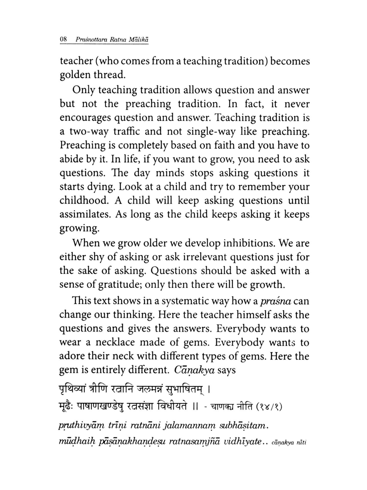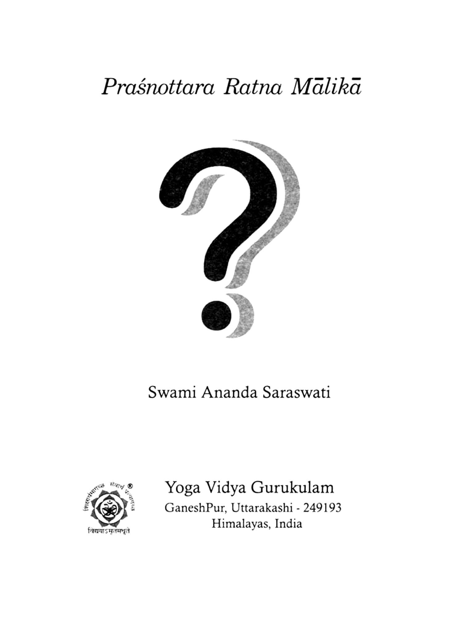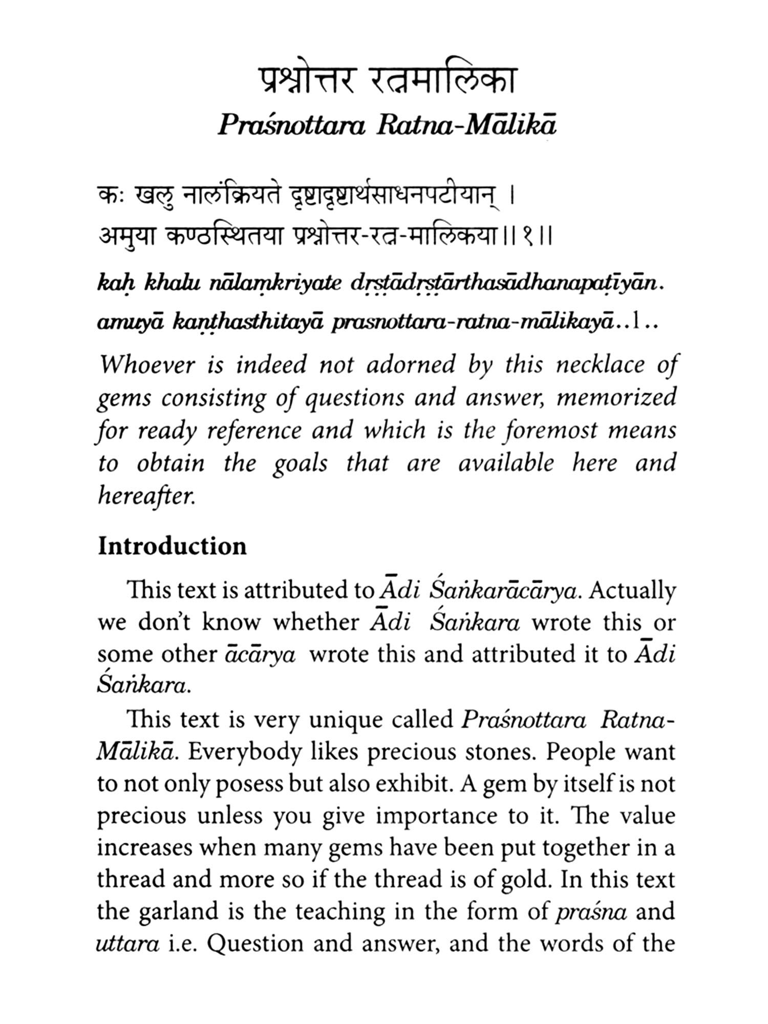 Prasnottara Ratna Malika is one such gem of Adi Sankaracharya. This work contains answers to common questions that will arise in one's mind about the right and wrongs and provide the best solution for leading one's life in a truthful and honest manner. The ultimate objective of this work is to help a common man in crossing the samsara sagara (the ocean of worldly, materialistic life) and to show him the path of attaining liberation.