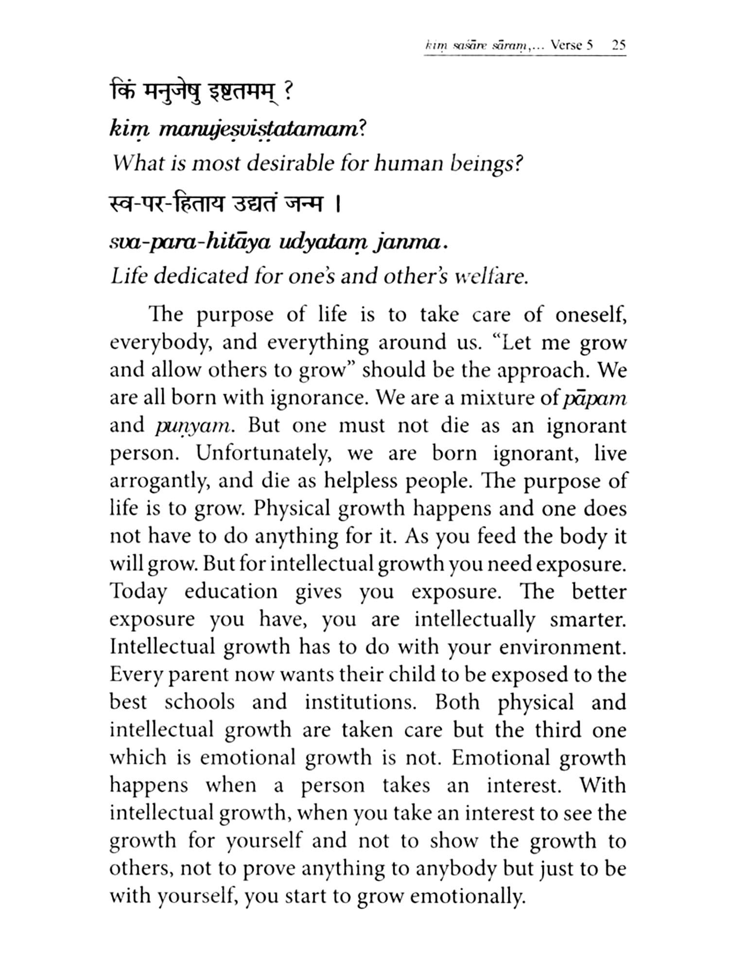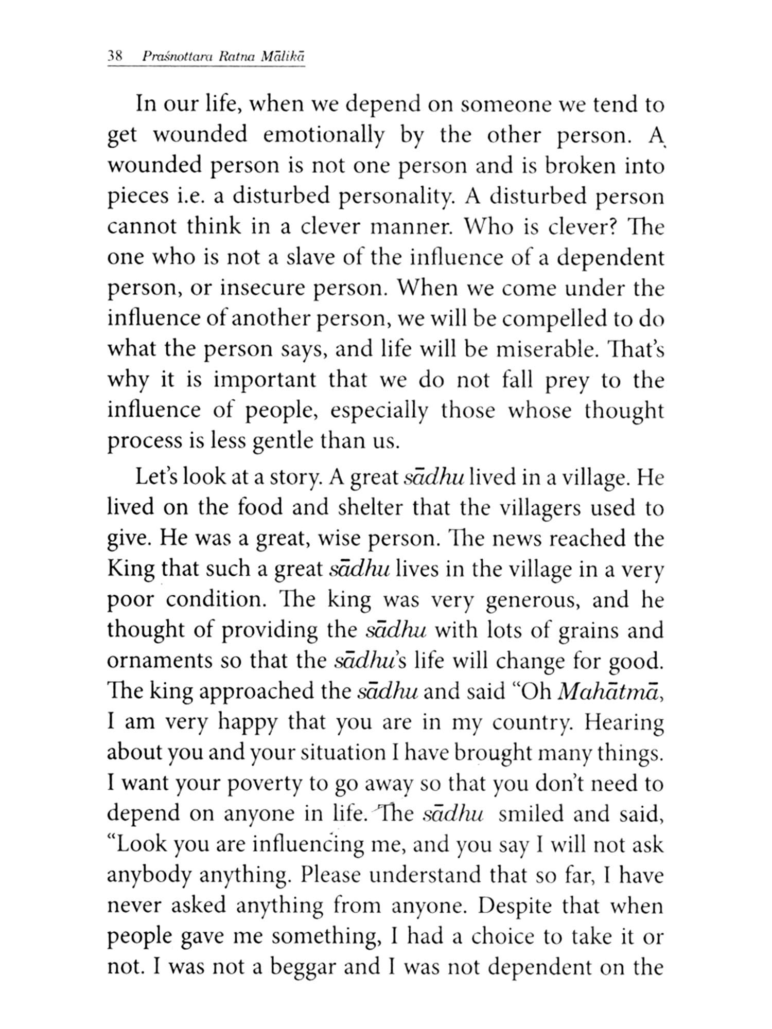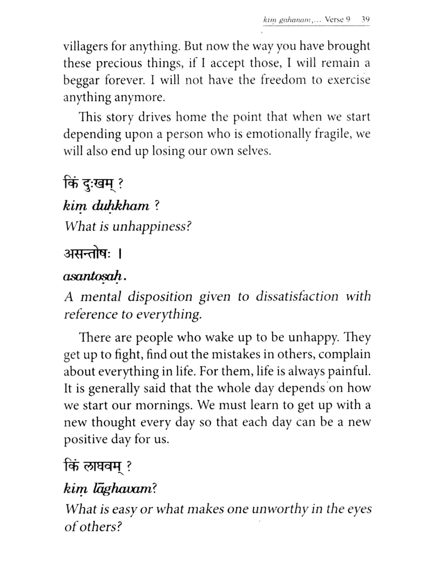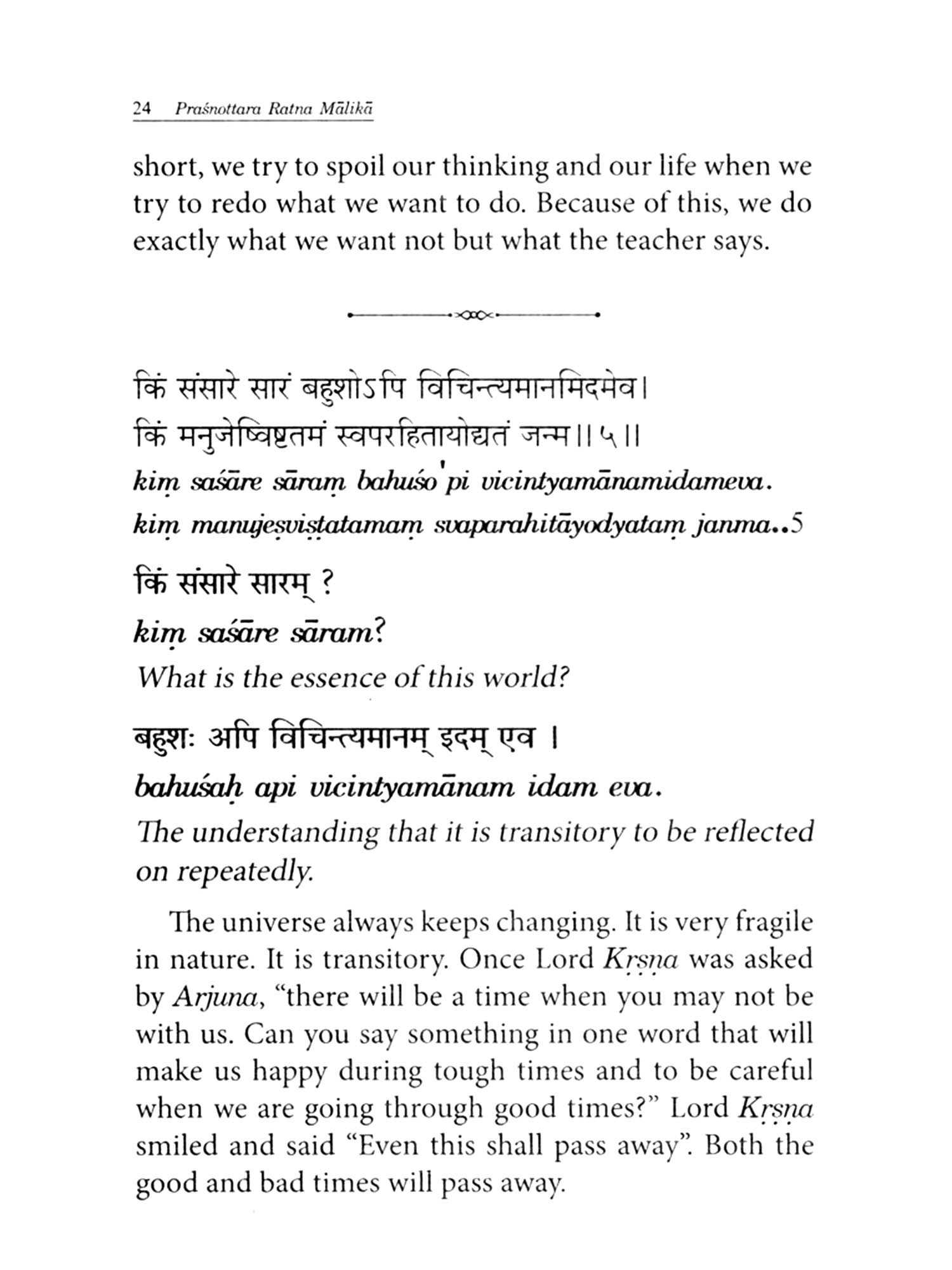 Prasnottara Ratna Malika is one such gem of Adi Sankaracharya. This work contains answers to common questions that will arise in one's mind about the right and wrongs and provide the best solution for leading one's life in a truthful and honest manner. The ultimate objective of this work is to help a common man in crossing the samsara sagara (the ocean of worldly, materialistic life) and to show him the path of attaining liberation.