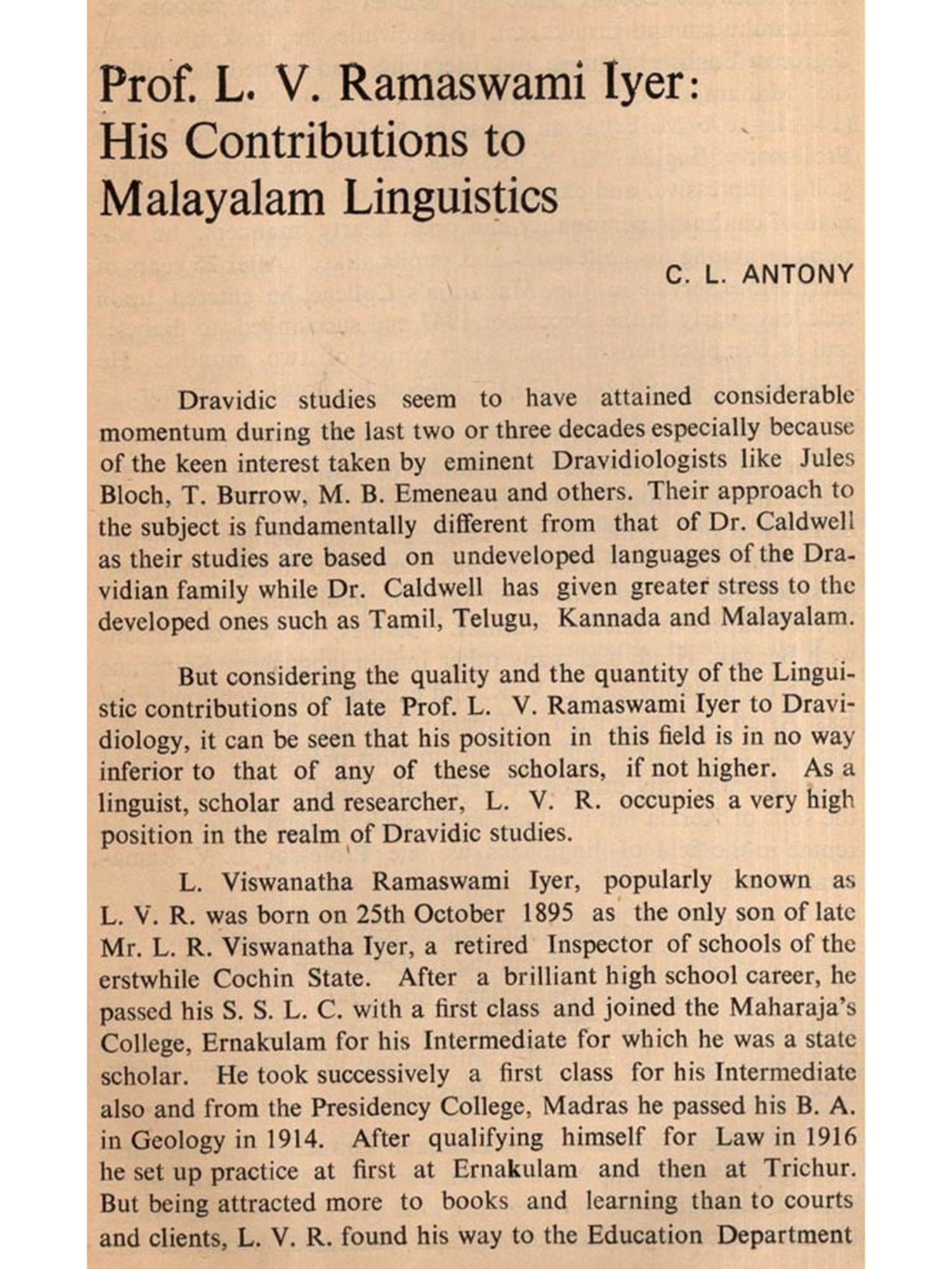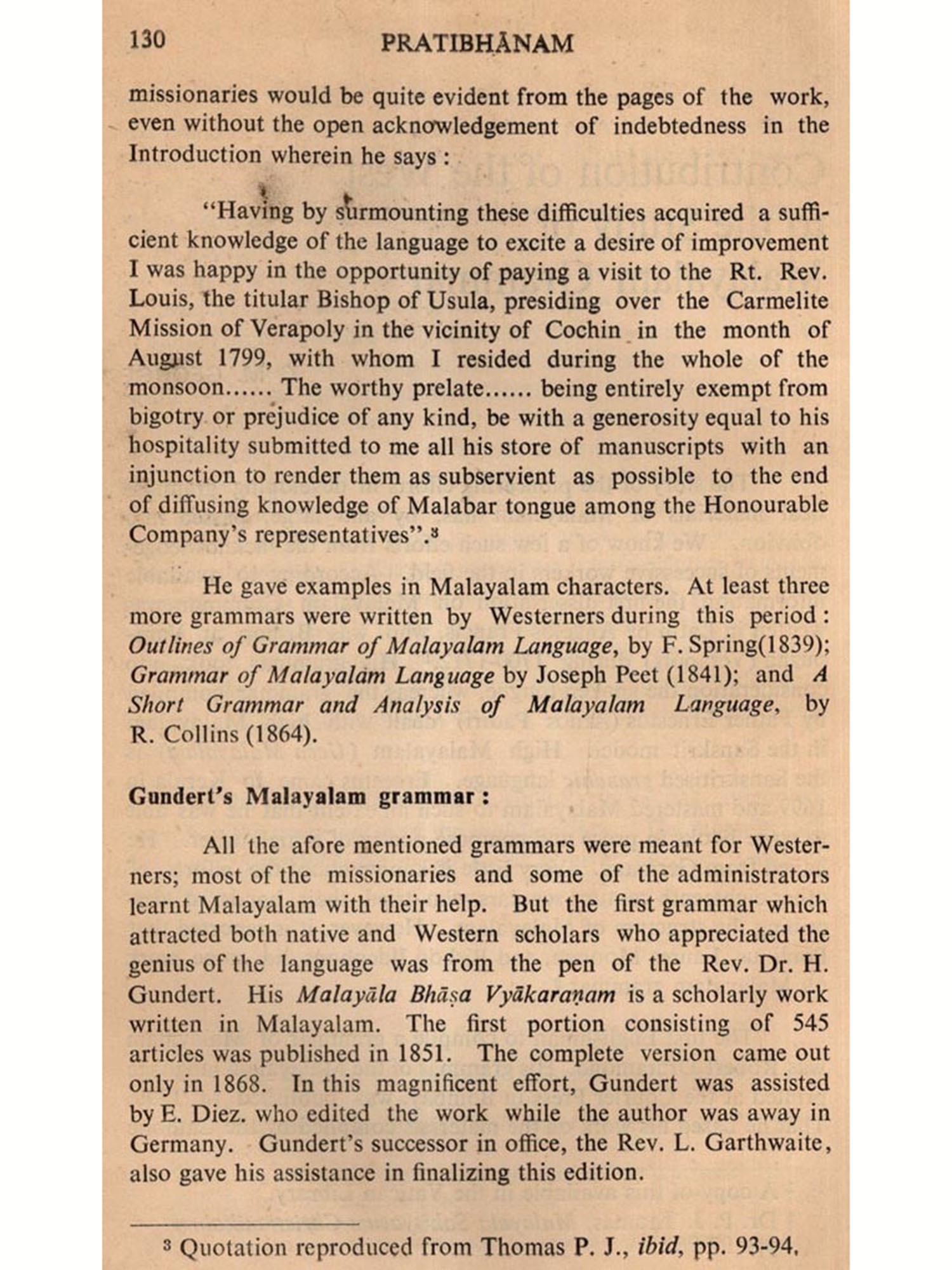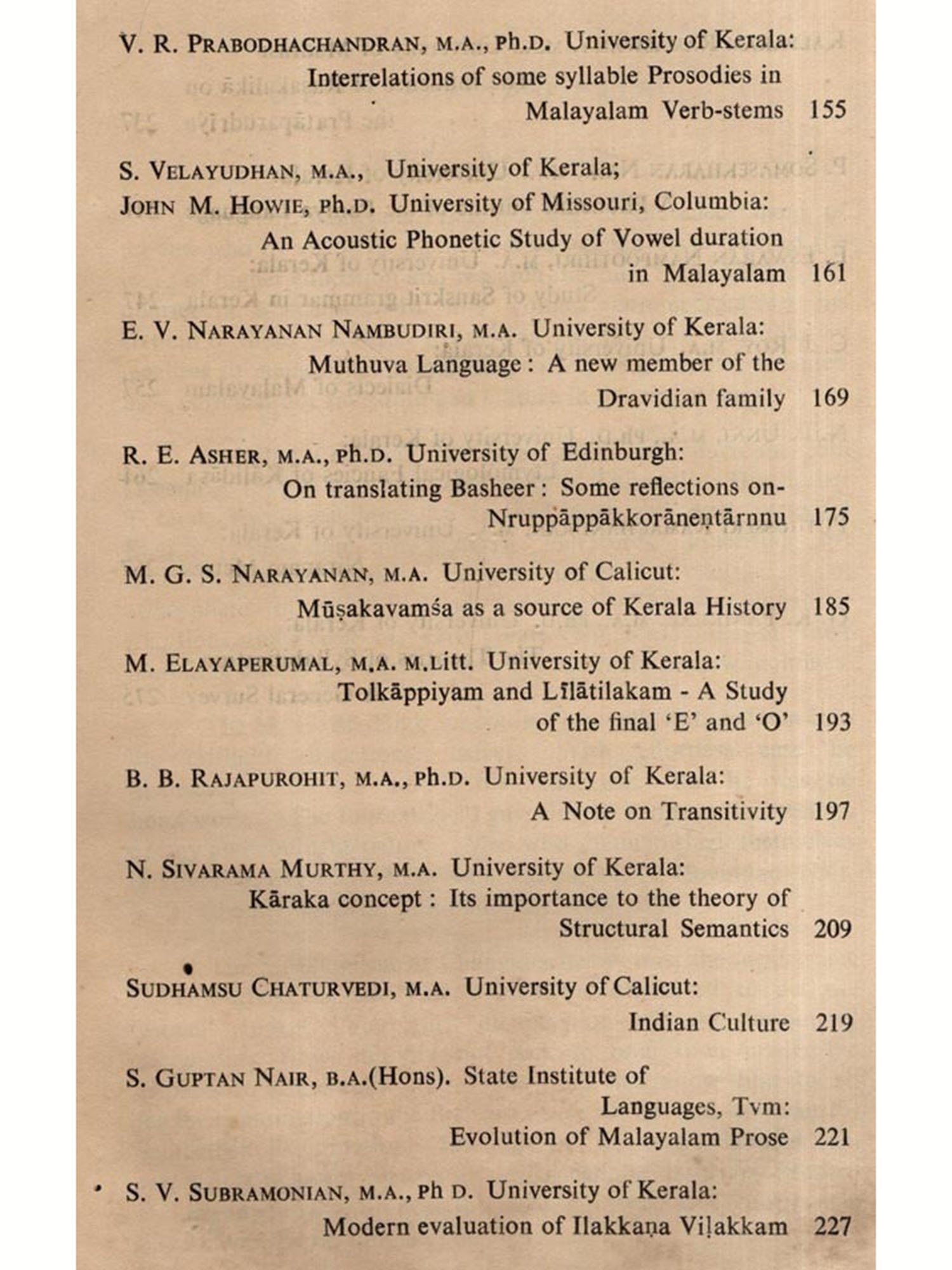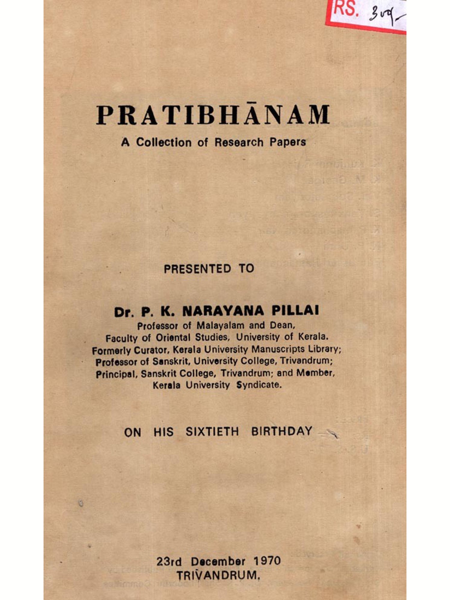 It is only in the fitness of things that his students, friends and admirers decided to commemorate his sixtieth birthday. A committee of prominent public men, educationists and men of letters of Kerala under the presidentship of Shri P. S. George, President, Kerala Granthasala Sangham, was organised at a public meeting held at the Y. M. C. A. Hall, Trivandrum, in this connection on 25th May 1970 and a programme was chalked out to create an endowment in the University of Kerala in the name of Dr. Pillai, to publish a commemoration volume of research papers each in English and Malayalam; to unveil a portrait of Dr. Pillai in his parent department and to organise a public meeting to felicitate him on the eve of his Shashtipoorthi for presenting him with the volumes. The present volume of research papers with the significant nomenclature PRATIBHANAM marks the fulfilment of a phase of the programme.
