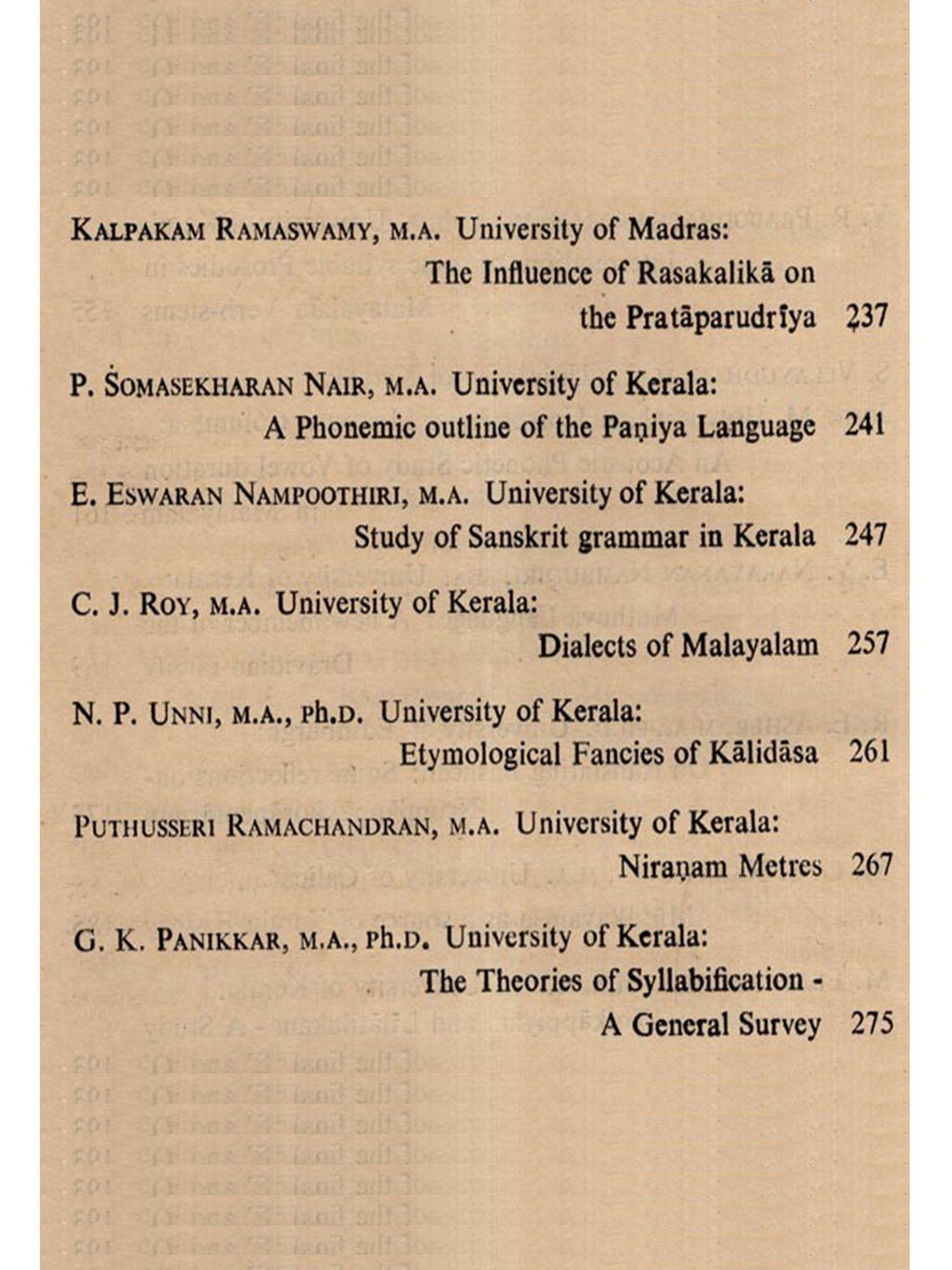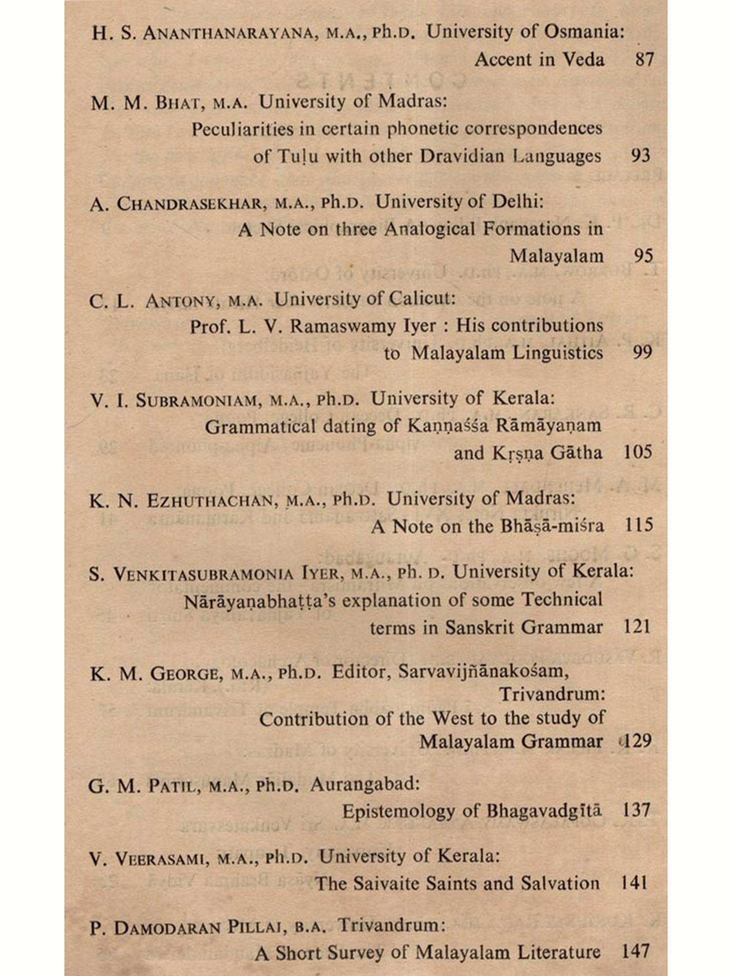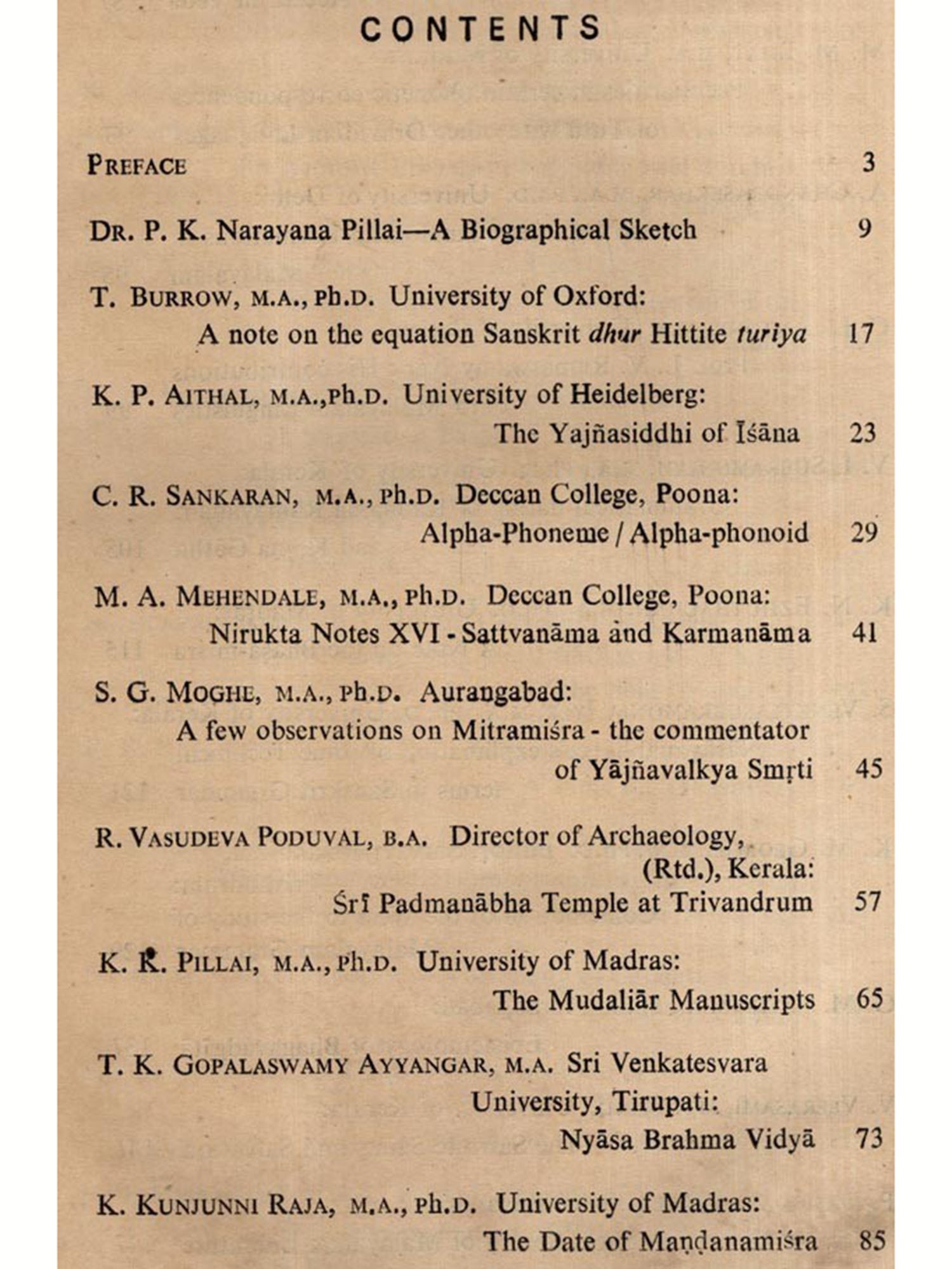 Dr. Pillai is traditional, in the true sense, yet he is modern. And the one significant aspect that marks him out from the general stream is this happy synthesis between the traditional and the modern outlooks. He has drunk deep at the perennial springs of Vedic scholar ship; equipped with the insight acquired through constant and systematic contact with the methodology of classical scholarship, he approaches problems of contemporary interest; and here, his analytic mind and scientific training stand him in good stead. Dr. Narayana Pillai, at the age of sixty, stands as a shining example of what a researcher could do in the context of the ever-widening vistas of contemporary scholarship.
