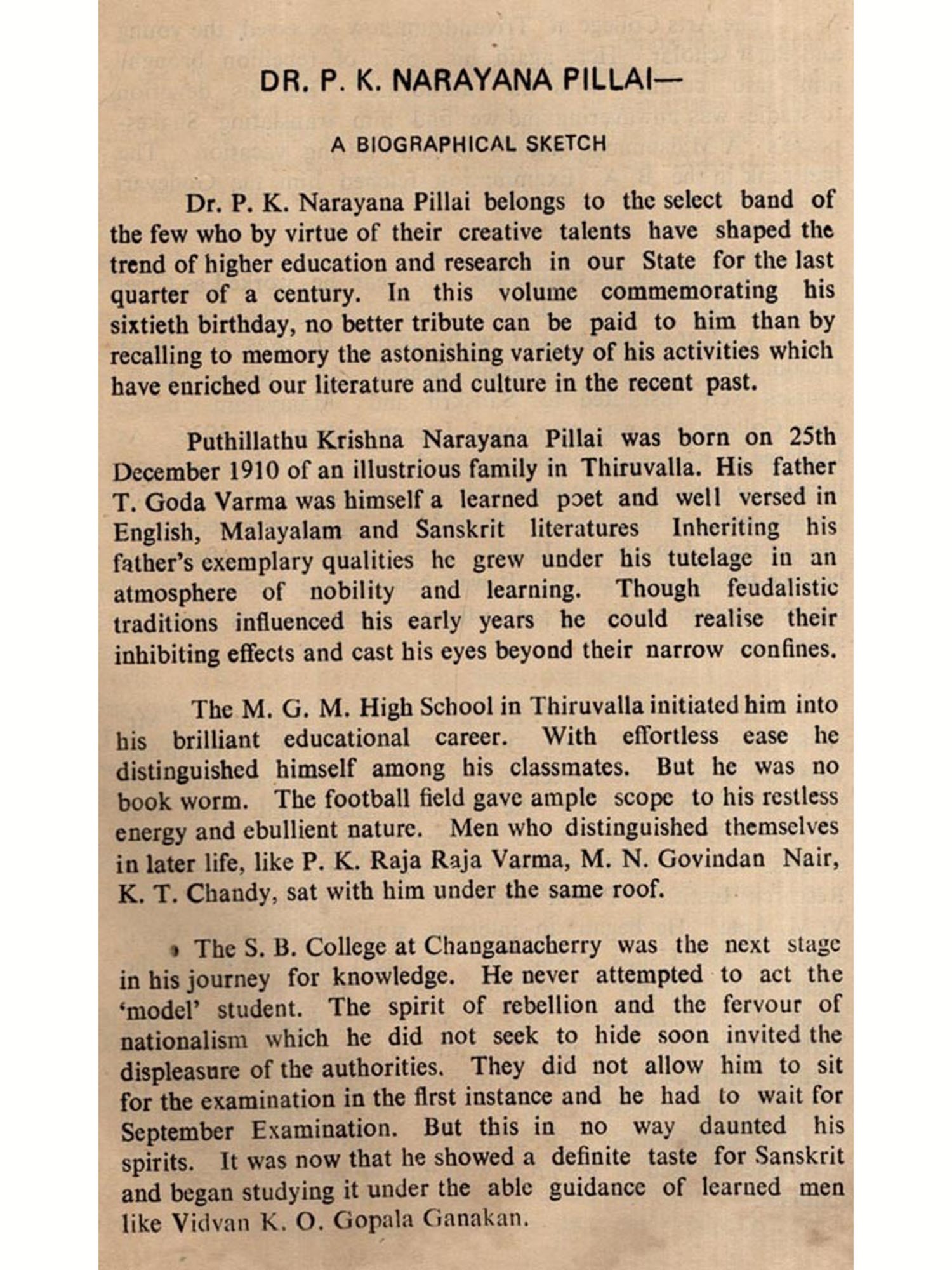 Dr. P. K. Narayana Pillai is sixty today. Endowed with intellectual qualities of a rare order and a sense of total dedication to academic pursuits, Dr. Pillai has held aloft the torch of sound scholarship through decades of unremitting endeavour. His has not been a rosy path; often he had to play the role of a pioneer and path-finder; and there is no gainsaying the fact that he has scored remarkable success in his chosen field.