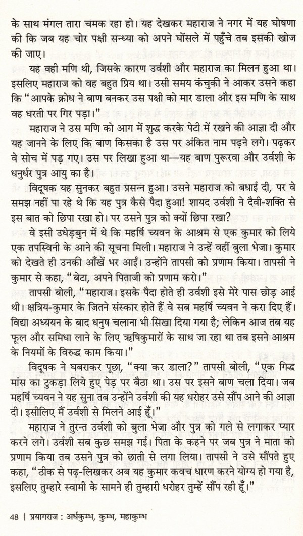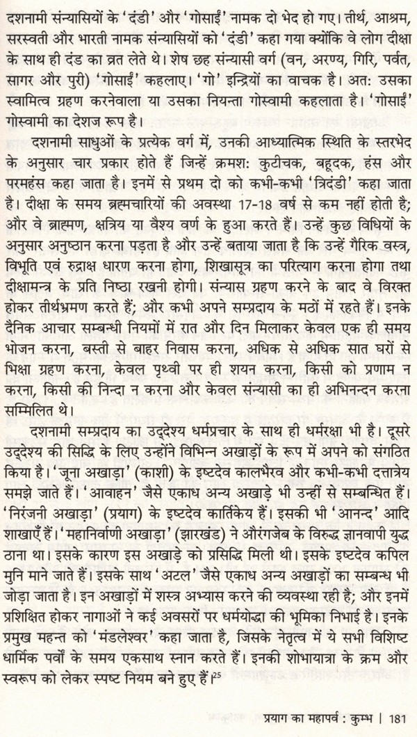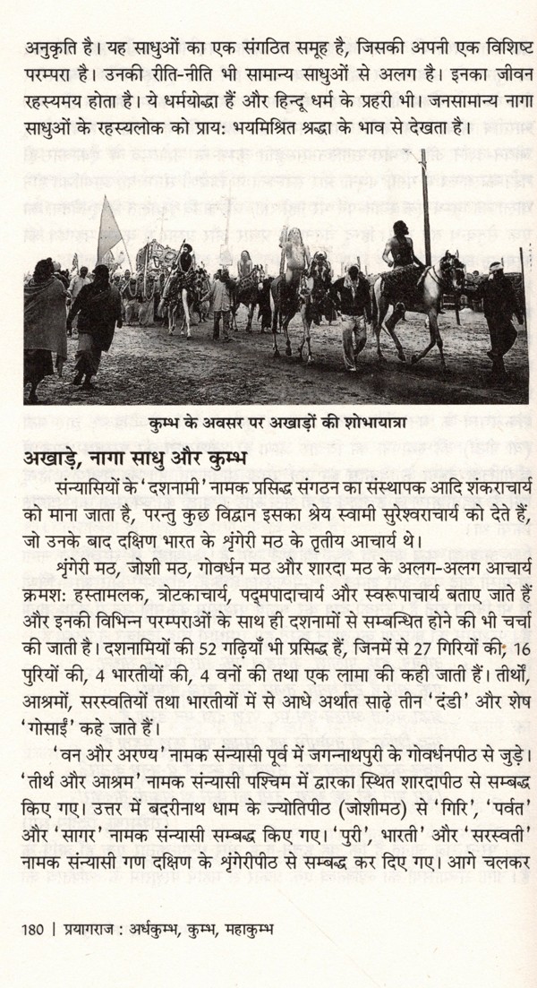 जहाँ कहीं भी देवनदी के एक से अधिक प्रवाह एक साथ मिलकर बहने लगते हैं, तो धाराओं का वह मिलन-स्थान 'प्रयाग' बन जाता है। हिमालय क्षेत्र में पंचप्रयाग तीर्थ ऐसे ही बने हैं। परन्तु इलाहाबाद में गंगा, यमुना और अदृश्य सरस्वती की तीन धाराओं के मेल से वह मिलन-स्थान तीर्थोत्तम और 'प्रयागराज' बन गया है। यहाँ प्रतिवर्ष माघ स्नान के लिए, प्रति छह वर्ष पर अर्धकुम्भ स्नान के लिए, प्रति बारह वर्ष पर कुम्भ स्नान के लिए और प्रति 144 वर्ष पर महाकुम्भ स्नान के लिए असंख्य लोग आते हैं। भाषा, जाति, प्रान्त आदि के भेदों को भुला कर एक जन-समुद्र उमड़ आता है। कुम्भ मेला व्यक्तियों का ही संगम नहीं कराता, बल्कि वह भारतीय भाषाओं और लोक-संस्कृतियों का संगम भी बन जाता है।