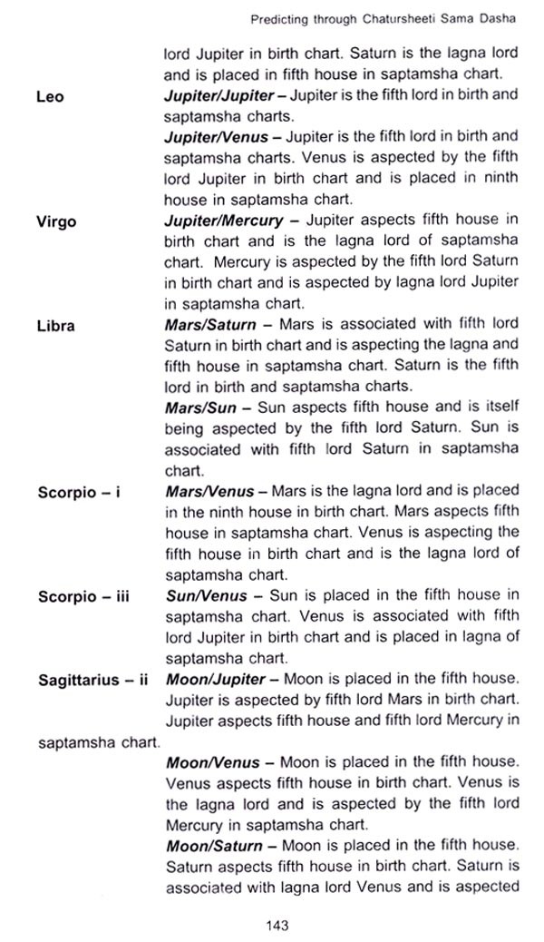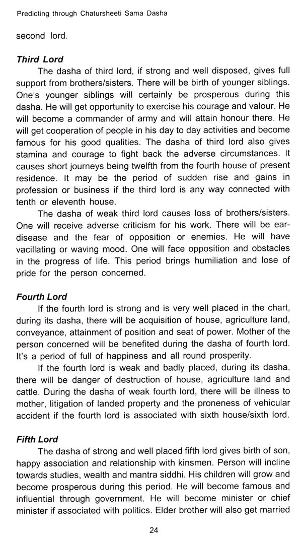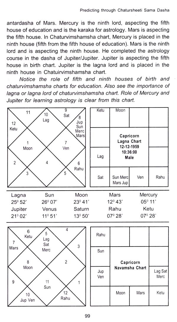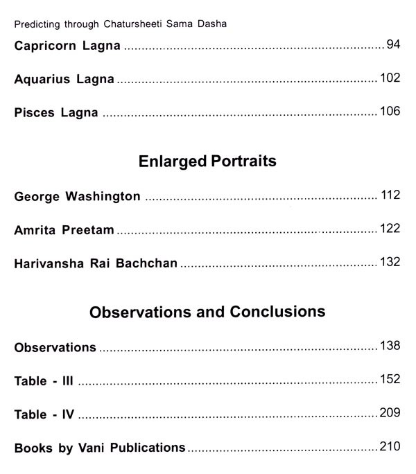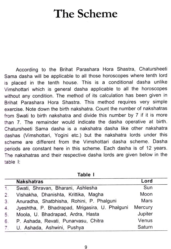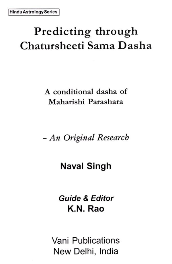 This is the second book on conditional dashas of Maharishi Parashara. Shri Manoj Pathak under the guidance of Shri K.Ν. Rao has published first research on a conditional dasha. As far as the utility of Parashara's conditional dashas are concerned, no research work has been published on the subject by the scholars of astrology before the publication of Shri Manoj Pathak's book "Predicting through Dwisaptati Sama Dasha". His book is a landmark in the field of timing of events and opens new vistas for further researches in other conditional dashas. Shri Pathak has inspired me to write a book on Chatursheeti Sama Dasha, a conditional dasha of Maharishi Parashara. The Chatursheeti Sama dasha will be applicable to all those horoscopes in which tenth lord is placed in the tenth house. The Maharishi Parashara, the father of Hindu astrology gave us this dasha and many more. I am only a student who experimented on it in the researches, individual and collective being done in the Institute of Astrology, Bhartiya Vidya Bhavan, New Delhi under the guidance of Shri K.N. Rao.