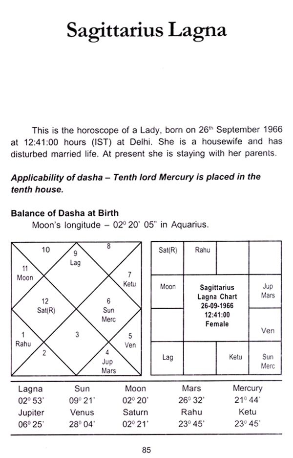 The beauty of Hindu astrology is hidden in its yogas and dasha systems. The yogas in a horoscope indicate the existence of a promise that needs dasha for its fructification. The dasha scheme is the wheel of time which translates the promise of a horoscope into an event. The presence of powerful yogas in a horoscope becomes meaningless if the proper dasha does not come in right time. That is why it is said that a weak horoscope with excellent dasha sequence is far better than a strong horoscope with poor dasha sequence. It is the role of dasha only which decides the occurence of an event. Therefore, Maharishi Parashara has given us so many dashas (general or conditional dashas) for timing an event. General dashas are the dashas that can be applied to all the horoscopes without any need for a specific condition to exist in a chart while conditional dashas are applicable to only those horoscopes, which fulfil certain conditions as per the planetary combinations in a horoscope. Majority of astrologers only use Vimshottari dasha for predictions. In some parts of the country, Ashttotari dasha is used. Astrologers of Himalayan region are using Yogini dasha and Varshaphal for predictions. Now a question arises if Vimshottari dasha can alone fulfil our requirements. If so, why has Maharishi Parashara given us so many dashas? In this regard Shri K.N. Rao says that the use of Vimshottari dasha only for predictions, as many astrologers do, is a case of astrological poverty, technical deficiency and an avoidable defect. Other dashas should be used along with Vimshottari dasha to make predictive techniques meaningful and effective. Any specific law or rule given by the Maharishi Parashara for a specific horoscope has to be applied if we want to improve our predictive ability or make the analysis scientific. To understand a law, one has to study number of various phenomena, one has to study the interrelation between them, for the law is never separate from the phenomena. Keeping this fact in mind and being a science postgraduate, I planned to write this book as I have seen scientific basis behind the principles given by our sages. Our sages formulated these principles based on their studies and observations. They were the real scientists of their eras. Now this is our duty to do research on these principles like we do experiments in a science laboratory based on the principles given by scientists.