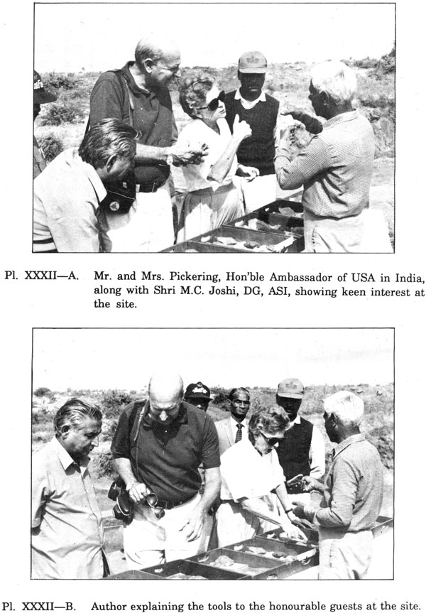 As the working days available were few in June, 1991, encouraged by the results of efforts, we again took up the job in November 1992. This was my last assignment in Survey before retirement on 30.11.1992. We were in the site still 26th of November, Struggling to beat time and cover as much area as possible. This times my colleagues S/Shri Ram Saran Superintending Archaeologist, Excavations Branch, New Delhi, I.D Dwivedi, and Asstt. Supdtg Archaeologist, R.K. Verma, Vinod Kumar, Chandrabhan, Charan Singh and Kesar Singh, all of Excavations Branch, New Delhi along with the colleagues from Prehistory Branch S/Shri J.S. Dubey, Pyara Singh, K.M.Girhe, Ghayasuddin, C.L. Yadav and R.G. Katole worked hard to beat the time and reach the target. We succeeded. The discovery attracted so much attention that Mrs. Thomas R. Pickering, Hon'ble Ambassador of U.S.A. to India and Mrs. Pickering visited the site and got so much impressed by the uniqueness of the site and types of tools, the pre-historic environment and our scientific pursuit, that they roamed all over the area for nearly three hours. Apart from our Survey's S/Shri B.R. Rajput, Jang Bahadur Thapa of Times T.V. and Mrs. Ruhi Tabassum Khan, Producer, Mass Communication Research Center, of Jamia Milia-Islamia recorded every detail of our working and the site for projecting to the students and public. The recorded programme was promptly telecast by Doorarshan, New Delhi.