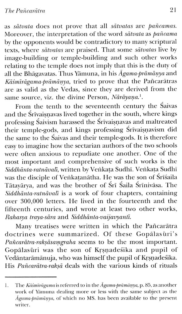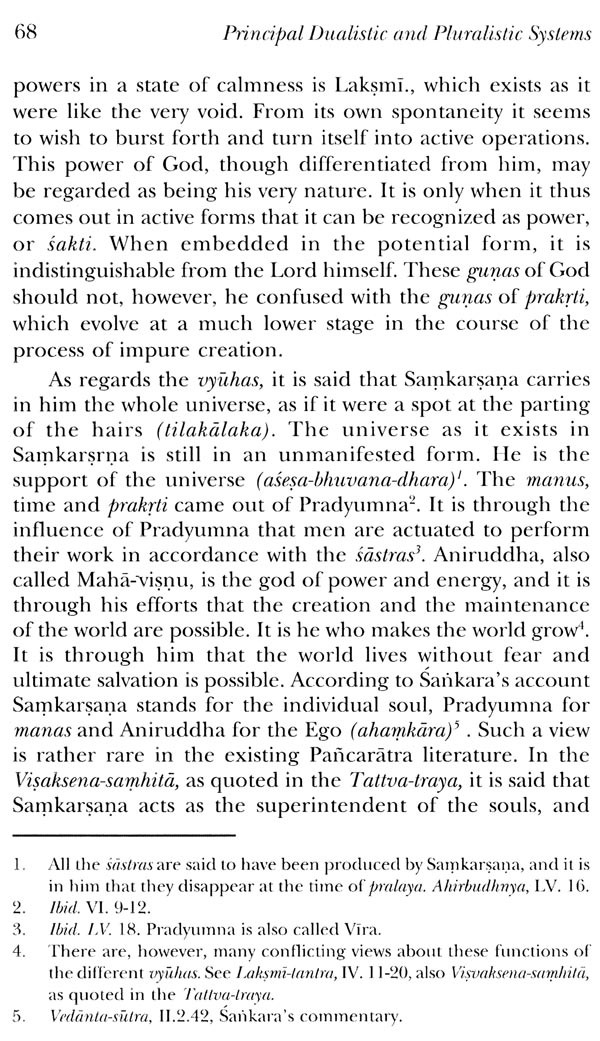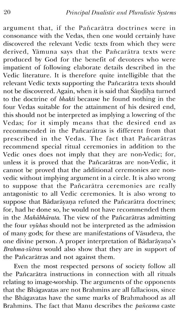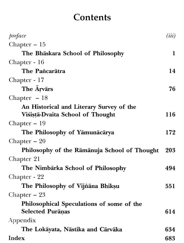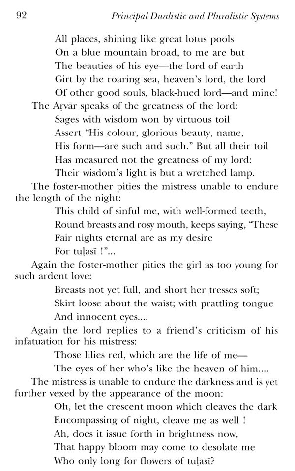 In writing the present volume the author has taken great trouble to secure manuscripts which would present a connected account of the development of theistic philosophy in the South. The texts that have been published are but few in number and the entire story cannot be told without constant reference to rare manuscripts from which alone the data can be collected. So far, no work has been written which could throw any light on the discovery and interpretation of a connected history of Vaisnava thought. It would have been well if the Tamil and Telegu works could have been fruitfully utilized in tracing the history of Vaisnavism, not only as it appeared in Sanskrit but also as it appeared in the vernaculars of the South. But the author limited himself as far as possible to Sanskrit data. This limitation was necessary for three reasons: first, the author was not master of the various vernaculars of South India; secondly, the inclusion and utilization of such data would have made the present book greatly exceed its intended scope; and thirdly, the inclusion of the data from the vernacular literature would not have contributed materially to the philosophical problems underlying the theistic speculations dealt with in this work. Looked at from the strictly philosophical point of view, some of the materials of the present book may be regarded as somewhat out of place. But, both in the present volume and the volume that will follow it, it will be impossible to ignore the religious pathology that is associated with the devotional philosophy which is so predominant in the South and which so much influenced the minds of the people not only in the Middle Ages but also in the recent past and is even now the most important element of Indian religions. Philosophy in India includes not only morality but religion also. The most characteristic feature of religion is emotion or sentiment associated with a system of beliefs, and as such in the treatment of the dominant schools of philosophy that originated in South India one cannot help emphasizing the important pathological developments of the sentiment of devotion. The writer hopes, therefore, that he may be excused both by those who would not look for any emphasis on the aspect of bhakti or religious sentiment and also by those who demand an over-emphasis on the emotional aspect which forms the essence of the Vaisnava religion. He has tried to steer a middle course in the interest of philosophy, which, however, in the schools of thought treated herein is so intimately interwoven with religious sentiment.