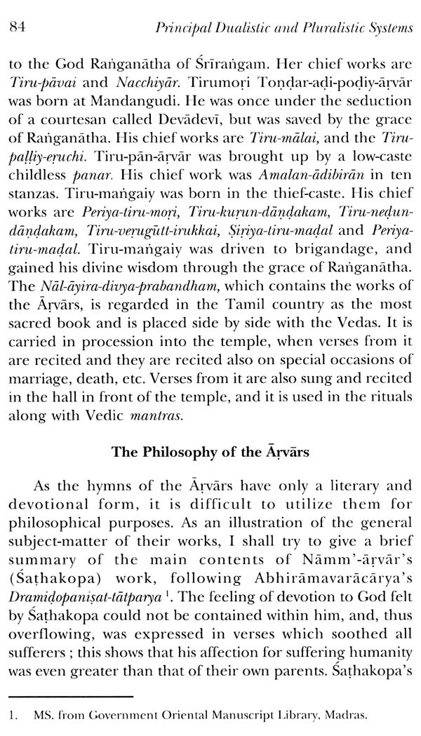 The writer has probably exceeded the scope of his treatment in dealing with the Arvars, whose writings are in Tamil, but there also he felt that without referring to the nature of the devotional philosophy of the Arvars the treatment of the philosophy of Ramanuja and his followers would be historically defective. But though the original materials for a study of the Arvars are in Tamil, yet fortunately Sanskrit translations of these writings either in manuscript or in published form are available, on which are almost wholly based the accounts given here of these Tamil writers.