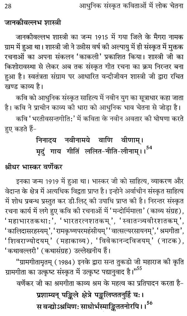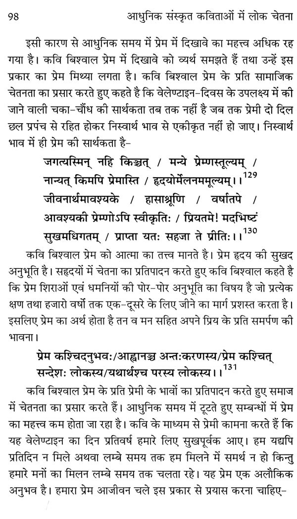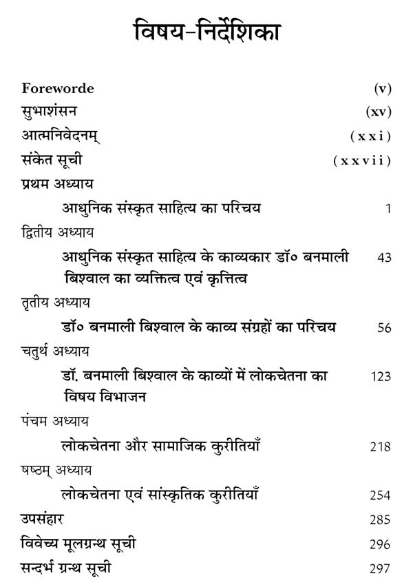 The work is divided into six chapters excluding Introduction (भूमिका) and conclusion (उपसंहार). In the first chapter, Dr. Kusum provides a general introduction to modern Sanskrit literature (आधुनिकसंस्कृतसाहित्य का परिचय). In 2nd chapter of the present book she has appropriately introduced my profile of life and works in general and my Sanskrit Creative writings in particular (आधुनिक संस्कृत साहित्य के काव्यकार डॉ० बनमाली बिश्वाल का व्यक्तित्व एवं कृतित्व). In 3rd chapter she introduces my collections of Sanskrit poetry (डॉ० बनमाली बिश्वाल के काव्यसंग्रहों का परिचय). In fourth chapter one can find thematic classification of लोकचेतना with reference to Prof. Banamli Biswal's poetry (डॉ० बनमाली बिश्वाल के काव्यों में लोकचेतना का विषय विभाजन). Fifth chapter deals with लोकचेतना and social malpractices (लोकचेतना एवं सामाजिक कुरीतियाँ) and the last chapter deals with the cultural malpractices related to लोकचेतना (लोकचेतना एवं सांस्कृतिक कुरीतियाँ) followed by the conclusion containing the findings of the present study.