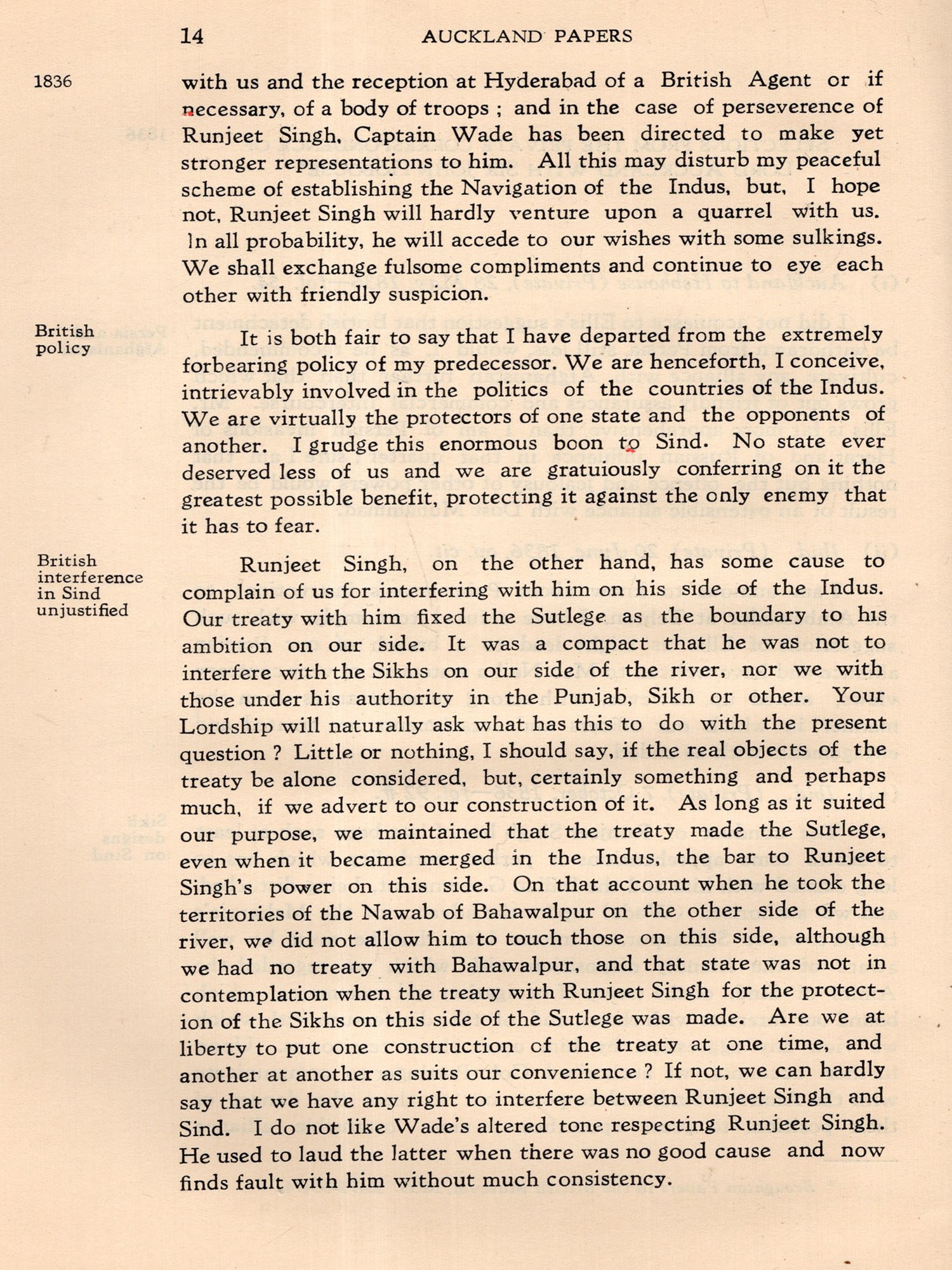 The stray selections from the Auckland Papers (Book 1) furnish information of great value on Sikh diplomacy, persons and politics at Ranjit Singh's Court. Auckland designates the Sikhs "as a swaggering and restive nation, proud of their military strength," and in dealing with the Lahore Darbar, he exhibits British distrust of the Sikh military power; yet he values Ranjit Singh's friendship, his moderation, and prudence.