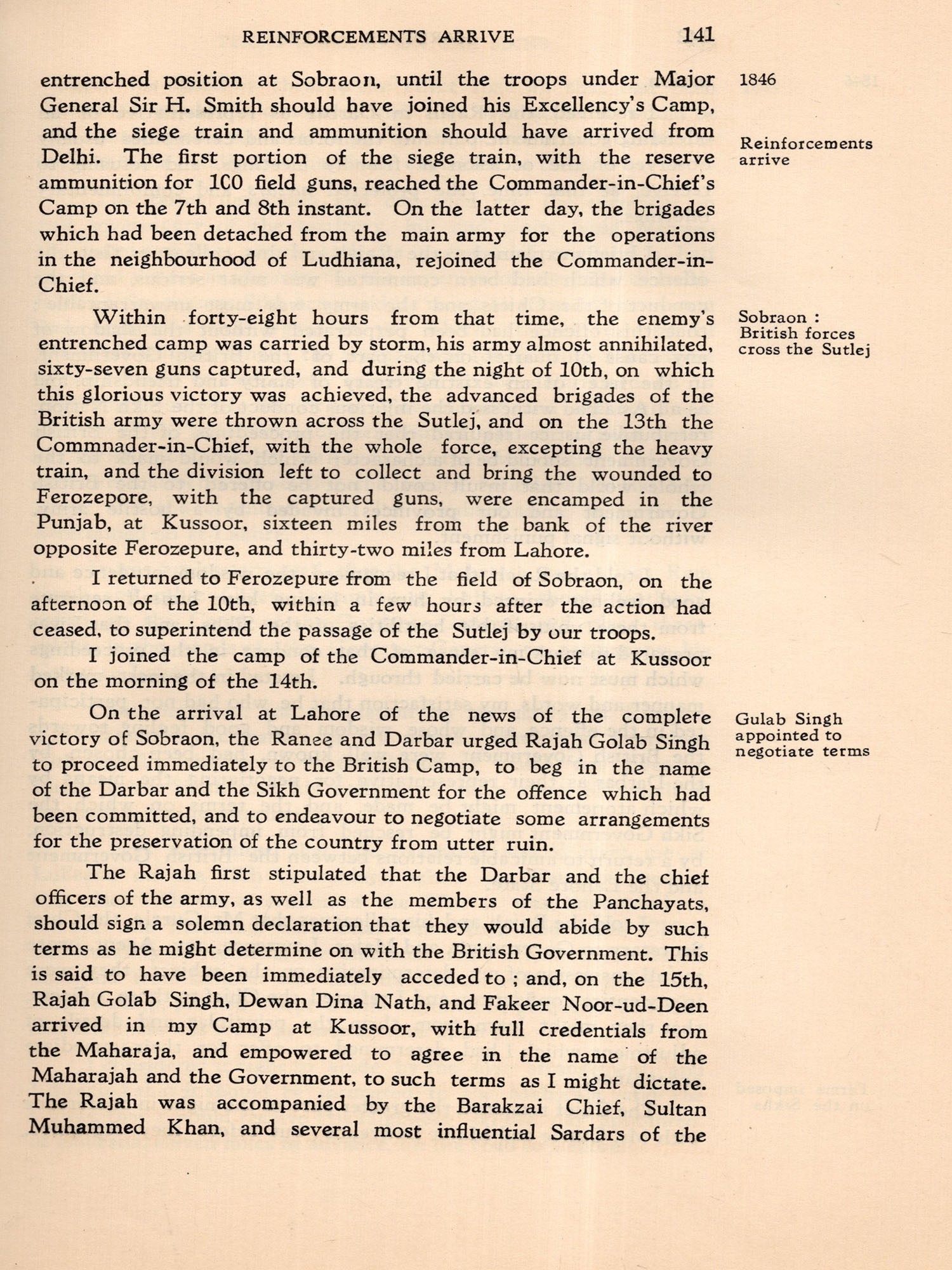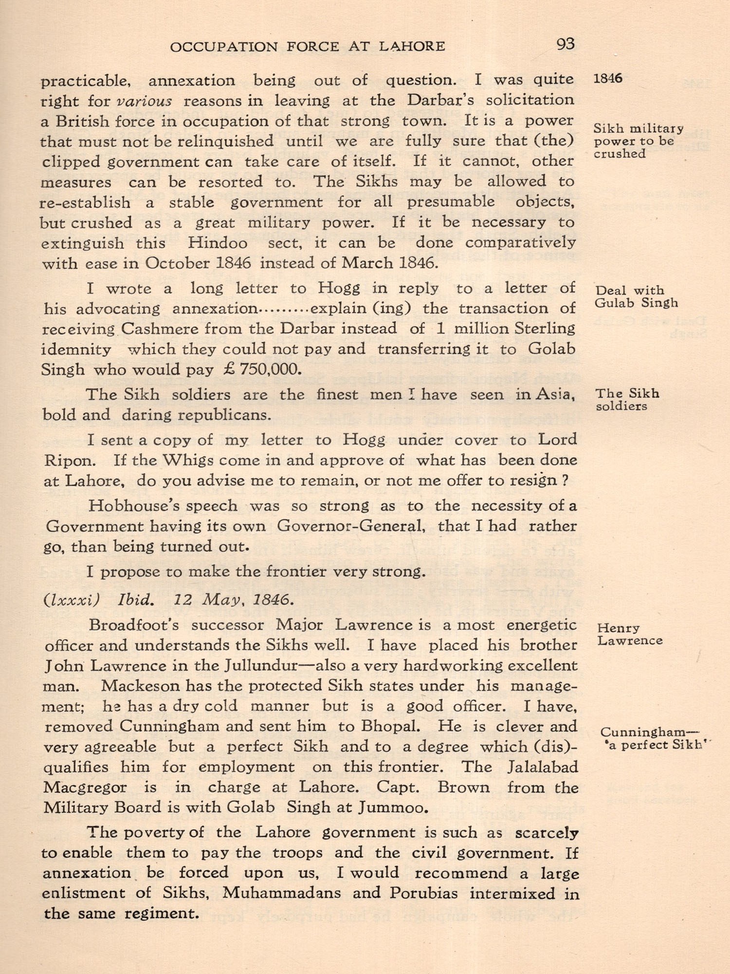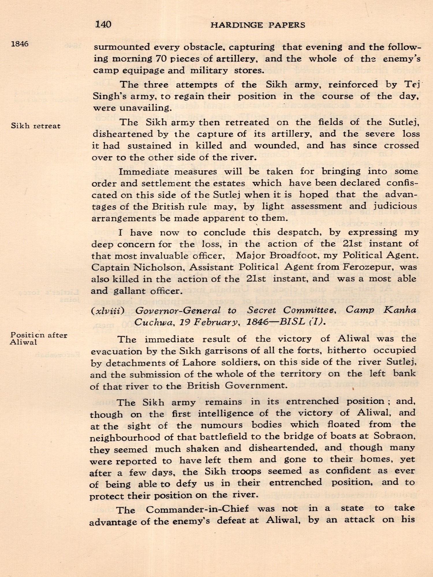 Selections from Hardinge's Private Papers (Book III) unfold the real story of the first Sikh War. They disclose that his scrupulous avoidance of the annexation of the Punjab in 1846 aimed at the utter annihilation of Sikh military and political power. His claim, however, proved illusory; and his "political experiment" in the Punjab failed, as is evidenced by the subsequent events. That his Punjab policy was vehemently opposed at home by the Whig Opposition and brazenly winked at by Peel's Government, is evidenced by his sardonic comment: "I had rather go than be turned out !"