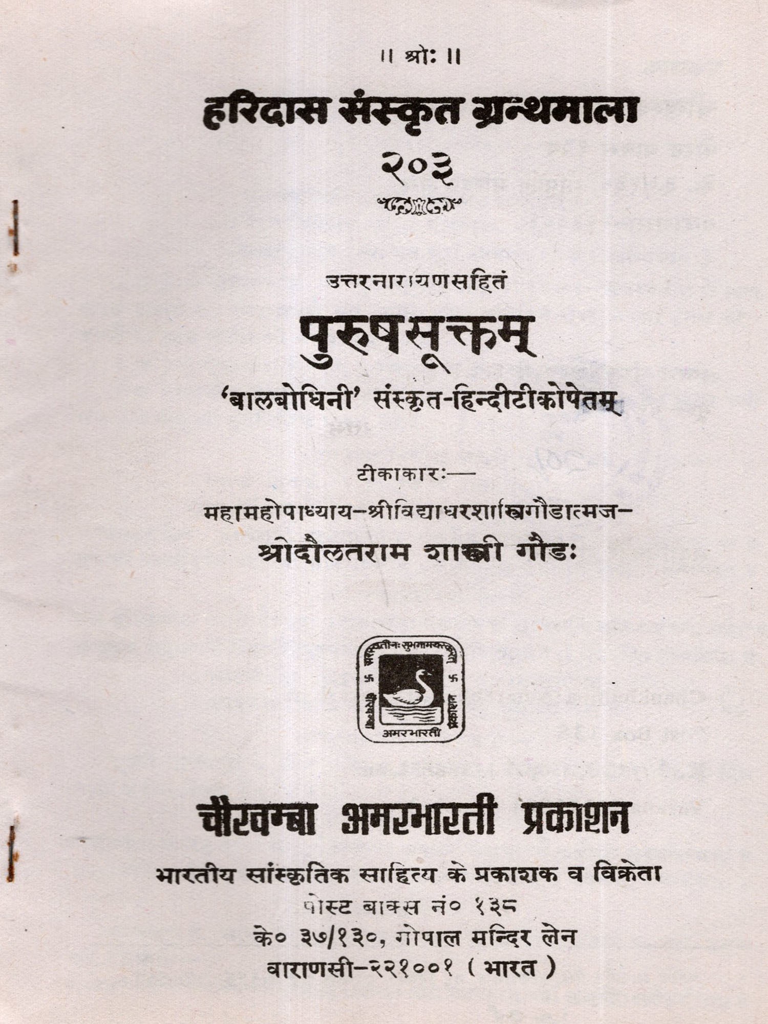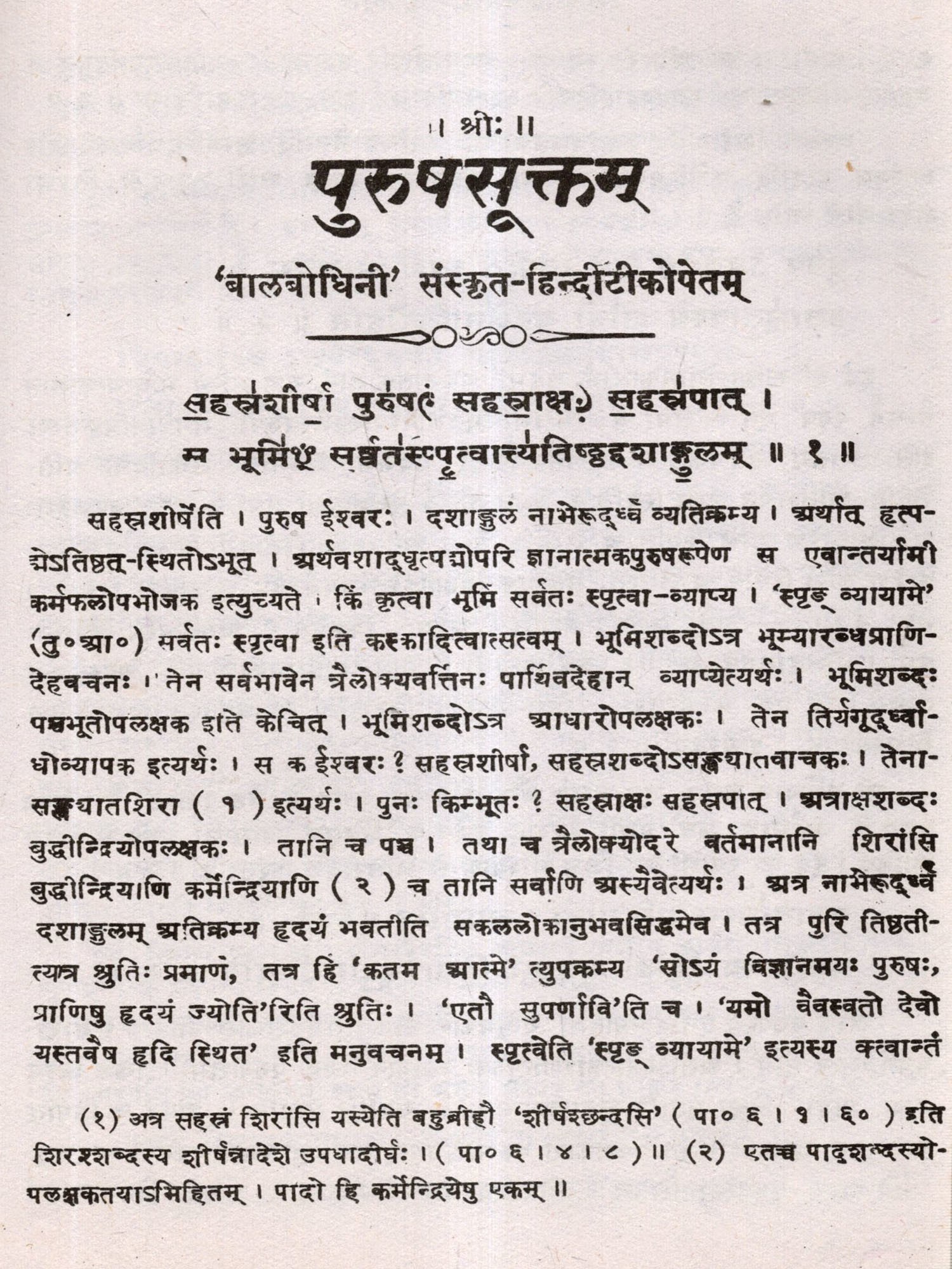 पुरुषसूक्तम्: Purusha Suktam- Balabodhini' with Sanskrit-Hindi Commentary (An Old and Rare Book)