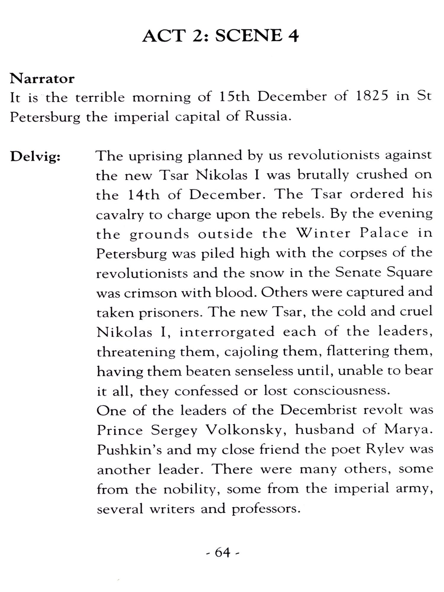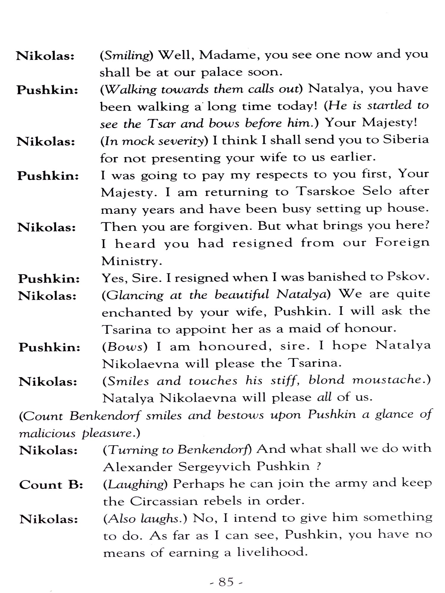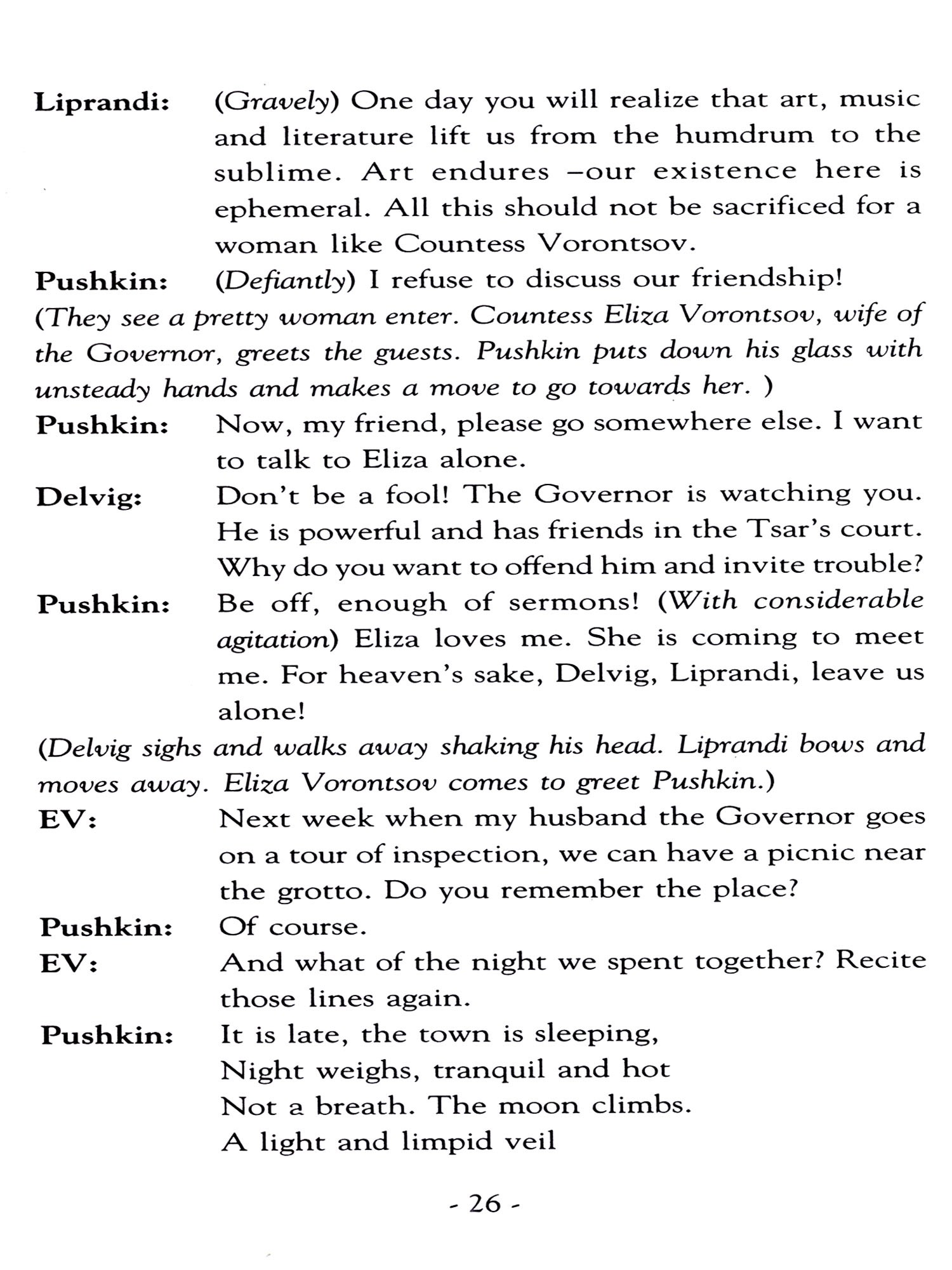 This play poignantly recreates Pushkin's turbulent life, his struggle with himself, his love for Marya Raevsky, and finally his death in a duel with his wife's alleged lover.