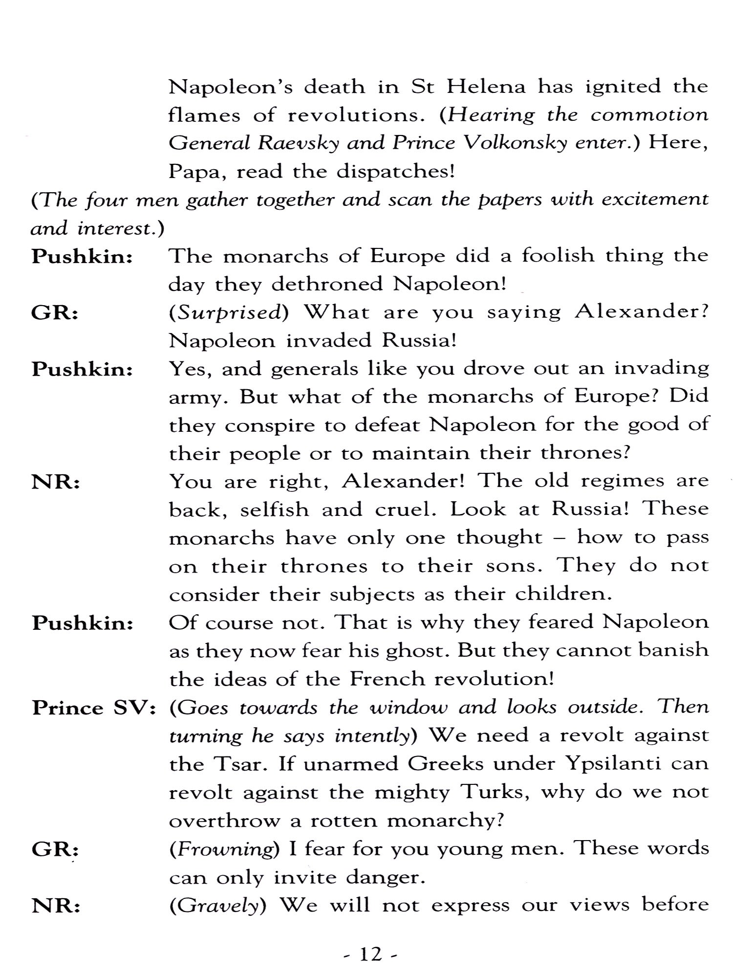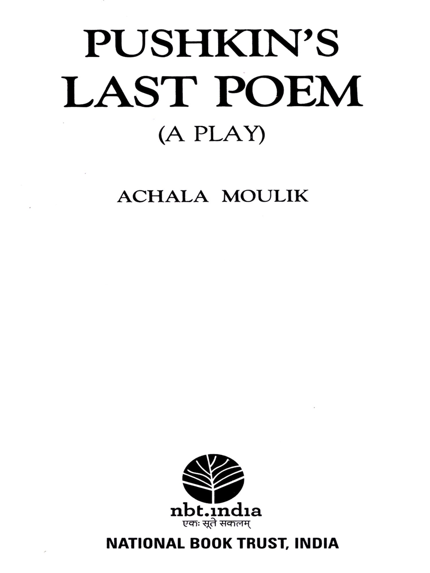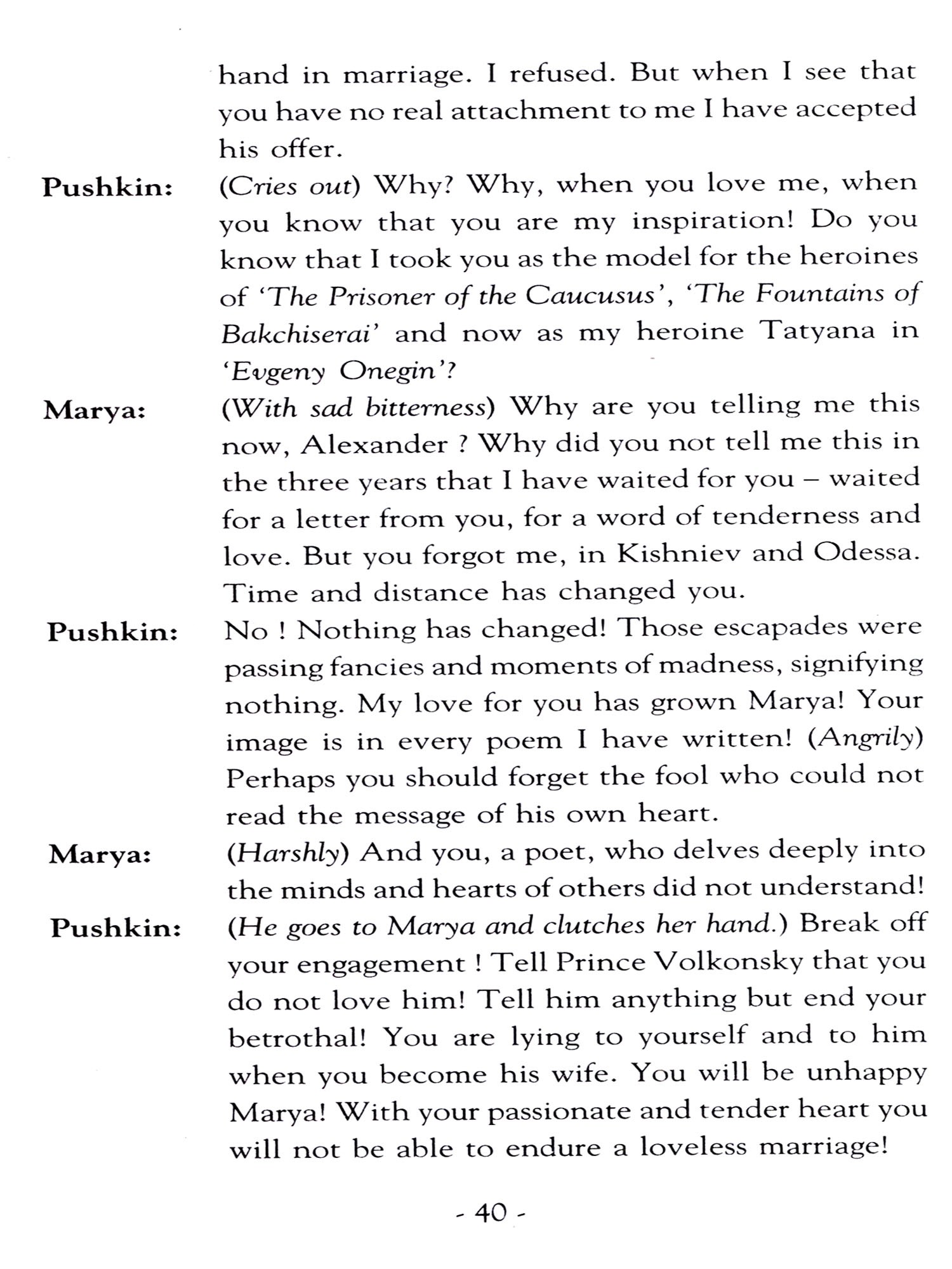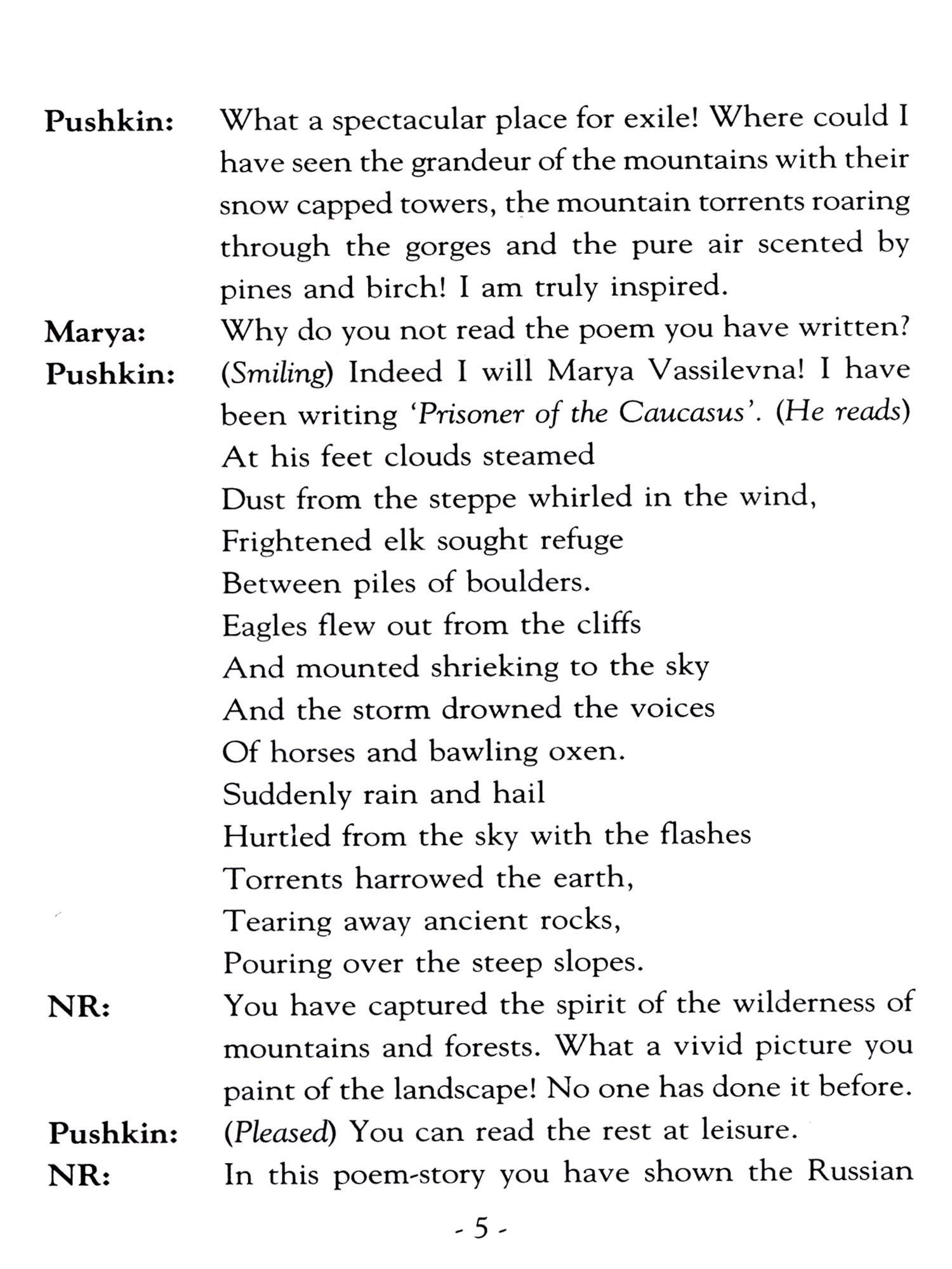 This play poignantly recreates Pushkin's turbulent life, his struggle with himself, his love for Marya Raevsky, and finally his death in a duel with his wife's alleged lover.