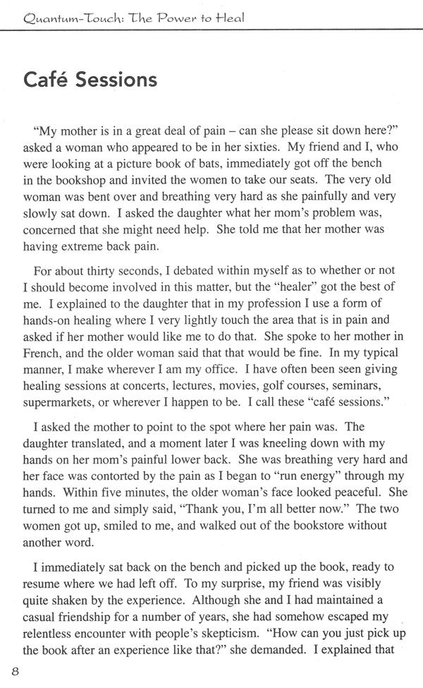 Quantum-Touch represents a major breakthrough in the art of hands-on healing. Whether you are a complete novice, a professional chiropractor, physical therapist, body worker, healer, or other health professional, Quantum-Touch allows you a dimension of power in your work that heretofore has not seemed possible.