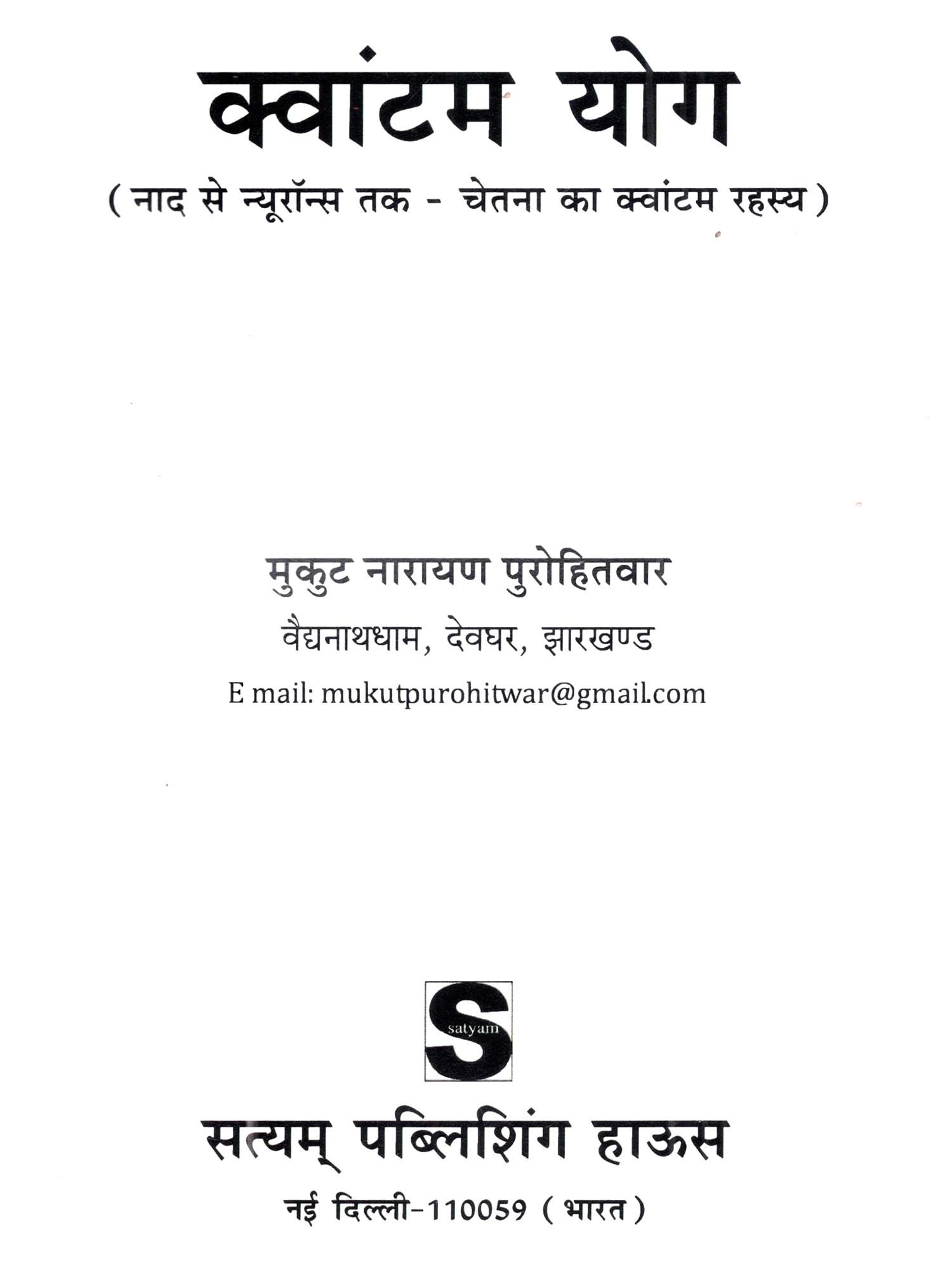 मुकुट नारायण पुरोहितवार वैद्यनाथधाम, देवघर (झारखण्ड) मुकुट नारायण पुरोहितवार ने भौतिक विज्ञान में स्नातकोत्तर (M. Sc. Physics) में शिक्षा प्राप्त की है और सैद्धांतिक भौतिकी व बांटम मेकानिक्स में गहरे अध्ययनकर्ता हैं। वे भारतीय ज्ञान परंपरा और विज्ञान के बीच संवाद स्थापित करने और समन्वय स्थापित करने में विशेष रुचि रखते हैं। संस्कृत भाषा और भारतीय जान परंपरा के संरक्षण एवं समर्थन में इनकी सक्रिय भूमिका रही है। चेतना के रहस्यों को समझने की उनकी जिज्ञासा ने उन्हें क्वांटम योग की रचना के लिए प्रेरित किया - एक ऐसी कृति जो योग, न्यूरोसाइंस और क्वांटम फिजिक्स की अंतर्धाराओं को एकीकृत दृष्टिकोण में प्रस्तुत करती है।